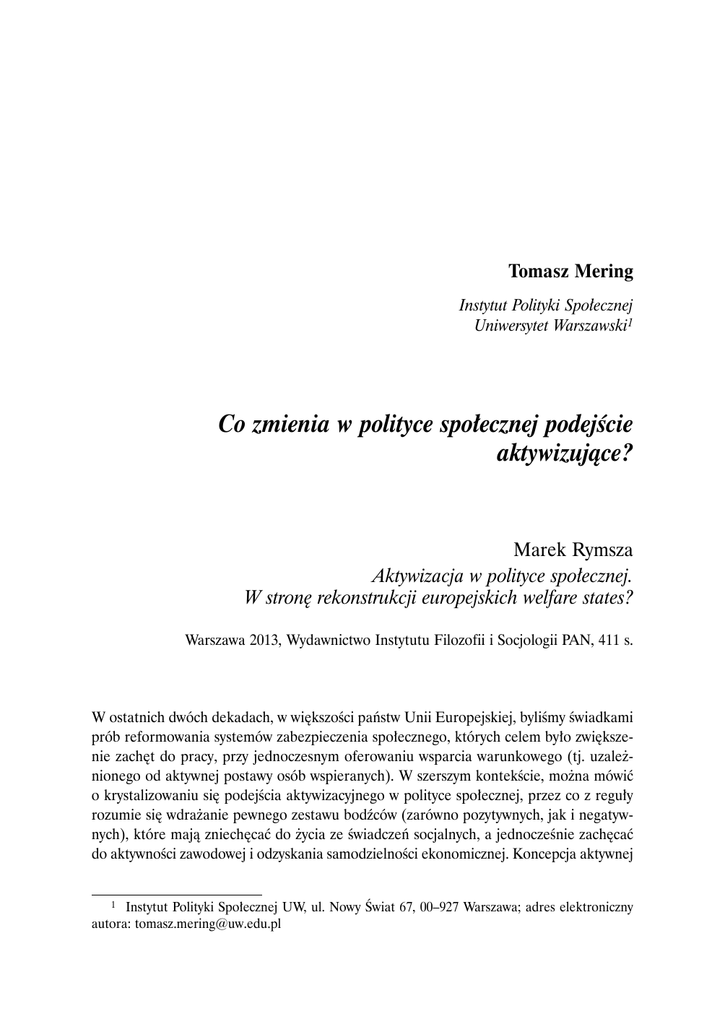 Tomasz Mering Instytut Polityki Społecznej Uniwersytet Warszawski1 Co zmienia w polityce społecznej podejście aktywizujące? Marek Rymsza Aktywizacja w polityce społecznej. W stronę rekonstrukcji europejskich welfare states? Warszawa 2013, Wydawnictwo Instytutu Filozofii i Socjologii PAN, 411 s. W ostatnich dwóch dekadach, w większości państw Unii Europejskiej, byliśmy świadkami prób reformowania systemów zabezpieczenia społecznego, których celem było zwiększenie zachęt do pracy, przy jednoczesnym oferowaniu wsparcia warunkowego (tj. uzależnionego od aktywnej postawy osób wspieranych). W szerszym kontekście, można mówić o krystalizowaniu się podejścia aktywizacyjnego w polityce społecznej, przez co z reguły rozumie się wdrażanie pewnego zestawu bodźców (zarówno pozytywnych, jak i negatywnych), które mają zniechęcać do życia ze świadczeń socjalnych, a jednocześnie zachęcać do aktywności zawodowej i odzyskania samodzielności ekonomicznej. Koncepcja aktywnej Instytut Polityki Społecznej UW, ul. Nowy Świat 67, 00–927 Warszawa; adres elektroniczny autora: [email protected] 1 172 Recenzje polityki społecznej doczekała się bogatej literatury przedmiotu (w Polsce rozwijanej od mniej więcej dziesięciu lat), której twórcy poszukiwali podstaw ideologicznych nowego nurtu, wskazywali na meandry pojęciowe, które utrudniają jego definicję i toczyli spory o granice aktywizacji. Publikacja Marka Rymszy jest pogłębionym i wielodyscyplinarnym studium rozwoju podejścia aktywizacyjnego w polityce społecznej (wprawdzie autor uwzględnia przede wszystkim perspektywę socjologiczną, jednak w książce znajdują się odniesienia do innych dziedzin – w tym do nauki o polityce społecznej). Książka z jednej strony syntetyzuje krajowy i międzynarodowy dorobek w tym zakresie, z drugiej strony jest ważnym głosem autora w toczącej się dyskusji na temat aktywnej polityki społecznej i reform państw dobrobytu. Ramy analityczne publikacji wyznacza teoria konwergencji, sformułowana przez twórców pierwszej fazy badań nad powstaniem i rozwojem systemów zabezpieczenia społecznego w Europie Zachodniej. Odwołując się do jej podstawowych założeń, zgodnie z którymi na przełomie XIX i XX w. w Europie pojawiło się funkcjonalne zapotrzebowanie na welfare states (na skutek postępującej w okresie rewolucji przemysłowej industrializacji i urbanizacji), autor szuka odniesień do sytuacji współczesnej, podkreślając, że na przełomie XX i XXI w. zaistniała potrzeba zasadniczej przebudowy państw dobrobytu. Strukturalne czynniki przemawiające za nową konwersją to: postępująca globalizacja (która osłabia regulacyjną funkcję państw), procesy demograficzne (starzenie się społeczeństw) oraz – jak sugeruje autor – ostatni kryzys gospodarczy. Konieczność dokonania tych przekształceń nie jest dla autora dowodem na niepowodzenia państwa dobrobytu, które zgodnie z poglądami neoliberalnymi powinny doprowadzić do jego demontażu (a przynajmniej – daleko idącej deregulacji). Idąc raczej za niemieckim socjologiem Niklasem Luhmannem, Rymsza uznaje, że kryzys państwa bezpieczeństwa socjalnego jest nieunikniony, jednak nie świadczy on o błędach w koncepcji welfare state, lecz dowodzi tezy przeciwnej: państwo bezpieczeństwa socjalnego wyczerpało swoje możliwości rozwojowe właśnie dlatego, że okazało się skuteczne w pełnieniu swojej funkcji kompensacyjnej. Luhmann zauważył, że programy socjalne, podejmowane w celu ochrony jednostek na wolnym rynku, dawały też skutki uboczne, którym państwo bezpieczeństwa socjalnego – jako system samoreferencyjny – próbowały przeciwdziałać za pomocą następnych programów kompensacyjnych. Problem polega na tym, że istnienie tych skutków społecznych doprowadziło do społecznej delegitymizacji systemu (obywatele w dalszym ciągu chcą korzystać z rozbudowanej ochrony socjalnej, jednak w mniejszym stopniu są skłonni ją finansować). W tym kontekście konieczna jest zasadnicza przebudowa państw dobrobytu, której logikę wyznacza m.in. koncepcja aktywnej polityki społecznej. Według Marka Rymszy to właśnie możliwość legitymizacji podstawowych założeń koncepcji aktywnej polityki społecznej z różnych perspektyw ideologicznych jest siłą nurtu aktywizacji w polityce społecznej – który umożliwia budowanie wokół niego nowego europejskiego konsensu (s. 57). Zgadzając się z autorem, należy jednocześnie podkreślić, że poparcie dla koncepcji aktywizacji w polityce społecznej nie jest dane raz na zawsze. Problemem może być znaczna skala nadużyć, jakie mogą się pojawić w przypadku prowadzenia polityki opar- Recenzje 173 tej na wsparciu warunkowym. Dobrą ilustracją tego zjawiska jest wyłudzanie świadczeń, które miało miejsce w Wielkiej Brytanii w okresie rządów Partii Pracy. Sytuacja ta nie doprowadziła wprawdzie do odejścia od paradygmatu aktywizacji w brytyjskiej polityce społecznej za rządów konserwatystów, ale skłoniła gabinet Davida Camerona do podjęcia prób uszczelnienia systemu wypłat świadczeń społecznych. Wnioski wysnute przez Marka Rymszę w rozdziale pierwszym wskazują, że teoria konwergencji może być przydatna przy analizowaniu współczesnych przekształceń państw typu welfare state. Warto jednocześnie podkreślić, że czynniki strukturalne oddziaływają na współczesne państwa europejskie w sposób nierównomierny (przykładowo, chociaż proces starzenia się społeczeństw występuje na całym kontynencie, to prognozy demograficzne dla Polski na najbliższe 40 lat są bardzo niekorzystne na tle innych krajów naszego regionu). Podobnie, w nierównomiernym stopniu oddziałują procesy globalizacyjne, co było szczególnie widoczne w bardzo różnych wynikach funkcjonowania rynków pracy w okresie światowego kryzysu gospodarczego i finansowego (np. w Niemczech i państwach Europy Południo