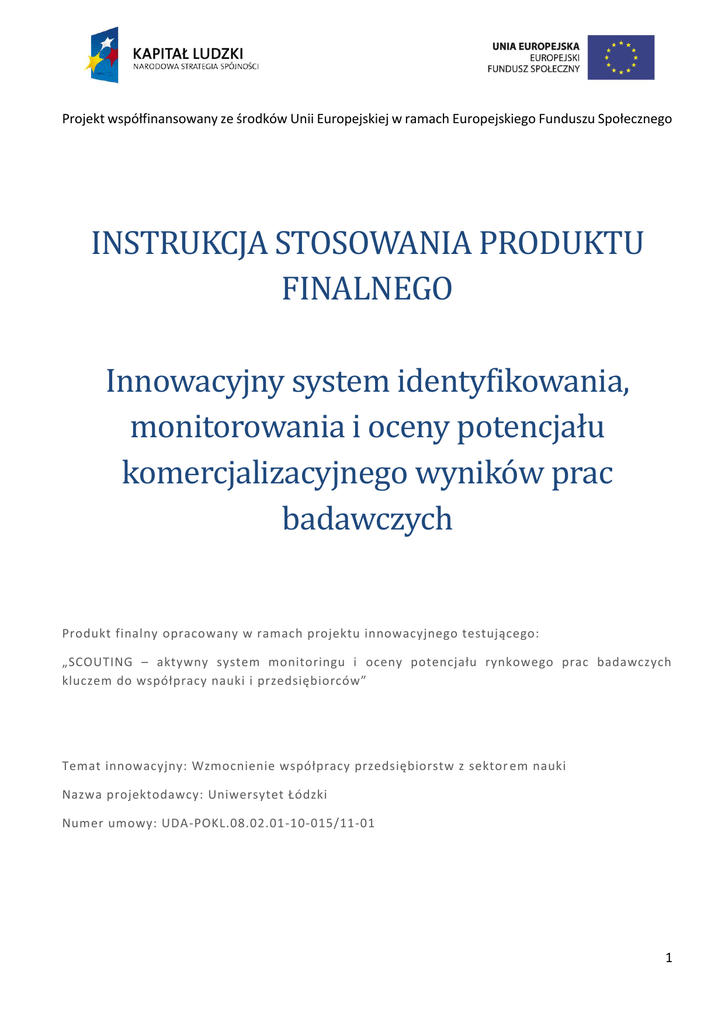 Projekt współfinansowany ze środków Unii Europejskiej w ramach Europejskiego Funduszu Społecznego INSTRUKCJA STOSOWANIA PRODUKTU FINALNEGO Innowacyjny system identyfikowania, monitorowania i oceny potencjału komercjalizacyjnego wynikow prac badawczych Produkt finalny opracowany w ramach projektu innowacyjnego testującego: „SCOUTING – aktywny system monitoringu i oceny potencjału rynkowego prac badawczych kluczem do współpracy nauki i przedsiębiorców” Temat innowacyjny: Wzmocnienie współpracy przedsiębiorstw z sektor em nauki Nazwa projektodawcy: Uniwersytet Łódzki Numer umowy: UDA-POKL.08.02.01-10-015/11-01 1 Projekt współfinansowany ze środków Unii Europejskiej w ramach Europejskiego Funduszu Społecznego WPROWADZENIE Scouting to innowacyjne rozwiązanie na rzecz identyfikacji, monitoringu i oceny potencjału prac badawczych oraz składników wiedzy powstających w uczelniach wyższych. Polega na wprowadzeniu do struktur organizacyjnych uczelni wyspecjalizowanych stanowisk oraz formalnego ich umocowania. Stanowiska te zajmowane są przez osoby wyspecjalizowane w danej dziedzinie naukowej oraz posiadające przygotowanie merytoryczne do oceny potencjału komercyjnego badań, tzw. scoutów. Scouci odpowiedzialni są za zbieranie informacji o pracach naukowo-badawczych, wstępną ocenę ich potencjału do komercjalizacji oraz nawiązywanie kontaktów z światem biznesu. Produktem finalnym jest Innowacyjny system identyfikowania, monitorowania i oceny potencjału komercjalizacyjnego wyników prac badawczych. Produkt odpowiada na problem niskiej współpracy sektora nauki z sektorem gospodarki, co prowadzi do niskiej innowacyjności polskich przedsiębiorstw. Szerzej, przyczyny tej niekorzystnej można sformułować następująco: 1) Uczelnie stosują nieefektywne formy identyfikacji i monitoringu wiedzy i technologii: a) specyfika funkcjonowania uczelni wyższej w kontekście jej potencjału komercjalizacji wiedzy wiąże się z dużym rozproszeniem informacji o wiedzy i technologiach, które mogą być w różny sposób komercjalizowane. b) problemy uczelni związane m.in. z (i) niewielkim stopniem otwartości środowiska naukowego na współpracę i dzielenie się wiedzą, (ii) brak stałego systemu pozyskiwania informacji, polegającego często na zgłoszeniach ze strony kadry akademickiej (co stoi w sprzeczności z poprzednim punktem), (iii) mało efektywny system pozyskiwania i udostępniania informacji, odnoszący się do niskiej efektywności stosowanych baz danych. 2) Funkcjonujący na uczelniach system współpracy z przedsiębiorstwami nie posiada wystarczającego potencjału kadrowego w zakresie komercjalizacji wiedzy i transferu technologii. 3) Niska skuteczność funkcjonujących uczelnianych systemów w zakresie zdobywania wiedzy dot. posiadanego potencjału komercyjnego wiedzy. 4) Uczelnie stosują mechanizmy utrudniające proces komercjalizacji wiedzy, co niekorzystnie wpływa na potencjał komercjalizacji wiedzy i transferu technologii. 5) Niedostateczna ochrona wiedzy spowodowana m.in. przez brak oceny wartości rynkowej efektów badań: Głównym celem wprowadzenia innowacji jest podniesienie zdolności uczelni w zakresie współpracy z przedsiębiorcami poprzez wypracowanie innowacyjnego systemu identyfikowania, monitorowania i oceny potencjału komercjalizacyjnego wyników prac badawczych (skrót: ISMiO), opartego na doświadczeniach partnerów ponadnarodowych. 2 Projekt współfinansowany ze środków Unii Europejskiej w ramach Europejskiego Funduszu Społecznego Wdrożenie produktu finalnego wymaga wdrożenia następujących jego komponentów: 1) EDUKACYJNEGO – przygotowanie kandydatów na scoutów poprzez Podyplomowe Studium Ocena Potencjału Rynkowego Prac Badawczych, 2) SYSTEMOWEGO, którym jest Innowacyjny model scoutingu w wymiarze systemowym, składający się z następujących komponentów: a) Modelu ogólnego, b) Modelu szczegółowego. Wdrożenie sieci scoutów technologicznych w strukturę uczelni wyższej wymaga pozyskania do roli scoutów odpowiednich kandydatów, formalnego ich osadzenia w strukturze uczelni oraz zarządzania siecią scoutów podczas ich działalności. Poza pewnymi osobowościowymi predyspozycjami, osoba socuta musi także odebrać formalne merytoryczne przygotowanie. W przypadku braku kadr o odpowiednim przygotowaniu merytorycznym, konieczne jest ukończenie przez kandydata na scouta Studium podyplomowego z zakresu oceny potencjału rynkowego prac badawczych. W warunkach polskich należy założyć, iż krok ten jest niezbędny z powodu braku odpowiednio przygotowanych kadr w polskich uczelniach wyższych. Wobec powyższego, innowacyjny system identyfikowania, monitorowania i oceny potencjału komercjalizacyjnego wyników prac badawczych obejmuje przygotowaną kompleksową propozycję studium podyplomowego Ocena potencjału rynkowego prac badawczych oraz innowacyjny model scoutingu w wymiarze systemowym – komponentu niezbędnego dla poprawnego wprowadzenia sieci scoutów do uczelni wyższej. 3 Projekt współfinansowany ze środków Unii Europejskiej w ramach Europejskiego Funduszu Społecznego ODBIORCY I UŻYTKOWNICY PRODUKTU – KRYTERIA DOSTĘPU ODBIORCY I UŻYTKOWNICY Odbiorcami produktu są: a. pracownicy szkół wyższych, łącznie ok.7554 pracowników naukowych i naukowo-dydaktycznych w regionie i 101627 w kraju; słuchacze studiów doktoranckich regionu łódzkiego zamieszkujący bądź zatrudnieni na terenie województwa – 2754 osób,a 36761 w skali kraju, b. przedsiębiorstwa – w regionie łódzkim łącznie 230908 i 3747595 podmiotów gospodarczych w Polsce. Użytkownikami produktu są: Uczelnie, w tym w regionie łódzkim: Uniwersytet Łódzki, Politechnika Łódzka, Uniwersytet Medyczny, Akademia Sztuk Pięknych, Państwowa Wyższa Szkoła Filmowa Telewizyjna i Teatralna, Akademia Muzyczna. Łącznie jest to 6 uczelni wyższych w skali regionu i 60 uczelni w kraju (zidentyfikowanych jako p