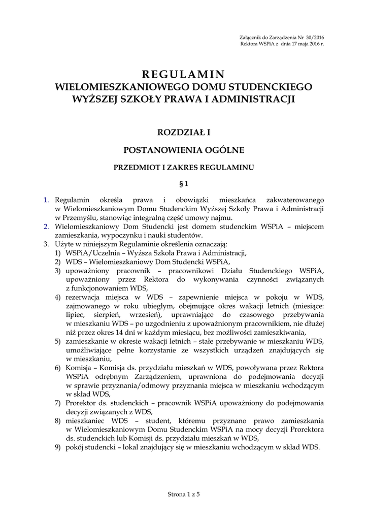 Załącznik do Zarządzenia Nr 30/2016 Rektora WSPiA z dnia 17 maja 2016 r. REGULAMIN WIELOMIESZKANIOWEGO DOMU STUDENCKIEGO WYŻSZEJ SZKOŁY PRAWA I ADMINISTRACJI ROZDZIAŁ I POSTANOWIENIA OGÓLNE PRZEDMIOT I ZAKRES REGULAMINU §1 1. Regulamin określa prawa i obowiązki mieszkańca zakwaterowanego w Wielomieszkaniowym Domu Studenckim Wyższej Szkoły Prawa i Administracji w Przemyślu, stanowiąc integralną część umowy najmu. 2. Wielomieszkaniowy Dom Studencki jest domem studenckim WSPiA – miejscem zamieszkania, wypoczynku i nauki studentów. 3. Użyte w niniejszym Regulaminie określenia oznaczają: 1) WSPiA/Uczelnia – Wyższa Szkoła Prawa i Administracji, 2) WDS – Wielomieszkaniowy Dom Studencki WSPiA, 3) upoważniony pracownik – pracownikowi Działu Studenckiego WSPiA, upoważniony przez Rektora do wykonywania czynności związanych z funkcjonowaniem WDS, 4) rezerwacja miejsca w WDS – zapewnienie miejsca w pokoju w WDS, zajmowanego w roku ubiegłym, obejmujące okres wakacji letnich (miesiące: lipiec, sierpień, wrzesień), uprawniające do czasowego przebywania w mieszkaniu WDS – po uzgodnieniu z upoważnionym pracownikiem, nie dłużej niż przez okres 14 dni w każdym miesiącu, bez możliwości zamieszkiwania, 5) zamieszkanie w okresie wakacji letnich – stałe przebywanie w mieszkaniu WDS, umożliwiające pełne korzystanie ze wszystkich urządzeń znajdujących się w mieszkaniu, 6) Komisja – Komisja ds. przydziału mieszkań w WDS, powoływana przez Rektora WSPiA odrębnym Zarządzeniem, uprawniona do podejmowania decyzji w sprawie przyznania/odmowy przyznania miejsca w mieszkaniu wchodzącym w skład WDS, 7) Prorektor ds. studenckich – pracownik WSPiA upoważniony do podejmowania decyzji związanych z WDS, 8) mieszkaniec WDS – student, któremu przyznano prawo zamieszkania w Wielomieszkaniowym Domu Studenckim WSPiA na mocy decyzji Prorektora ds. studenckich lub Komisji ds. przydziału mieszkań w WDS, 9) pokój studencki – lokal znajdujący się w mieszkaniu wchodzącym w skład WDS. Strona 1 z 5 ROZDZIAŁ II POSTANOWIENIA SZCZEGÓŁOWE ZAKWATEROWANIE W WIELOMIESZKANIOWYM DOMU STUDENCKIM §2 1. Miejsce w Wielomieszkaniowym Domu Studenckim przyznawane jest przez Komisję ds. przydziału mieszkań w Wielomieszkaniowym Domu Studenckim w Rzeszowie Wyższej Szkoły Prawa i Administracji w Przemyślu, powołaną przez Rektora WSPiA, zwanej dalej Komisją, na okres roku akademickiego tj. od 1 października do 30 czerwca. 2. Od decyzji Komisji przysługuje odwołanie do Rektora WSPiA. 3. W uzasadnionych przypadkach – na wniosek studenta – Komisja może wydać zezwolenie na zamieszkanie w mieszkaniu studenckim także w innym terminie, ściśle określając czasokres i zasady pobytu. 4. Student zamieszkuje w pokoju, w którym został zakwaterowany. 5. Zmiana miejsca zakwaterowania może nastąpić na wniosek studenta lub upoważnionego pracownika – na podstawie decyzji Komisji. 6. Zmiana wyposażenia pokoju wymaga zgody Kierownika WDS. 7. Zakwaterowany student odpowiada materialnie za wszystkie szkody powstałe w mieszkaniu studenckim z przyczyn występujących po stronie studenta. PRAWA MIESZKAŃCÓW WIELOMIESZKANIOWEGO DOMU STUDENCKIEGO §3 Mieszkaniec Wielomieszkaniowego Domu Studenckiego ma prawo do: 1) korzystania ze wszystkich urządzeń przeznaczonych do ogólnego użytku, a znajdujących się na terenie mieszkania studenckiego, 2) przyjmowania gości na terenie Wielomieszkaniowego Domu Studenckiego z uwzględnieniem zasad określonych w niniejszym Regulaminie, 3) opuszczania i powrotu do Wielomieszkaniowego Domu Studenckiego o dowolnej porze, 4) organizowania spotkań towarzyskich na terenie mieszkania studenckiego, przestrzegając zasad zawartych w niniejszym Regulaminie, 5) rezerwacji pokoju/miejsca w pokoju w okresie wakacji letnich na następny rok akademicki, 6) zamieszkania w pokoju studenckim w okresie wakacji letnich. Strona 2 z 5 OBOWIĄZKI MIESZKAŃCÓW WIELOMIESZKANIOWEGO DOMU STUDENCKIEGO §4 1. Mieszkaniec Wielomieszkaniowego Domu Studenckiego ma obowiązek: 1) podporządkować się decyzjom upoważnionego pracownika WSPiA, 2) zachować ciszę nocną w godz. od 2200 do 700, 3) szanować mienie znajdujące się w mieszkaniu studenckim i jego otoczeniu, oraz przeciwdziałać niewłaściwemu stosunkowi do niego, 4) przestrzegać Regulaminu porządku domowego obowiązującego w budynku, w którym znajduje się mieszkanie studenckie, 5) utrzymywać pokój, łazienkę, wc, balkon oraz inne pomieszczenia ogólnego użytku w czystości i porządku, 6) przestrzegać przepisy BHP i PPOŻ, 7) wnosić opłaty bez wezwań z tytułu zamieszkania w mieszkaniu studenckim, najpóźniej do 5-go dnia danego miesiąca (z wyjątkiem miesiąca października, za który opłata powinna być wniesiona do 15-go października), 8) niezwłocznie zgłaszać upoważnionemu pracownikowi wszelkie zauważone usterki i zniszczenia. 2. Mieszkańcowi Wielomieszkaniowego Domu Studenckiego zabrania się: 1) wytwarzania, posiadania, przechowywania, używania narkotyków, środków odurzających, dopalaczy, substancji psychotropowych itp., 2) posiadania składników, które mogą być podstawą do wytwarzania środków odurzających oraz innych niedozwolonych produktów i przedmiotów, 3) przebywania w mieszkaniu studenckim w stanie nietrzeźwym, pod wpływem narkotyków, dopalaczy, substancji psychotropowych itp., 4) dopuszczenia do przebywania w mieszkaniu osób w stanie nietrzeźwym, pod wpływem narkotyków, środków odurzających, dopalaczy, substancji psychotropowych itp. osób posiadających, handlujących, udostępniających narkotyki, środki odurzające, dopalacze, substancje psychotropowe itp. lub nakłaniających do używania narkotyków, środków odurzających, dopalaczy, substancji psychotropowych itp., 5) udzielania noclegów w pokoju osobom, niebędącym mieszkańcami danego mieszkania studenckiego bez zgody upoważnionego pracownika, 6) odstępowania i 