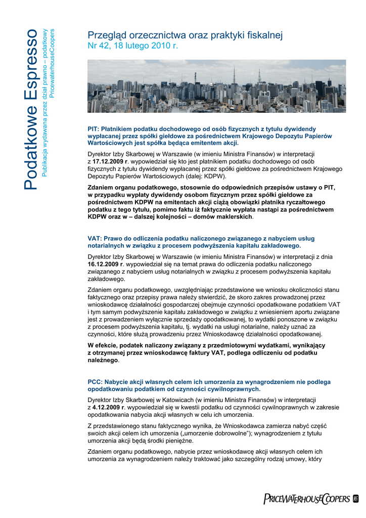 Publikacja wydawana przez dział prawno – podatkowy PricewaterhouseCoopers Podatkowe Espresso Przegląd orzecznictwa oraz praktyki fiskalnej Nr 42, 18 lutego 2010 r. PIT: Płatnikiem podatku dochodowego od osób fizycznych z tytułu dywidendy wypłacanej przez spółki giełdowe za pośrednictwem Krajowego Depozytu Papierów Wartościowych jest spółka będąca emitentem akcji. Dyrektor Izby Skarbowej w Warszawie (w imieniu Ministra Finansów) w interpretacji z 17.12.2009 r. wypowiedział się kto jest płatnikiem podatku dochodowego od osób fizycznych z tytułu dywidendy wypłacanej przez spółki giełdowe za pośrednictwem Krajowego Depozytu Papierów Wartościowych (dalej: KDPW). Zdaniem organu podatkowego, stosownie do odpowiednich przepisów ustawy o PIT, w przypadku wypłaty dywidendy osobom fizycznym przez spółki giełdowe za pośrednictwem KDPW na emitentach akcji ciążą obowiązki płatnika ryczałtowego podatku z tego tytułu, pomimo faktu iż faktycznie wypłata nastąpi za pośrednictwem KDPW oraz w – dalszej kolejności – domów maklerskich. VAT: Prawo do odliczenia podatku naliczonego związanego z nabyciem usług notarialnych w związku z procesem podwyższenia kapitału zakładowego. Dyrektor Izby Skarbowej w Warszawie (w imieniu Ministra Finansów) w interpretacji z dnia 16.12.2009 r. wypowiedział się na temat prawa do odliczenia podatku naliczonego związanego z nabyciem usług notarialnych w związku z procesem podwyższenia kapitału zakładowego. Zdaniem organu podatkowego, uwzględniając przedstawione we wniosku okoliczności stanu faktycznego oraz przepisy prawa należy stwierdzić, że skoro zakres prowadzonej przez wnioskodawcę działalności gospodarczej obejmuje czynności opodatkowane podatkiem VAT i tym samym podwyższenie kapitału zakładowego w związku z wniesieniem aportu związane jest z prowadzeniem wyłącznie sprzedaży opodatkowanej, to wydatki ponoszone w związku z procesem podwyższenia kapitału, tj. wydatki na usługi notarialne, należy uznać za czynności, które służą prowadzeniu przez Wnioskodawcę działalności opodatkowanej. W efekcie, podatek naliczony związany z przedmiotowymi wydatkami, wynikający z otrzymanej przez wnioskodawcę faktury VAT, podlega odliczeniu od podatku należnego. PCC: Nabycie akcji własnych celem ich umorzenia za wynagrodzeniem nie podlega opodatkowaniu podatkiem od czynności cywilnoprawnych. Dyrektor Izby Skarbowej w Katowicach (w imieniu Ministra Finansów) w interpretacji z 4.12.2009 r. wypowiedział się w kwestii podatku od czynności cywilnoprawnych w zakresie opodatkowania nabycia akcji własnych w celu ich umorzenia. Z przedstawionego stanu faktycznego wynika, że Wnioskodawca zamierza nabyć część swoich akcji celem ich umorzenia („umorzenie dobrowolne”); wynagrodzeniem z tytułu umorzenia akcji będą środki pieniężne. Zdaniem organu podatkowego, nabycie przez wnioskodawcę akcji własnych celem ich umorzenia za wynagrodzeniem należy traktować jako szczególny rodzaj umowy, który nie został wymieniony w ustawowym katalogu czynności podlegających opodatkowaniu podatkiem od czynności cywilnoprawnych. Tym samym – z powyższych przyczyn – transakcja nabycia przez wnioskodawcę akcji własnych celem ich umorzenia za wynagrodzeniem nie będzie podlegać opodatkowaniu ppc. CIT: Zdaniem DIS, wydatki na zakup prezentów (gadżetów) i towarów handlowych, przekazywanych w ramach prezentu są kosztem podatkowym, pod warunkiem, że… Dyrektor Izby Skarbowej w Warszawie (w imieniu Ministra Finansów) w interpretacji z dnia 15.12.2009 r. wypowiedział się w kwestii możliwości zaliczenia do kosztów uzyskania przychodu wydatków na zakup prezentów (gadżetów) z logo firmy oraz towarów handlowych przekazywanych w ramach prezentu, które nie spełniają definicji prezentu o małej wartości. Zdaniem organu podatkowego, wydatki ponoszone przez wnioskodawcę na gadżety, upominki, prezenty traktowane jako przedmioty niewielkiej wartości przekazywane klientom spółki z widocznym jej logo mogą być zaliczone do kosztów podatkowych na podstawie odpowiednich przepisów ustawy o podatku dochodowym od osób prawnych. Natomiast w przypadku przekazywania prezentów (gadżetów) z logo firmy oraz towarów handlowych, które nie spełniają definicji prezentu o małej wartości, należy uznać, iż celem wydatku będzie tworzenie pozytywnego wizerunku firmy i budowy relacji. Wydatki takie będą miały charakter reprezentacyjny – nie będą zatem stanowiły kosztów uzyskania przychodu. W przypadku pytań prosimy o kontakt z Tomaszem Misiakiem [email protected], tel: 22 523 4858, tel. kom.: 502 18 4858. Zapraszamy do udziału w seminariach podatkowych PricewaterhouseCoopers: 2 marca 2010 Wrocław Akcje marketingowe bez ryzyka podatkowego. Jak uniknąć pułapek? 3 marca 2010 Katowice Podatek VAT w 2010 roku. 18 marca 2010 Katowice Akcje marketingowe bez ryzyka podatkowego. Jak uniknąć pułapek? 18 maja 2010 Warszawa Akcje marketingowe bez ryzyka podatkowego. Jak uniknąć pułapek? Więcej informacji na www.taxonline.pl/seminaria. www.pwc.com.pl www.taxonline.pl Zastrzeżenie prawne: Przegląd orzecznictwa oraz praktyki fiskalnej ma jedynie charakter informacyjny i nie może stanowić jedynej podstawy do podejmowania działań. © 2010 PricewaterhouseCoopers Polska. Nazwa „PricewaterhouseCoopers” odnosi się do firm wchodzących w skład sieci PricewaterhouseCoopers International Limited, z których każda stanowi odrębny i niezależny podmiot prawny.