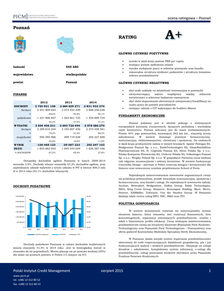 ocena ratingowa – Poznań Poznań RATING GŁÓWNE CZYNNIKI POZYTYWNE ludność 545 680 województwo wielkopolskie powiat Poznań GŁÓWNE CZYNNIKI NEGATYWNE FINANSE DOCHODY bieżące 2012 2 753 921 108 2 451 809 644 2013 2 664 639 271 2 473 454 439 2014 2 831 933 374 2 608 256 638 % 89,0% 92,8% 92,1% podatkowe 1 221 906 847 1 263 661 725 1 334 899 724 % 44,4% 47,4% 47,1% W YDATKI bieżące 2 854 406 231 2 259 810 244 2 693 726 494 2 194 007 456 2 578 686 270 2 273 458 581 % 79,2% 81,4% 88,2% majątkowe 594 595 986 499 719 038 305 227 690 % W YNIK DŁUG 20,8% 18,6% 11,8% -100 485 123 1 853 862 042 -29 087 223 1 849 544 049 253 247 103 1 636 387 436 67,3% 69,4% 57,8% % DOCHODÓW wysoki w skali kraju poziom PKB per capita malejący poziom zadłużenia miasta wysoka wydajność pracy w sektorze przemysłu oraz handlu różnorodna struktura wielkości podmiotów i struktura branżowa sektora przedsiębiorstw Dynamika dochodów ogółem Poznania w latach 2008-2014 wynosiła 3,5%. Dochody własne stanowiły 67,2% dochodów ogółem, przy największym udziale wpływów z tytułu udziału w PIT w kwocie 800,5 mln zł w 2014 roku (42,1% dochodów własnych). zbyt małe nakłady na działalność innowacyjną w przemyśle niewystarczający zakres współpracy między sektorem wytwórczości a sektorem badawczo-rozwojowym zbyt słabe dopasowanie oferowanych umiejętności/kwalifikacji na rynku pracy do potrzeb pracodawców malejące udziały z CIT wpływające do budżetu Miasta FUNDAMENTY EKONOMICZNE Poznań położony jest w obrębie jednego z ważniejszych europejskich korytarzy tranzytowych, łączących zachodnią i wschodnią część kontynentu. Poznań zaliczany jest do miast zurbanizowanych. Prawie 44% jego powierzchni, wynoszącej 262 km kw., stanowią tereny zabudowane. W mieście dominuje przemysł farmaceutyczny, motoryzacyjny, elektromaszynowy, chemiczny i spożywczy. Do czołowych w skali kraju producentów należą w swoich branżach: Apator Powogaz SA, Bridgestone Poznań Sp. z o.o., ExideTechnologies SA, GlaxoSmithKline Pharmaceuticals SA, H. Cegielski Poznań SA, Nivea Polska Sp. z o.o., Polska Kompania Piwowarska SA, Unilever Polska SA, Volkswagen Poznań Sp. z o.o., Wrigley Poland Sp. z o.o. W gospodarce Poznania coraz większą rolę odgrywa innowacyjność i sektory kreatywne. W mieście funkcjonuje Concordia Design – pierwsze w Polsce centrum designu i kreatywności dla biznesu oraz nowoczesna uczelnia projektowania School of Form. Największym zainteresowaniem inwestorów zagranicznych cieszy się produkcja przemysłowa, przede wszystkim motoryzacyjna, spożywcza i farmaceutyczna, oraz handel i usługi. Do największych inwestorów należą: Auchan, Beiersdorf, Bridgestone, Dalkia Group, Exide Technologies, IKEA, King Cross Group, Klepierre, Kronospan Holding, Mars, Metro, Neinver, SABMiller, TriGranit, Von der Heyden Group. W Poznaniu działają także centra usług BPO, SSC, R&D oraz ITO. DOCHODY PODATKOWE POLITYKA GOSPODARCZA W mieście dynamicznie rozwinął się instytucjonalny system otoczenia biznesu, który stanowią: sieć instytucji finansowych, firm konsultingowych, organizacji zrzeszających przedsiębiorców, uczelni i szkół o biznesowym profilu edukacji. Coraz większym zainteresowaniem przedsiębiorców cieszą się inicjatywy klastrowe (Poznański Park NaukowoTechnologiczny oraz Poznański Park Technologiczno – Przemysłowy) oraz oferta podstref Kostrzyńsko-Słubickiej Specjalnej Strefy Ekonomicznej. Dochody podatkowe Poznania w całości dochodów budżetowych miasta stanowiły 41,4% w 2014 roku. Jest to bezwzględny wzrost w stosunku do lat poprzednich. Miasto plasuje się po powyżej średniej (35%) dla miast na prawach powiatu w Polsce (15 miejsce na 67). Polski Instytut Credit Management www.picm.pl tel. +(48) 12 312 80 52 fax. +(48) 12 312 80 53 W Poznaniu działa miejski system wspierania przedsiębiorczości skierowany do osób rozpoczynających działalność gospodarczą, jak i już funkcjonujących małych i średnich przedsiębiorców. Obejmuje on usługi doradcze i szkoleniowe, kompleksowy system informacji, e-usługi dla przedsiębiorców, usługi poręczania kredytów oferowane przez Poznański Fundusz Poręczeń Kredytowych. sierpień 2015 1 ocena ratingowa – Poznań INFORMACJA NA TEMAT STOSOWANEJ METODOLOGII OCENY RATINGOWEJ Metodologia opisuje proces oceny wiarygodności kredytowej jednostek samorządu terytorialnego oraz wzięte pod uwagę parametry ją determinujące. Czynniki oceny zostały podzielone na następujące grupy: Fundamenty ekonomiczne Prawo oraz polityka Finanse, majątek oraz dług Ład administracyjny oraz zarządzanie Ostateczny rating może wziąć pod uwagę dużą ilość innych parametrów nie opisanych w niniejszym dokumencie a mających znaczący wpływ na ostateczną ocenę ratingową. Opis wspomnianych czynników znajduje się zawsze w szczegółowym raporcie analitycznym. W niniejszej metodologii nacisk położony jest na badanie ryzyka specyficznego, niesystematycznego, charakterystycznego tylko i wyłącznie dla danej jednostki samorządu terytorialnego. Nadany rating jest wyrażony dużymi literami w zakresie od oceny najniższej, reprezentowanej literą D, do najwyższej, opisaną literami AAA. Więcej szczegółów na www.picm.pl/metodologia INFORMACJA ODNOŚNIE CHARAKTERU PRZEPROWADZONEJ ANALIZY Ten raport analityczny wyraża wiedzę oraz poglądy autora według stanu na dzień jego sporządzenia. Podstawa do sporządzenia raportu analitycznego były wszelkie publicznie dostępne informacje znane autorowi na dzień jego sporządzenia. Niniejszy raport analityczny nie jest rekomendacją w znaczeniu ustawy z dnia 29 lipca 2005 roku o obrocie instrumentami finansowymi Dz. U. 2005 Nr 183 poz. 1538 (w szczególności art. 42) oraz Rozporządzenia Ministra Finansów z dnia 19 października 2005 roku w sprawie informacji stanowiących rekomendacje dotyczące instrumentów finansowych, ich emitentów lub 