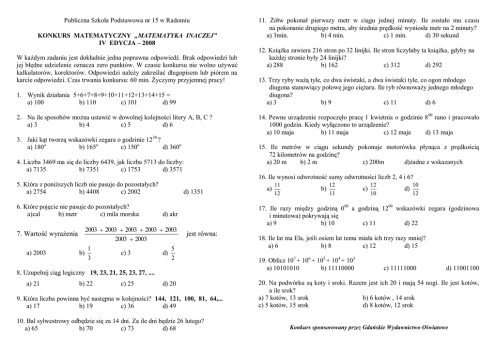 Publiczna Szkoła Podstawowa nr 15 w Radomiu KONKURS MATEMATYCZNY „MATEMATYKA INACZEJ” IV EDYCJA – 2008 W każdym zadaniu jest dokładnie jedna poprawna odpowiedź. Brak odpowiedzi lub jej błędne udzielenie oznacza zero punktów. W czasie konkursu nie wolno używać kalkulatorów, korektorów. Odpowiedzi należy zakreślać długopisem lub piórem na karcie odpowiedzi. Czas trwania konkursu: 60 min. Życzymy przyjemnej pracy! 1. Wynik działania 5+6+7+8+9+10+11+12+13+14+15 = a) 100 b) 110 c) 101 d) 99 2. Na ile sposobów można ustawić w dowolnej kolejności litery A, B, C ? a) 3 b) 4 c) 5 d) 6 3. Jaki kąt tworzą wskazówki zegara o godzinie 12 30 ? a) 180o b) 165o c) 150o d) 360o 11. Żółw pokonał pierwszy metr w ciągu jednej minuty. Ile zostało mu czasu na pokonanie drugiego metra, aby średnia prędkość wyniosła metr na 2 minuty? a) 3min. b) 4 min. c) 1 min. d) 30 sekund 12. Książka zawiera 216 stron po 32 linijki. Ile stron liczyłaby ta książka, gdyby na każdej stronie były 24 linijki? a) 288 b) 162 c) 312 d) 292 13. Trzy ryby ważą tyle, co dwa świstaki, a dwa świstaki tyle, co ogon młodego diugona stanowiący połowę jego ciężaru. Ile ryb równoważy jednego młodego diugona? a) 3 b) 9 c) 11 d) 6 14. Pewne urządzenie rozpoczęło pracę 1 kwietnia o godzinie 8 00 rano i pracowało 1000 godzin. Kiedy wyłączono to urządzenie? a) 10 maja b) 11 maja c) 12 maja d) 13 maja 15. Ile metrów w ciągu sekundy pokonuje motorówka płynąca z prędkością 72 kilometrów na godzinę? a) 20 m b) 2 m c) 200m d)żadne z wskazanych 4. Liczba 3469 ma się do liczby 6439, jak liczba 5713 do liczby: a) 7135 b) 7351 c) 1753 d) 3571 16. Ile wynosi odwrotność sumy odwrotności liczb 2, 4 i 6? 5. Która z poniższych liczb nie pasuje do pozostałych? a) 2754 b) 4408 c) 2002 6. Które pojęcie nie pasuje do pozostałych? a) cal b) metr c) mila morska 2003 7. Wartość wyrażenia a) 2003 b) 1 3 2003 2003 2003 2003 2003 c) 3 d) 1351 d) jest równa: 5 2 8. Uzupełnij ciąg logiczny 19, 23, 21, 25, 23, 27, .... a) 21 b) 22 c) 25 11 12 b) 12 11 c) 12 10 d) 10 12 17. Ile razy między godziną 000 a godziną 1200 wskazówki zegara (godzinowa i minutowa) pokrywają się a) 9 b) 10 c) 11 d) 22 d) akr 2003 a) d) 20 9. Która liczba powinna być następna w kolejności? 144, 121, 100, 81, 64,... a) 17 b) 19 c) 36 d) 49 10. Bal sylwestrowy odbędzie się za 14 dni. Za ile dni będzie 26 lutego? a) 65 b) 70 c) 73 d) 68 18. Ile lat ma Ela, jeśli osiem lat temu miała ich trzy razy mniej? a) 6 b) 8 c) 12 d) 15 19. Oblicz 107 + 106 + 105 + 104 + 103 a) 10101010 b) 11110000 c) 11111000 d) 11001100 20. Na podwórku są koty i sroki. Razem jest ich 20 i mają 54 nogi. Ile jest kotów, a ile srok? a) 7 kotów, 13 srok b) 6 kotów , 14 srok c) 5 kotów, 15 srok d) 8 kotów, 12 srok Konkurs sponsorowany przez Gdańskie Wydawnictwo Oświatowe PUBLICZNA SZKOŁA PODSTAWOWA NR 15 W RADOMIU ODPOWIEDZI DO ZADAŃ KONKURS MATEMATYCZNY „MATEMATYKA INACZEJ” „MATEMATYKA INACZEJ” 2008 IV edycja - 12 marca 2008r. 1. B DANE UCZESTNIKA KONKURSU 2. D Nazwisko i imię uczestnika .......................................................................................... 3. B Klasa................... 4. C 5. A 6. D 7. D 8. C 9. D 10. B 11. A KARTA ODPOWIEDZI Prawidłową odpowiedź zakreśl kółkiem. Jeśli się pomyliłeś przekreśl i zaznacz odpowiedź prawidłową Nr pytania Nr pytania 1. a b c d 11. a b c d 12. A 2. a b c d 12. a b c d 13. D 3. a b c d 13. a b c d 14. C 4. a b c d 14. a b c d 15. A 5. a b c d 15. a b c d 16. B 6. a b c d 16. a b c d 17. B 7. a b c d 17. a b c d 18. C 8. a b c d 18. a b c d 9. a b c d 19. a b c d 19. C 10. a b c d 20. a b c d 20. A