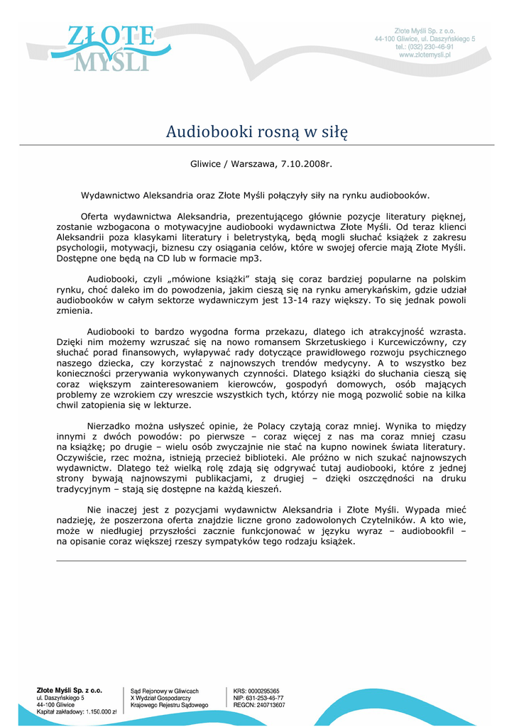 Audiobooki rosną w siłę Gliwice / Warszawa, 7.10.2008r. Wydawnictwo Aleksandria oraz Złote Myśli połączyły siły na rynku audiobooków. Oferta wydawnictwa Aleksandria, prezentującego głównie pozycje literatury pięknej, zostanie wzbogacona o motywacyjne audiobooki wydawnictwa Złote Myśli. Od teraz klienci Aleksandrii poza klasykami literatury i beletrystyką, będą mogli słuchać książek z zakresu psychologii, motywacji, biznesu czy osiągania celów, które w swojej ofercie mają Złote Myśli. Dostępne one będą na CD lub w formacie mp3. Audiobooki, czyli „mówione książki” stają się coraz bardziej popularne na polskim rynku, choć daleko im do powodzenia, jakim cieszą się na rynku amerykańskim, gdzie udział audiobooków w całym sektorze wydawniczym jest 13-14 razy większy. To się jednak powoli zmienia. Audiobooki to bardzo wygodna forma przekazu, dlatego ich atrakcyjność wzrasta. Dzięki nim możemy wzruszać się na nowo romansem Skrzetuskiego i Kurcewiczówny, czy słuchać porad finansowych, wyłapywać rady dotyczące prawidłowego rozwoju psychicznego naszego dziecka, czy korzystać z najnowszych trendów medycyny. A to wszystko bez konieczności przerywania wykonywanych czynności. Dlatego książki do słuchania cieszą się coraz większym zainteresowaniem kierowców, gospodyń domowych, osób mających problemy ze wzrokiem czy wreszcie wszystkich tych, którzy nie mogą pozwolić sobie na kilka chwil zatopienia się w lekturze. Nierzadko można usłyszeć opinie, że Polacy czytają coraz mniej. Wynika to między innymi z dwóch powodów: po pierwsze – coraz więcej z nas ma coraz mniej czasu na książkę; po drugie – wielu osób zwyczajnie nie stać na kupno nowinek świata literatury. Oczywiście, rzec można, istnieją przecież biblioteki. Ale próżno w nich szukać najnowszych wydawnictw. Dlatego też wielką rolę zdają się odgrywać tutaj audiobooki, które z jednej strony bywają najnowszymi publikacjami, z drugiej – dzięki oszczędności na druku tradycyjnym – stają się dostępne na każdą kieszeń. Nie inaczej jest z pozycjami wydawnictw Aleksandria i Złote Myśli. Wypada mieć nadzieję, że poszerzona oferta znajdzie liczne grono zadowolonych Czytelników. A kto wie, może w niedługiej przyszłości zacznie funkcjonować w języku wyraz – audiobookfil – na opisanie coraz większej rzeszy sympatyków tego rodzaju książek.