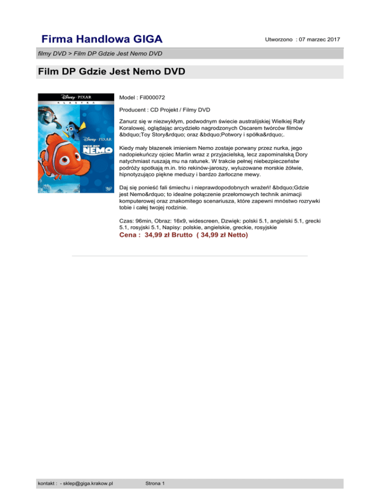 Firma Handlowa GIGA Utworzono : 07 marzec 2017 filmy DVD > Film DP Gdzie Jest Nemo DVD Film DP Gdzie Jest Nemo DVD Model : Fil000072 Producent : CD Projekt / Filmy DVD Zanurz się w niezwykłym, podwodnym świecie australijskiej Wielkiej Rafy Koralowej, oglądając arcydzieło nagrodzonych Oscarem twórców filmów „Toy Story” oraz „Potwory i spółka”. Kiedy mały błazenek imieniem Nemo zostaje porwany przez nurka, jego nadopiekuńczy ojciec Marlin wraz z przyjacielską, lecz zapominalską Dory natychmiast ruszają mu na ratunek. W trakcie pełnej niebezpieczeństw podróży spotkają m.in. trio rekinów-jaroszy, wyluzowane morskie żółwie, hipnotyzująco piękne meduzy i bardzo żarłoczne mewy. Daj się ponieść fali śmiechu i nieprawdopodobnych wrażeń! „Gdzie jest Nemo” to idealne połączenie przełomowych technik animacji komputerowej oraz znakomitego scenariusza, które zapewni mnóstwo rozrywki tobie i całej twojej rodzinie. Czas: 96min, Obraz: 16x9, widescreen, Dzwięk: polski 5.1, angielski 5.1, grecki 5.1, rosyjski 5.1, Napisy: polskie, angielskie, greckie, rosyjskie Cena : 34,99 zł Brutto ( 34,99 zł Netto) kontakt : - [email protected] Strona 1