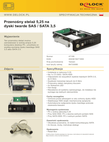 Mobile Racks SPECYFIKACJA TECHNICZNA W WW. DE LO CK . P L Przenośny stelaż 5,25 na dyski twarde SAS / SATA 3,5 Wyjasnienie Ten przenośny stelaż można zainstalować w wolnej wnęce 5,25 komputera desktop PC, umożliwia on szybką wymianę dysku twardego SAS 3,5 albo SATA 3.5. Zdjęcia Numer 47195 EAN 4043619471959 Kraj pochodzenia Taiwan kod taryfy celnej 84733080 Specyfikacja • Instalacja w zatoczce 5.25 • Na 1x 3.5 SAS / SATA HDD • Odpowiedni do wszystkich dysków twardych SATA 3.5, do 6 Gb/s • Szybkość transmisji danych do 6 Gb/s • Przenośny stelaż zamykany kluczem • 2x Wskaźnik LED • Hot Swap • Niezależna od systemu operacyjnego, do instalacji nie wymaga się żadnych sterowników Cechy szczególne • Ochrona przed wibracjami w celu ochrony dysku HDD • Stabilizacja HDD dzięki mechanicznej sprężynie • Automatyczne wyłączanie dysku twardego podczas otwierania kieszeni Wymagania systemowe • PC z wolną zatoczką 5.25 • Przy SAS HDD: PC z dwoma wolnymi portami SAS • Przy SATA HDD: PC z wolnym portem SATA Zawartość opakowania • Obudowa przenośna, 2x kabel komunikacyjny SATA • 2x klucze, śruby, instrukcja obsługi Opakowania • Retail Box © 2009 by Delock. Wszelkie pojawiające się tutaj nazwy i znaki należą do ich odpowiednich właścicieli. Błędy drukarskie, zmiany & pomyłki zastrzeżone.