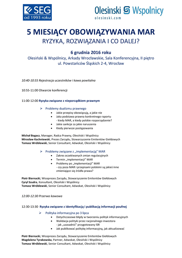 5 MIESIĄCY OBOWIĄZYWANIA MAR RYZYKA, ROZWIĄZANIA I CO DALEJ? 6 grudnia 2016 roku Olesiński & Wspólnicy, Arkady Wrocławskie, Sala Konferencyjna, II piętro ul. Powstańców Śląskich 2-4, Wrocław 10:40-10:55 Rejestracja uczestników i kawa powitalna 10:55-11:00 Otwarcie konferencji 11:00-12:00 Ryzyka związane z nieporządkiem prawnym Problemy dualizmu prawnego Jakie przepisy obowiązują, a jakie nie Jaka podstawa prawna konkretnego raportu - kiedy MAR, a kiedy polskie rozporządzenie? Jakie sankcje za jakie naruszenia Kiedy pierwsze postępowania Michał Bogacz, Manager, Radca Prawny, Olesiński i Wspólnicy Mirosław Kachniewski, Prezes Zarządu, Stowarzyszenie Emitentów Giełdowych Tomasz Wróblewski, Senior Consultant, Adwokat, Olesiński i Wspólnicy Problemy związane z „implementacją” MAR Zakres oczekiwanych zmian regulacyjnych Termin „implementacji” MAR Problemy po „implementacji” MAR - czy poza MAR i przepisami polskimi są jakieś inne zmieniające się źródła prawa? Piotr Biernacki, Wiceprezes Zarządu, Stowarzyszenie Emitentów Giełdowych Cyryl Szudra, Konsultant, Olesiński i Wspólnicy Tomasz Wróblewski, Senior Consultant, Adwokat, Olesiński i Wspólnicy 12:00-12:30 Przerwa kawowa 12:30-13:30 Ryzyka związane z identyfikacją i publikacją informacji poufnej Polityka informacyjna po 3 lipca Dotychczasowe błędy w tworzeniu polityk informacyjnych Walidacja polityki przez racjonalnego inwestora - jak „uzasadnić” przygotowany ISR Jak publikować politykę informacyjną, jak aktualizować Piotr Biernacki, Wiceprezes Zarządu, Stowarzyszenie Emitentów Giełdowych Magdalena Tyrakowska, Partner, Adwokat, Olesiński i Wspólnicy Tomasz Wróblewski, Senior Consultant, Adwokat, Olesiński i Wspólnicy Raportowanie pod MAR Jak rozumieć w praktyce definicję informacji poufnej - jak poznać potrzeby informacyjne racjonalnego inwestora (jeśli nie zrobiliśmy tego na etapie tworzenia polityki informacyjnej)? Jak obecnie raportować „umowy znaczące” Czy i jak raportować szacunkowe wyniki finansowe Zagrożenia ze strony racjonalnych inwestorów Michał Bogacz, Manager, Radca Prawny, Olesiński i Wspólnicy Mirosław Kachniewski, Prezes Zarządu, Stowarzyszenie Emitentów Giełdowych Magdalena Tyrakowska, Partner, Adwokat, Olesiński i Wspólnicy 13:30-14:00 Przerwa kawowa 14:00-15:00 Ryzyka związane z identyfikacją osób blisko związanych i raportowaniem ich transakcji Identyfikacja osób blisko związanych Dotychczasowa praktyka emitentów Interpretacje UKNF i związane z nimi ryzyka Jakie sankcje za uchybienia i od kiedy Piotr Biernacki, Wiceprezes Zarządu, Stowarzyszenie Emitentów Giełdowych Cyryl Szudra, Konsultant, Olesiński i Wspólnicy Tomasz Wróblewski, Senior Consultant, Adwokat, Olesiński i Wspólnicy Notyfikacje transakcji Praktyka notyfikacji po 3 lipca, procedury i szkolenia Jakie transakcje podlegają raportowaniu (praktyczne wątpliwości) Postępowanie spółki w przypadku fałszywych notyfikacji Michał Bogacz, Manager, Radca Prawny, Olesiński i Wspólnicy Mirosław Kachniewski, Prezes Zarządu, Stowarzyszenie Emitentów Giełdowych Tomasz Wróblewski, Senior Consultant, Adwokat, Olesiński i Wspólnicy