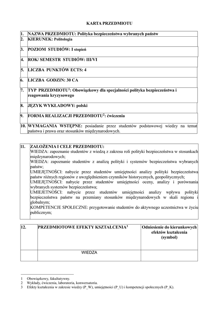 KARTA PRZEDMIOTU 1. NAZWA PRZEDMIOTU: Polityka bezpieczeństwa wybranych państw 2. KIERUNEK: Politologia 3. POZIOM STUDIÓW: I stopień 4. ROK/ SEMESTR STUDIÓW: III/VI 5. LICZBA PUNKTÓW ECTS: 4 6. LICZBA GODZIN: 30 CA 7. TYP PRZEDMIOTU1: Obowiązkowy dla specjalności polityka bezpieczeństwa i reagowania kryzysowego 8. JĘZYK WYKŁADOWY: polski 9. FORMA REALIZACJI PRZEDMIOTU2: ćwiczenia 10. WYMAGANIA WSTĘPNE: posiadanie przez studentów podstawowej wiedzy na temat państwa i prawa oraz stosunków międzynarodowych. 11. 12. ZAŁOŻENIA I CELE PRZEDMIOTU: WIEDZA: zapoznanie studentów z wiedzą z zakresu roli polityki bezpieczeństwa w stosunkach międzynarodowych; WIEDZA: zapoznanie studentów z analizą polityki i systemów bezpieczeństwa wybranych państw; UMIEJĘTNOŚCI: nabycie przez studentów umiejętności analizy polityki bezpieczeństwa państw różnych regionów z uwzględnieniem czynników historycznych, geopolitycznych; UMIEJĘTNOŚCI: nabycie przez studentów umiejętności oceny, analizy i porównania wybranych systemów bezpieczeństwa; UMIEJETNOŚCI: nabycie przez studentów umiejętności analizy wpływu polityki bezpieczeństwa państw na przemiany stosunków międzynarodowych w skali regionu i globalnym; KOMPETENCJE SPOŁECZNE: przygotowanie studentów do aktywnego uczestnictwa w życiu publicznym; PRZEDMIOTOWE EFEKTY KSZTAŁCENIA3 Odniesienie do kierunkowych efektów kształcenia (symbol) WIEDZA 1 2 3 Obowiązkowy, fakultatywny. Wykłady, ćwiczenia, laboratoria, konwersatoria. Efekty kształcenia w zakresie wiedzy (P_W), umiejętności (P_U) i kompetencji społecznych (P_K). P_W 01 Ma podstawową wiedzę o strukturach społecznych, prawnych, K_W04,K_W06, politycznych, ekonomicznych i kulturowych, zna i rozumie relacje zachodzące między nimi a otoczeniem. P_W 02 Zna i rozumie podstawowe zasady funkcjonowania życia politycznego, relacje jakie zachodzą między podmiotami prawa międzynarodowego. K_W01, K_W03, K_W04, K_W05, P_W03 Zna i rozumie podstawowe mechanizmy rządzenia i podejmowania K_W08, K_W15 decyzji politycznych. P_W 04 Posiada podstawową wiedzę w zakresie ustrojów i systemów K_W13, K_W14 bezpieczeństwa poszczególnych państw. UMIEJĘTNOŚCI P_U 01 Dostrzega podstawowe relacje między polityką a zjawiskami historycznymi, ideologicznymi, ekonomicznymi, społecznymi, kulturowymi. Potrafi prawidłowo je interpretować i dostrzegać powiązania między nimi. P_U 02 Potrafi aktywnie i świadomie uczestniczyć w życiu społecznopolitycznym. P_U 03 Potrafi analizować i wyjaśniać podstawowe mechanizmy funkcjonowania instytucji i organizacji politycznych, społecznych oraz potrafi dokonać analizy podstawowych zjawisk politycznych. K_U01, K_U02, K_U10, K_U11 K_U04, K_U05 K_U05, K_U06, K_U07, K_U12, K_U14 KOMPETENCJE SPOŁECZNE P_K 01 Jest przygotowany do aktywności w sferze publicznej, uznaje i szanuje różne punkty widzenia. K_K01, K_K04,K_K08 P_K 02 Ma zdolność kreatywnego rozwiązywania problemów, umie K_K09, K_K10, K_K12, K_K13 komunikować się z otoczeniem. 13. METODY OCENY EFEKTÓW KSZTAŁCENIA Symbol przedmiotoweg o efektu kształcenia Metody (sposoby) oceny4 Typ oceny5 Forma dokumentacji Ocenianie ciągłe (bieżące przygotowanie do zajęć), śródsemestralne zaliczenie pisemne, śródsemestralne zaliczenie ustne, końcowe zaliczenia pisemne, końcowe zaliczenia ustne, egzamin pisemny, egzamin ustny, praca semestralna, ocena umiejętności ruchowych, praca dyplomowa, projekt, kontrola obecności 5 Formująca, podsumowująca. 4 P_W01, P_W02, W zakresie CA: ocenianie ciągłe P_W03, P_W04, (bieżące przygotowanie do zajęć, P_U01, P_U02, P_U03, P_K01, punkty za udział w dyskusji, P_K02 obecność, referaty), końcowe Formująca i Referaty, lista podsumowująca obecności, zaliczenia ustne. 14. KRYTERIA OCENY OSIĄGNIĘTYCH EFEKTÓW KSZTAŁCENIA Kryterium opisowe Ocena Kryteria opisowe oceny osiągniętych efektów kształcenia 2 (ndst) Student nie opanował treści programowych przedmiotu i nie zrealizował zakładanych przedmiotowych efektów kształcenia. Nie rozumie podstawowych kategorii ani pojęć. Nie jest w stanie wyjaśnić istoty i przyczyn podstawowych dla przedmiotu zjawisk i procesów. Nie potrafi wykorzystać ich do analizy omawianych zagadnień, nie podejmuje także dyskusji na temat ich miejsca i roli w kontekście specyfiki przedmiotu. 3 (dost) Student opanował podstawowe treści programowe przedmiotu oraz zrealizował w niewielkim zakresie zakładane przedmiotowe efekty kształcenia. Poprawnie definiuje, przynajmniej na jeden z możliwych sposobów, podstawowe kategorie i pojęcia oraz potrafi je wykorzystać do analizy omawianych zjawisk i procesów. Potrafi podać różnicę między nimi, wyjaśnić przyczynę najważniejszych zjawisk. Wykazuje małe zainteresowanie problematyką analizowaną w ramach przedmiotu. Nie podejmuje dyskusji na omawiane tematy. 3+(dost+) Student opanował treści programowe przedmiotu oraz zrealizował zakładane przedmiotowe efekty kształcenia na poziomie poprawnym. Definiuje podstawowe kategorie i pojęcia oraz najważniejsze ujęcia teoretyczne. Umie dostrzec złożoność relacji między nimi, nie potrafi jednak wytłumaczyć ich pochodzenia. Potrafi poprawnie zastosować tę wiedzę do analizy omawianych zagadnień. Wykazuje rosnące zainteresowanie problematyką analizowaną w ramach przedmiotu, włącza się do dyskusji na ten temat. 4 (db) Student opanował treści programowe przedmiotu oraz zrealizował zakładane przedmiotowe efekty kształcenia. Definiuje kategorie, pojęcia oraz ujęcia teoretyczne, umie dostrzec złożoność relacji między nimi, potrafi wytłumaczyć ich pochodzenie i różnice, zastosować tę wiedzę do analizy omawianych zagadnień. Wykazuje stałe zainteresowanie omawianą problematyką, inicjuje dyskusje w zakresie podejmowanej tematyki. Wykazuje zrozumienie dla innych niż własne poglądów, podejmuje dyskusje na ich temat. 4+ (db+) Student o