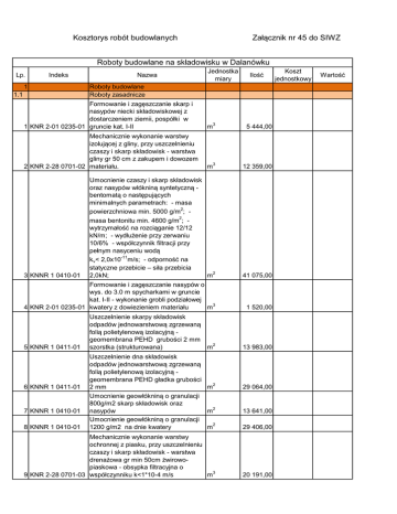 Kosztorys robót budowlanych Załącznik nr 45 do SIWZ Roboty budowlane na składowisku w Dalanówku Lp. Indeks 1 1.1 Nazwa Jednostka miary Ilość Roboty budowlane Roboty zasadnicze Formowanie i zagęszczanie skarp i nasypów niecki składowiskowej z dostarczeniem ziemii, pospółki w 1 KNR 2-01 0235-01 gruncie kat. I-II m3 5 444,00 Mechanicznie wykonanie warstwy izolującej z gliny, przy uszczelnieniu czaszy i skarp składowisk - warstwa gliny gr 50 cm z zakupem i dowozem 2 KNR 2-28 0701-02 materiału. m3 12 359,00 Umocnienie czaszy i skarp składowisk oraz nasypów włókniną syntetyczną bentomatą o następujących minimalnych parametrach: - masa powierzchniowa min. 5000 g/m2; masa bentonitu min. 4600 g/m2; wytrzymałość na rozciąganie 12/12 kN/m; - wydłużenie przy zerwaniu 10/6% - współczynnik filtracji przy pełnym nasyceniu wodą kv< 2,0x10-11m/s; - odporność na statyczne przebicie – siła przebicia 2,0kN; m2 41 075,00 Formowanie i zagęszczanie nasypów o wys. do 3.0 m spycharkami w gruncie kat. I-II - wykonanie grobli podziałowej 4 KNR 2-01 0235-01 kwatery z dowiezieniem materiału m3 1 520,00 Uszczelnienie skarpy składowisk odpadów jednowarstwową zgrzewaną folią polietylenową izolacyjną geomembrana PEHD grubości 2 mm szorstka (strukturowana) m2 13 983,00 3 KNNR 1 0410-01 5 KNNR 1 0411-01 6 KNNR 1 0411-01 7 KNNR 1 0410-01 8 KNNR 1 0410-01 Uszczelnienie dna składowisk odpadów jednowarstwową zgrzewaną folią polietylenową izolacyjną geomembrana PEHD gładka grubości 2 mm m2 Umocnienie geowłókniną o granulacji 800g/m2 skarp składowisk oraz nasypów m2 Umocnienie geowłókniną o granulacji 1200 g/m2 na dnie kwatery m2 Mechanicznie wykonanie warstwy ochronnej z piasku, przy uszczelnieniu czaszy i skarp składowisk - warstwa drenażowa gr min 50cm żwirowopiaskowa - obsypka filtracyjna o 9 KNR 2-28 0701-03 współczynniku k<1*10-4 m/s m3 29 064,00 13 641,00 29 406,00 20 191,00 Koszt jednostkowy Wartość 10 KNNR 1 0609-04 Drenaż rurowy jednorzędowy z rur perforowanych o średnicach nominalnych 250/216mm w uprzednio przygotowanej obsypce w wykopie suchym - rury PP średnicy 250 mm perforowane w ilości 1010 mb oraz rury pełne w ilości 120 mb. m Wykonanie obsypki filtracyjnej zamkniętej geowłókniną filtracyjną w gotowym wykopie z przygotowaniem 11 KNNR 1 0608-01 kruszywa - drenaż dn 250mm 1.2 Obiekty towarzyszące 1 Rurociąg tłoczny PE 110 Roboty pomiarowe przy liniowych robotach ziemnych - trasa dróg w 12 KNR 2-01 0119-03 terenie równinnym 13 KNNR 1 0202-07 14 KNNR 1 0313-01 15 KNNR 4 1411-02 1 130,00 m3 340,79 km 0,40 Roboty ziemne wykonywane koparkami podsiębiernymi o pojemności łyżki 0,60m3 w gruncie kategorii I-II z transportem urobku samochodami samowyładowczymi do 5t na odległość 1km m3 72,18 Umocnienie pełne palami szalunkowymi stalowymi (wypraskami) wraz z ich rozbiórką, ścian wykopów w gruntach suchych kategorii I-IV o szerokości 1m i głębokości do 3,0m m2 Podłoża pod kanały i obiekty z materiałów sypkich o grubości 10cm z zakupem materiału m3 Obsypka nad rurociągiem grub. 30cm ponad wierzch rury z materiałów 16 KNNR 4 1411-04 sypkich z zakupem materiału m3 Montaż rurociągów z rur KNR-W 2-18 0109- polietylenowych PE, PEHD o średnicy 17 04 zewnętrznej 110mm m Połączenie metodą zgrzewania czołowego rur polietylenowych, KNR-W 2-18 0110- ciśnieniowych PE, PEHD o średnicy 18 04 zewnętrznej 110mm - łuki Próba wodna szczelności sieci wodociągowych z rur PEHD o 19 KNNR 4 1606-01 średnicy do 110mm (1 próba - 200m) 2 Pompownia PO -1 i PO - 2 2.1 Roboty konstrukcyjne 220,33 48,49 95,24 396,00 złącze 5,00 próba 2,00 Umocnienie ścian wykopów w gruncie nawodnionym kategorii I-II grodzicami L=10m wbijanymi pionowo wraz z wykonaniem zastrzałów i oczepów 20 KNR 2-01 0325-07 stalowych m2 141,13 Roboty ziemne wykonywane koparkami podsiębiernymi o pojemności łyżki 0,60m3 w gruncie kategorii I-II z transportem urobku samochodami samowyładowczymi do 5t na odległość 1km m3 96,23 21 KNNR 1 0202-07 22 KNNR 4 1411-02 23 KNNR 1 0214-04 24 KNNR 2 1201-01 25 26 27 28 29 2.2 30 Podłoża pod kanały i obiekty z materiałów sypkich o grubości 30cm z zakupem materiału PBK-1 m3 Zasypanie wykopów fundamentowych podłużnych, punktowych, rowów, wykopów obiektowych gruntem kategorii I-II o grubości warstwy w stanie luźym 35cm z zagęszczeniem mechanicznym ubijakami z zakupem materiału m3 Podkłady betonowe z betonu zwykłego z kruszywa naturalnego B 15 na gruncie m3 Analogia - osadzenie i montaż zbiornika PO 1i2 wraz z oczyszczeniem i przygotowaniem do KNR-W 2-18 0420- montażu technologi i rurociągów 11 zewnętrznych Dostawa przepompowni ścieków PO-1 Dostawa przepompowni ścieków PO-2 Montaż prefabrykowanych przykryć KNR 2-02 1925-04 zbiorników okrągłych Kominek wentylacyjny PCV Montaż pomp Dostawa, montaż i uruchomienie pomp do ścieków 2x1,85kW 2x3,85kW Dostawa i montaż kompletnego 1.2. 2.3 31 2.4 32 KNNR 5 0403-03 33 34 3 74,58 0,71 szt kpl kpl 2,00 1,00 1,00 element kpl 2,00 2,00 kpl 2,00 kpl 2,00 szt. 2,00 szt kpl 2,00 2,00 m3 273,22 wyposażenia technologicznego wszystkich elementów przepomowni wg DT wraz z instalacją elektryczną, sterowniczą, podłączeniem do zasilania Dostawa, montaż i uruchomienie technologiczne przepompowni ścieków dla kanalizacji sanitarnej wg DT Część elektryczna Montaż rozdzielnicy PO1 i 2 Wykonanie instalacji elektrycznej i uziemiającej dla PO1 i PO2 Badania i pomiary Garaż dla kompaktora Wykopy rowów i kanałów melioracyjnych na odkład koparkami podsiębiernymi o pojemności łyżki 35 KNR 2-01 0224-04 0,60m3 w gruncie kategorii III Podłoża i obsypki z kruszyw mineralnych dowiezionych wykonane w wykopie o normalnej wilgotności, przy zastosowaniu dowiezionego piasku 36 KNNR 11 0501-05 średniego m3 Podbudowy z kruszyw łamanych, warstwa dolna, grubość warstwy po 37 KNNR 6 0113-03 zagęszczeniu 25cm - 0/31,5mm m2 Podbudowy z kru