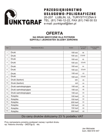PRZEDSIÊBIORSTWO US£UGOWO-POLIGRAFICZNE UNKTGRAF 20-207 LUBLIN, UL. TURYSTYCZNA 9 TEL. (81) 746-12-22, FAX (81) 748 00 53 e-mail: [email protected] OFERTA NA DRUKI MEDYCZNE DLA POTRZEB SZPITALI I JEDNOSTEK S£U¯BY ZDROWIA Lp. Nazwa druku Format druku Ilość 1 Druki 100 szt. A6 2 Druki 100 szt. 2/3xA6 3 Druki 100 szt. A5 4 Druki 100 szt. 2/3xA5 5 Druki 100 szt. A4 6 Druki 100 szt. 2/3xA4 7 100 szt. A3 8 Druki Druki 100 szt. 2/3xA3 9 Druki (karton) szt. A5 10 Druki (karton) szt. A4 11 Druki samokopiuj¹ce 100 szt. A6 12 Druki samokopiuj¹ce 100 szt. A5 13 Druki samokopiuj¹ce 100 szt. A4 14 Ksi¹¿ka 100 kart A4 15 150 kart A4 200 kart A4 17 Ksi¹¿ka Ksi¹¿ka Ksi¹¿ka 100 kart A3 18 Ksi¹¿ka 150 kart A3 19 Ksi¹¿ka 200 kart A3 16 Cena jedn. netto Do ceny druków doliczamy 23 % podatku VAT Przy zamawianiu prosimy podawać nazwę i symbol druku np. historia choroby - (MZ/Og-2) etc. Jan Michalak kom. 602 619 447 Lp. Nazwa druku 16 Działalność patronażowa 17 Dzienna ewidencja przyjęć pacjentów 18 Symbol druku Format druku A4 M/D-3 A3 Dzienna ewidencja wykonanych badań M/Rtg-1 A4 19 Dzienna ewidencja wykonanych zabiegów w dziale rehabiltacyjnym M/Zlt-3 A4 20 Dziennik finansowy przebitk. 3-kolumnowy, SK P/K-290 A4 21 Dziennik korespondencyjny P/BS 1 A4 22 Dziennik laboratoryjny bakteriologii M/E-II-18 A4 23 Dziennik materiałowy przebitkowy P/K-302 2/3 A3 24 Dziennik podawczy 25 Dziennik położnej cz. III, 100 kart 26 Dziennik położnej cz.I, 50 kart 27 Dziennik pracy laboratorium diagnostycznego 28 Dziennik pracy pogotowia ratunkowego 29 A4 M/K-1b A4 /K-1 A4 M/An-30 A4 M/Pr-2 A4 Dziennik ruchu chorych oddziału M/Szp-3 A4 30 Dziennik ruchu chorych szpitala Mz/Szp-2 A3 31 Dziennik tabelaryczny P/K-185 A3 32 Elektrodiagram M/Dp-3 A4 33 Elektrolity M/An-20a A7 34 Enzymy M/An-25 A6 35 Formularz zgłoszenia dod. wyniku (HIV) FORMULARZ 3 A4 36 Formularz zgłoszenia dodatniego wyniku gruźlicy FORMULARZ 2 A4 37 Formularz zgłoszenia zachorowania na kiłę, rzeżączkę,... FORMULARZ 4 A4 38 Formularz zgłoszenia zachorowań w kier. biologicznych... FORMULARZ 1 A4 39 Formularz zgłoszenia zgonu z powodu choroby zakaźnej FORMULARZ 5 A4 40 Grupa krwi M/An-7 2/3 A6 41 Grupa krwi M/An-18 2/3 A6 42 Historia choroby dla chorych na gruźlicę M/Sg-1 4 A4 43 Historia choroby dziecka Mz/Szp-31 2 A4 44 Historia choroby dziecka - wkładka Mz/szp-31a A4 45 Historia choroby klinika chirurgiczna M/Szk-23 2 A4 46 Historia choroby klinika chorób wewnętrznych M/Szk-5 2 A4 47 Historia choroby klinika chorób wewnętrznych - wkładka M/Szk-5a A4 48 Historia choroby klinika neurologiczna M/Szk-3 2 A4 49 Historia choroby klinika neurologiczna - wkładka M/Szk-3a 2 A4 50 Historia choroby klinika okulistyczna M/Szk-20 2 A4 51 Historia choroby ogólna Mz/Szp-26 2 A4 52 Historia choroby ogólna - wkładka Mz/Szp-26a A4 53 Historia choroby otolaryngologiczna M/Szk- 2 A4 54 Historia choroby poradni M/Og-2 2 A5 55 Historia choroby poradni - wkładka M/Og-2a A5 56 Historia choroby poradni odwykowej M/Alk-1 4 A4 57 Historia choroby poradni reumatologicznej dla dorosłych 58 59 M/R-1 2/3 A4x2 Historia choroby poradni reumatologicznej dla dorosłych - wkładka M/R-1 a 2/3 A4 Historia choroby poradni zdrowia psychicznego M/Ps-1 4 A4 Cena jedn. netto Lp. Nazwa druku Symbol druku Format druku 60 Historia choroby psychiatryczna Mz/Szp-70 4 A4 61 Historia choroby urazowo-ortopedyczna M/Szk-19 2 A4 62 Historia chorób kobiecych Mz/Szp-13 2 A4 63 Historia chorób kobiecych - wkładka Mz/Szp-13a A4 64 Historia rozwoju noworodka Mz/Szp-29 A4 65 Historia zdrowia i choroby M/Og-3 1/3 A3 66 Indywidualna karta opieki pielęgniarskiej w POZ NFZ 8/69/2007 2 A4 67 Indywidualna karta zleceń lekarskich (pionowa) Mz/Szp-12b A4 68 Indywidualna karta zleceń lekarskich (pozioma) Mz/Szp-12a A4 69 Indywidualny plan opieki w pielęgniarskiej opiece środowiskowej NFZ 69/2007 A4 70 Informacja dla lekarza kierującego A4, SK 71 Informacja dla lekarza kierującego A5, SK 72 Informacja dotycząca szczepień 73 Inf. o liczbie uczni. obj. opieką w zakr. świad.: pielęgniarka szkolna 74 Informacja o stanie konta PKZP P/KRD-2 A7 75 Jonogram M/An-13 A6 76 Kał M/An-16 A7 77 Karta akcesyjna dwumiesięcznika Pu-B 115 A6 78 Karta akcesyjna dwutygodnika Pu-B 113 A6 79 Karta akcesyjna dziennika Pu-B 111 A6 80 Karta akcesyjna kwartalnika Pu-B 116 A6 81 Karta akcesyjna miesięcznika Pu-B 112 A6 82 Karta akcesyjna tygodnika Pu-B 117 A6 83 Karta badania cytologicznego - karton Mz/N-16 A6 84 Karta badania dla kierowców Zał. nr 7 M/Lk - Zał N A4 85 Karta badania histopatologicznego Mz/N-17 A5 86 Karta badania lekarskiego osoby ubiegającej się M/Lb-Zał 2 3 A4 87 Karta bad. lek. w etapie podst. w progr. profil. chorób odtytoniowych NFZ 7/69/2007 A5 88 Karta badania piersi u kobiet Mz/K- A4 89 Karta badania profilaktczynego M/Lp- 4 A5 90 Karta badania profil. w programie profil. chorób układu krążenia NFZ 4/69/2007 2 A4 91 Karta badania profil. w programie profil. chorób układu krążenia NFZ 4/69/2007 A4 92 Karta badania psychologicznego M/Lk - Zał. A4 93 Karta badań do celów sanitarno-epidemiologicznych M/LP-2 A4 94 Karta badań okresowych - karton M/Lp-13 A5 95 Karta badań profilaktycznych (specjalistycznych) M/Lp-12 A5 96 Karta badań profilaktycznych - wkładka M/LP- 2 A5 97 Karta badań rozwoju i zdrowia dziecka 6-letniego M/Hsz-12 A5 98 Karta chorego na jaglicę - karton M/Ok-9 A5 99 Karta choroby chorego na kiłę M/Sw-1 b 2 A5 Mz/St-7 2 A5 101 Karta choroby poradni przeciwgruźliczej M/G- A4 102 Karta choroby poradni stomatologicznej 103 M/St-1 2xA5 Mz/St-1a A5 100 Karta choroby poradni chirurgii stomatologicznej Karta choroby poradni stomatologicznej - wkładka A4 NFZ 9 A5 M/Hsz-17 A6 A5 Cena jedn. netto Symbol druku Format druku 104 Karta choroby poradni SW M/Sw-1 2 A5 105 Karta choroby poradni SW - wkładka M/Sw-1a A5 106 Karta chorób narządu rodnego M/K-18 A5 107 Karta ciąży M/K-5 2 A4 Mz/Szp-80 A4 109 Karta czytelnika P