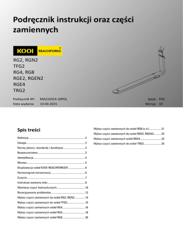 Podręcznik instrukcji oraz części zamiennych RG2, RGN2 TFG2 RG4, RG8 RGE2, RGEN2 RGE4 TRG2 Podręcznik Nº: Data wydania: MA210314-10POL 10-04-2015 Język: POL Wersja: 10 Spis treści Wykaz części zamiennych do wideł RG8 (c.d.).................. 21 Definicje................................................................................... 2 Wykaz części zamiennych wideł RGE4................................ 23 Uwaga....................................................................................... 2 Wykaz części zamiennych do wideł TRG2.......................... 25 Normy jakości, standardy i dyrektywy................................ 2 Bezpieczeństwo...................................................................... 3 Identyfikacja............................................................................ 4 Montaż...................................................................................... 5 Eksploatacja wideł KOOI-REACHFORKS®......................... 6 Harmonogram konserwacji................................................... 6 Zużycie...................................................................................... 7 Instrukcje wymiany tulei........................................................ 8 Wymiana części hydraulicznych.......................................... 10 Rozwiązywanie problemów................................................... 12 Wykaz części zamiennych do wideł RG2, RGN2................ 14 Wykaz części zamiennych do wideł TFG2........................... 15 Wykaz części zamiennych wideł RG4.................................. 16 Wykaz części zamiennych wideł RG4.................................. 18 Wykaz części zamiennych wideł RG8.................................. 20 Wykaz części zamiennych do wideł RGE2, RGEN2............ 22 Definicje Ostrzeżenie: Fragmenty tekstu oznaczone ikoną „Ostrzeżenie” (ukazaną po lewej) oraz słowem „ Ostrzeżenie:” zawierają informacje dotyczące czynności, które mogą doprowadzić do poważnych obrażeń ciała. Przestroga: Fragmenty tekstu oznaczone ikoną „Przestroga” (ukazaną po lewej) oraz słowem „ Przestroga:” zawierają informacje dotyczące czynności, które mogą doprowadzić do uszkodzenia wideł KOOI-REACHFORKS®, części wideł KOOI-REACHFORKS® lub towarów. Tekst „Dotyczy tylko:” (kursywą) oznacza, że tekst dotyczy jedynie konkretnych sytuacji lub konkretnego typu wideł KOOI-REACHFORKS®. Uwaga © Copyright 2006 - 2014, Meijer Handling Solutions B.V. Wszelkie prawa zastrzeżone. O ile nie zastrzeżono inaczej, bez uprzedniej pisemnej zgody Meijer Handling Solutions powielanie informacji podanych w niniejszej instrukcji, w tym ilustracji i tekstu, jest zabronione. Informacje zawarte w niniejszej instrukcji podaje się bez żadnych gwarancji. W żadnych okolicznościach firma Meijer Handling Solutions B.V.nie ponosi odpowiedzialności za wypadki i szkody wynikłe wskutek używania niniejszego podręcznika. Zwracamy uwagę na fakt, że informacje zawarte w podręczniku mogą zostać zmienione w dowolnym czasie i bez wcześniejszego powiadomienia, a także może on zawierać nieścisłości techniczne oraz błędy drukarskie. Firma Meijer Handling Solutions B.V.dokłada wszelkich starań w celu wyeliminowania błędów z podręcznika, jednak nie może udzielić w tym zakresie żadnej gwarancji. Prosimy o kontakt w przypadku natrafienia na błędy drukarskie lub nieścisłości techniczne, a także w przypadku jakichkolwiek sugestii. KOOI-REACHFORKS® jest zastrzeżonym znakiem towarowym firmy Meijer Handling Solutions. (Gebr. Meijer). Pozostałe nazwy produktów i nazwy handlowe, które pojawiają się w instrukcji, a nie zostały wymienione powyżej, są Normy jakości, standardy i dyrektywy Produkty firmy Meijer Handling Solutions B.V. są zgodne z następującymi normami jakości: ISO 9001 Widły KOOI-REACHFORKS® są zgodne z następującymi normami/dyrektywami: • ISO 13284 – Przedłużenia ramion wideł i teleskopowe ramiona wideł; • ISO 4406 – Siłowniki hydrauliczne – Ciecze – Metoda kodowania poziomu zanieczyszczeń w postaci cząstek stałych • ISO 2328 – Wózki widłowe – Ramiona wideł typu hakowego i karetki ramion wideł • CE (2006/42/WE) – Dyrektywa Maszynowa • ISO-FDIS-ISO 3834-2 – Wymagania jakościowe dla spawania materiałów metalicznych - część 2: Kompleksowe wymagania jakościowe • CE (94/9/we) – ATEX (dotyczy tylko wideł z tabliczką znamionową ATEX!) Widły KOOI-REACHFORKS® są losowo poddawane próbom dynamicznym zgodnie z normą ISO 2330. 2 Bezpieczeństwo Ostrzeżenie: Zabrania się jazdy na widłach KOOI-REACHFORKS® oraz na ładunku. Ostrzeżenie: Zabrania się przechodzenia oraz stania pod widłami KOOI-REACHFORKS®. Ostrzeżenie: Zabrania się sięgania przez maszt wózka widłowego. Ostrzeżenie: Zabrania się obciążania wideł KOOI-REACHFORKS® przekraczając ich graniczne parametry udźwigu oraz środka ładunku podane przez producenta. Ostrzeżenie: Zabrania się przyspawywania jakichkolwiek elementów do wideł KOOI-REACHFORKS® bez wyraźnej zgody dostawcy. Operacje spawania wykonywane bez zgody spowodują utratę wszelkich gwarancji. Przestroga: W przypadku pozostawienia wózka bez nadzoru, konieczne jest wyłączenie silnika i uruchomienie hamulca ręcznego. Przestroga: Zwracać uwagę na przestrzeń powyżej i poniżej wideł KOOI-REACHFORKS®. Przestroga: Ładunek na widłach KOOI-REACHFORKS® musi być rozłożony jak najbardziej równomiernie. Przestroga: Widły KOOI-REACHFORKS® (z ładunkiem) należy wsunąć możliwie wcześnie. Przestroga: Jeśli to możliwe, widły KOOI-REACHFORKS® należy wsunąć przed rozpoczęciem jazdy. Przestroga: Podczas jazdy widły KOOI-REACHFORKS® powinny zawsze znajdować się w najniższym możliwym położeniu. Ostrzeżenie: Zabrania się użytkowania uszkodzonych wideł KOOI-REACHFORKS® przed ich naprawą lub wymianą pr