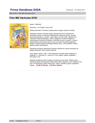 Firma Handlowa GIGA Utworzono : 07 marzec 2017 filmy DVD > Film MK Herkules DVD Film MK Herkules DVD Model : Fil000042 Producent : CD Projekt / Filmy DVD „Herkules" to szalona odyseja pełna przygód, zabawy i fantazji. Nastoletni Herkules, potomek bogów adoptowany przez śmiertelnych, uświadamia sobie, że posiada nadludzką siłę. Odkrywa również, że jego ojcem jest bóg Zeus, a domem - góra Olimp. Aby tam trafić, chłopak musi udowodnić swoje bohaterstwo. Wraz z latającym rumakiem Pegazem i nieokrzesanym trenerem Filoktetem, Herkules wyruszy w podróż, w trakcie której będzie musiał uporać się ze swym uczuciem do greckiej piękności Megary, a także pokonać krewkiego Hadesa, który z pomocą Bóla i Panika planuje podbić wszechświat. Wspaniała animacja, gwiazdorski dubbing i efektowna muzyka sprawiają, że „Herkules" nie ma sobie równych! Czas: 89min, Obraz: 1.66:1, 16:9 widescreen, Dzwięk: polski dubbing 2.0, angielski 5.1, francuski 5.1, czeski 2.0 i inne, Napisy: polskie, angielskie, francuskie i inne Materiały dodatkowe • Dostęp do wybranych scen • Galeria sztuki Herkulesa • Disneyopedia: Mity Greckie • Śpiewaj z nami: „From Zero To Hero” • Kulisy filmu * Menu i dodatki w języku angielskim Cena : 24,99 zł Brutto ( 24,99 zł Netto) kontakt : - [email protected] Strona 1