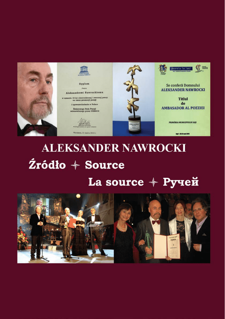 ALEKSANDER NAWROCKI Źródło Source La source Ручей © Aleksander Nawrocki © Anita Fincham, Andrew Fincham, Anna Bolińska, Ula de B., Bożena Orszulak, Andrej Bazylewski, Wiktoria Ubuszajewa, Wiera Winogorowa ISBN 978-83-7859-740-7 Wydawca: Wydawnictwo internetowe e-bookowo www.e-bookowo.pl Kontakt: [email protected] Wszelkie prawa zastrzeżone. Kopiowanie, rozpowszechnianie części lub całości bez zgody wydawcy zabronione Wydanie II 2016 Aleksander Nawrocki Źródło Aleksander Nawrocki (1940), absolwent filologii polskiej, węgierskiej i etnografii na Uniwersytecie Warszawskim. Studia pogłębiał za granicą: Węgry, Rumunia. Uczęszczał na wykłady z filozofii prowadzone przez Leszka Kołakowskiego. Jako pierwszy w świecie obronił pracę magisterską o poezji Czesława Miłosza (1967). Debiutował wierszami w r. 1965 u Stanisława Grochowiaka (tygodnik „Kultura”), którego nazywano księciem poetów. W r. 1966 wydał zbiór wierszy pt. „Rdzawe owoce”, dobrze przyjęty przez krytykę. Jest autorem 16 tomów wierszy + 19 tomów wyborów wierszy wydanych za granicą, 2 tomów opowiadań, powieści „Cień jego anioła”, książki popularnonaukowej o szamanizmie syberyjskim, książki reportażowej pt. „Jak zamordowano Imre Nagya” (powstanie węgierskie 1956r.). Tłumaczy z literatur: rosyjskiej, bułgarskiej, rumuńskiej, ukraińskiej, serbskiej, węgierskiej, fińskiej, angielskiej, francuskiej. Uczestnik wielu prestiżowych międzynarodowych festiwali literackich: Struga (Macedonia), Warna (Bułgaria), Belgrad (Serbia), Izmir (Turcja), Kair (Egipt), Tver (Rosja), Kijów (Ukraina), Ryga (Łotwa), Wilno (Litwa), Bonn (Niemcy), Londyn (Wielka Brytania). Laureat 25 międzynarodowych nagród literackich. Od r. 1992 właściciel Wydawnictwa Książkowego IBiS, od r. 1998 redaktor naczelny Pisma „POEZJA dzisiaj”. Wydaje głównie literaturę współczesną: polską i zagraniczną, w tym antologie poetyckie: grecka, hiszpańska, węgierska, fińska, rosyjska, ukraińska. Autor i wydawca dzieła – „Poezja polska – Antologia tysiąclecia” (3 tomy, 275 poetów, od „Bogurodzicy” do dzisiaj – str. 1800). Współredaktor dwujęzycznej 4 e-bookowo Aleksander Nawrocki Źródło antologii poezji polskiej, wydanej w Rosji w serii „Iz wieka w wiek”, prezentującej antologie poetyckie 14 krajów słowiańskich. Od r. 2001 organizator Światowych Dni Poezji UNESCO, na których wybitnym poetom polskim wręczana jest Nagroda „Laur UNESCO”, a zagranicznym Nagroda „POEZJI dzisiaj” za przekłady poezji polskiej. Impreza ta trwa 100 dni – zaczyna się w Warszawie, potem w całym kraju oraz w Bonn i Londynie, a zakończenie jest we Wilnie. Od 2008 roku organizuje Festiwale Poezji Słowiańskiej. Otrzymał Złoty Krzyż Zasługi. Uhonorowany wysokimi odznaczeniami przez czterech prezydentów: R.P., Republiki Czeskiej, Węgierskiej i Republiki Jakuckiej. 5 e-bookowo Aleksander Nawrocki Źródło Aleksander Nawrocki (1940), graduated in Polish philology, Hungarian philology and ethnography at the University of Warsaw, continuing his studies in Hungary and Romania. He attended lectures in philosophy by Leszek Kołakowski. He was the first person in the world to complete his MA on the poetry of CzesławMiłosz (1967). His poetical debut was in 1965 in ‘Kultura’ weekly magazine, edited by Stanisław Grochowiak – the ‘Prince of Poets’. His first volume of verse, ‘Rusty fruit’ was published in 1966 and well received by critics. He has now written 16 volumes of poetry, with19 volumes published abroad, plus two volumes of short stories, a novel ‘The Shadow of his Angel’, a popular science book on Siberian shamanism, and a book of reportage ‘How Imre Nagy was murdered’ about the Hungarian uprising 1956. He translates literature from: Russian, Bulgarian, Romanian, Ukrainian, Serbian, Hungarian, Finnish, English, French. He has participated in many prestigious international literary festivals including: Struga (Macedonia); Varna (Bulgaria); Belgrade (Serbia); Izmir (Turkey); Cairo (Egypt); Tver (Russia); Kiev (Ukraine); Riga (Latvia); Vilnius (Lithuania); Bonn (Germany) and London (United Kingdom). He is also the recipient of tventy five international literary awards. In 1992 he founded publishing house IBIS, and since 1998 he has been the managing editor of “POETRY Today”. He publishes mostly contemporary literature: Polish and foreign, including anthologies of poetry: Greek; Spanish; Hungarian; Finnish; Russian and Ukrainian. He is the author and publisher of “Polish Poetry – Anthology of the Millennium” (3 6 e-bookowo Aleksander Nawrocki Źródło volumes, 275 poets, from the “The Mother of God” to this day pp1800). He is also the co-editor of a bilingual anthology of Polish poetry, published in Russia in the series of “From century to century”, which presents an anthology of poetry from 14 Slavic countries. Since 2001 he has organised World Poetry Day by UNESCO at which the outstanding Polish poets’ prize ‘Laurel UNESCO’ is awarded, and a foreign award of Poetry Today for the translations of Polish poetry. This event lasts 100 days – beginning in Warsaw, then across the whole country + Bonn and London, ending in Vilnius. Since 2008 he has organized the Slavonik Poetry Festival. He has been honoured with high-level decorations by four presidents: of the Polish Republic, of the Czech Republic, of Hungary and of Republic of Sakha. 7 e-bookowo Aleksander Nawrocki Źródło Aleksander Nawrocki (1940), diplômé de philologies polonaise et hongroise, ainsi que d’ethnologie à l’Université de Varsovie. Études approfondies à l’étranger: en Hongrie et en Roumanie. Il a également suivi des cours de philosophie de Leszek Kolakowski. Il a été le premier à soutenir un mémoire de maîtrise sur la poésie de Czeslaw Milosz (1967). Ses premiers poèmes ont paru en 1965, dans l’hebdomadaire Kultura, sous la direct