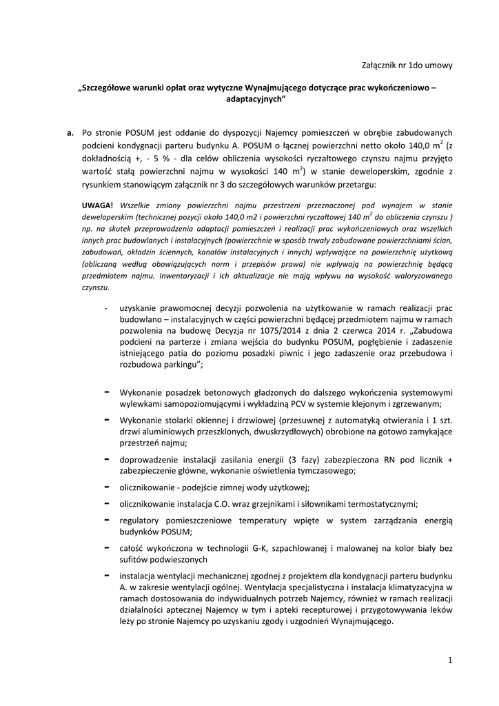 Załącznik nr 1do umowy „Szczegółowe warunki opłat oraz wytyczne Wynajmującego dotyczące prac wykończeniowo – adaptacyjnych” a. Po stronie POSUM jest oddanie do dyspozycji Najemcy pomieszczeń w obrębie zabudowanych podcieni kondygnacji parteru budynku A. POSUM o łącznej powierzchni netto około 140,0 m2 (z dokładnością +, - 5 % - dla celów obliczenia wysokości ryczałtowego czynszu najmu przyjęto wartość stałą powierzchni najmu w wysokości 140 m2) w stanie deweloperskim, zgodnie z rysunkiem stanowiącym załącznik nr 3 do szczegółowych warunków przetargu: UWAGA! Wszelkie zmiany powierzchni najmu przestrzeni przeznaczonej pod wynajem w stanie 2 deweloperskim (technicznej pozycji około 140,0 m2 i powierzchni ryczałtowej 140 m do obliczenia czynszu ) np. na skutek przeprowadzenia adaptacji pomieszczeń i realizacji prac wykończeniowych oraz wszelkich innych prac budowlanych i instalacyjnych (powierzchnie w sposób trwały zabudowane powierzchniami ścian, zabudowań, okładzin ściennych, kanałów instalacyjnych i innych) wpływające na powierzchnię użytkową (obliczaną według obowiązujących norm i przepisów prawa) nie wpływają na powierzchnię będącą przedmiotem najmu. Inwentaryzacji i ich aktualizacje nie mają wpływu na wysokość waloryzowanego czynszu. - uzyskanie prawomocnej decyzji pozwolenia na użytkowanie w ramach realizacji prac budowlano – instalacyjnych w części powierzchni będącej przedmiotem najmu w ramach pozwolenia na budowę Decyzja nr 1075/2014 z dnia 2 czerwca 2014 r. „Zabudowa podcieni na parterze i zmiana wejścia do budynku POSUM, pogłębienie i zadaszenie istniejącego patia do poziomu posadzki piwnic i jego zadaszenie oraz przebudowa i rozbudowa parkingu”; - Wykonanie posadzek betonowych gładzonych do dalszego wykończenia systemowymi wylewkami samopoziomującymi i wykładziną PCV w systemie klejonym i zgrzewanym; - Wykonanie stolarki okiennej i drzwiowej (przesuwnej z automatyką otwierania i 1 szt. drzwi aluminiowych przeszklonych, dwuskrzydłowych) obrobione na gotowo zamykające przestrzeń najmu; - doprowadzenie instalacji zasilania energii (3 fazy) zabezpieczona RN pod licznik + zabezpieczenie główne, wykonanie oświetlenia tymczasowego; - olicznikowanie - podejście zimnej wody użytkowej; - całość wykończona w technologii G-K, szpachlowanej i malowanej na kolor biały bez sufitów podwieszonych - instalacja wentylacji mechanicznej zgodnej z projektem dla kondygnacji parteru budynku A. w zakresie wentylacji ogólnej. Wentylacja specjalistyczna i instalacja klimatyzacyjna w ramach dostosowania do indywidualnych potrzeb Najemcy, również w ramach realizacji działalności aptecznej Najemcy w tym i apteki recepturowej i przygotowywania leków leży po stronie Najemcy po uzyskaniu zgody i uzgodnień Wynajmującego. olicznikowanie instalacja C.O. wraz grzejnikami i siłownikami termostatycznymi; regulatory pomieszczeniowe temperatury wpięte w system zarządzania energią budynków POSUM; 1 - opomiarowanie central wentylacyjnych pod względem ilości ciepła technologicznego zużytego na potrzeby przygotowania powietrza wentylowanego dla central dedykowanych dla powierzchni kondygnacji parteru budynku A.; - system sygnalizacji pożaru podłączony do centrali przeciwpożarowej budynków POSUM. Pętla czujek i ich dostawa i podłączenie zgodnie z projektem stanowiącym załącznik do postępowania przetargowego POSUM/ZPpn/3/2014 - _ZAL_5_PFU_W_PROJEKT INS. PPOZ - SAP - wykonana zostanie na koszt POSUM w terminach uzgodnionych i zgodnych z harmonogramem prac wykończeniowych. b. Obowiązki najemcy (w ramach zakresu technicznego): - w razie potrzeby przeprojektować istniejący projekt architektoniczny, dostosowując do własnego układu funkcjonalnego w uzgodnieniu z POSUM, wykonać pełnobranżowy projekt wykonawczy w ramach prawomocnej decyzji pozwolenia na budowę nr 1075/2014 z dnia 02.06.2014 r. stanowiącej załącznik do postępowania przetargowego POSUM/ZPpn/3/2014 - ZAL_6.1_PFU_W_POSUM_DECYZJA POZWOLENIE NA BUDOWE i projektu architektonicznego stanowiącego załącznik do postępowania przetargowego POSUM/ZPpn/3/2014 - ZAL_7_PFU_W_POSUM_Projekt na pozwolenie na budowę lub wykonać nowy pełnobranżowy projekt w uzgodnieniu z POSUM i uzyskać nowe prawomocne pozwolenie na budowę i go zrealizować w pełnym zakresie; - wykonanie projektu wykonawczego w pełnym zakresie budowlanym i instalacyjnym (prąd, zwu, cwu, kanalizacja). - w wyniku realizacji jw. musi powstać na obszarze najmu w pełni funkcjonalna apteka leków gotowych i leków recepturowych pracującej w systemie pracy ciągłej 24h oraz oczekiwań w tym zakresie Wynajmującego i potrzeb Najemcy. Po stronie Najemcy leży wykonanie wszelkich uzgodnień oraz uzyskanie wszelkich pozwoleń dla prowadzenia działalności aptecznej na obszarze przedmiotu najmu. - Projekty i ich realizacja nie mogą naruszać istotnych zapisów i rozstrzygnięć Koncepcji Architektonicznej Przebudowy i Rozwoju POSUM stanowiącej załącznik do postępowania przetargowego POSUM/ZPpn/3/2014 - ZAL_2_PFU_W_Koncepcja Architektoniczna Przebudowy i Rozwoju POSUM – oraz wymogów Systemu zarządzania energią dla budynków POSUM – którego projekt powykonawczy stanowi załącznik do postępowania przetargowego POSUM/ZPpn/3/2014 - ZAL_4_PFU_W_Projekt automatyka HVAC_BMS oraz zapisów umów POSUM o dofinansowanie działania pt. „System zarządzania energią dla budynków POSUM w Poznaniu” z NFOŚiGW w Warszawie oraz umów z WFOŚIGW w Poznaniu na dofinansowanie działania pt. „Wykonanie instalacji wymiany energii z odnawialnych źródeł geotermalnych, w ramach modernizacji wentylacji, dla POSUM w Poznaniu” w zakresie trwałości efektu rzeczowego, oszczędności energii i uniknięcia emisji. Wzór umów stanowi załącznik do postępowania przetargowego POSUM/ZPpn/3/2014 - ZAL_10_PFU_W_wzory umow z WFOSiGW w Poznaniu oraz załącznik do postępowani