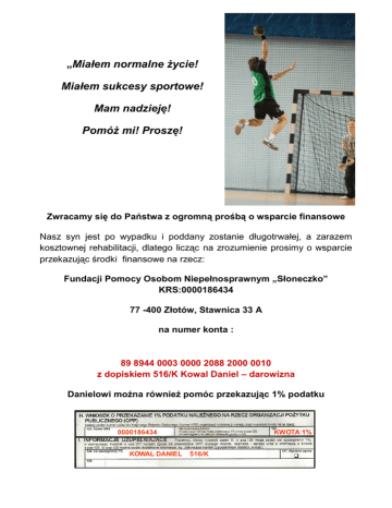 „Miałem normalne życie! Miałem sukcesy sportowe! Mam nadzieję! Pomóż mi! Proszę! Zwracamy się do Państwa z ogromną prośbą o wsparcie finansowe Nasz syn jest po wypadku i poddany zostanie długotrwałej, a zarazem kosztownej rehabilitacji, dlatego licząc na zrozumienie prosimy o wsparcie przekazując środki finansowe na rzecz: Fundacji Pomocy Osobom Niepełnosprawnym „Słoneczko” KRS:0000186434 77 -400 Złotów, Stawnica 33 A na numer konta : 89 8944 0003 0000 2088 2000 0010 z dopiskiem 516/K Kowal Daniel – darowizna Danielowi można również pomóc przekazując 1% podatku 0000186434 KOWAL DANIEL KWOTA 1% 516/K