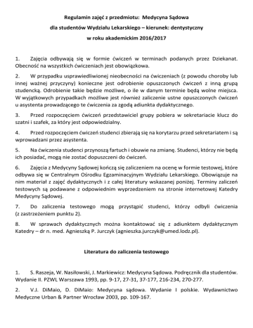 Regulamin zajęć z przedmiotu: Medycyna Sądowa dla studentów Wydziału Lekarskiego – kierunek: dentystyczny w roku akademickim 2016/2017 1. Zajęcia odbywają się w formie ćwiczeń w terminach podanych przez Dziekanat. Obecność na wszystkich ćwiczeniach jest obowiązkowa. 2. W przypadku usprawiedliwionej nieobecności na ćwiczeniach (z powodu choroby lub innej ważnej przyczyny) konieczne jest odrobienie opuszczonych ćwiczeń z inną grupą studencką. Odrobienie takie będzie możliwe, o ile w danym terminie będą wolne miejsca. W wyjątkowych przypadkach możliwe jest również zaliczenie ustne opuszczonych ćwiczeń u asystenta prowadzącego te ćwiczenia za zgodą adiunkta dydaktycznego. 3. Przed rozpoczęciem ćwiczeń przedstawiciel grupy pobiera w sekretariacie klucz do szatni i szafek, za który jest odpowiedzialny. 4. Przed rozpoczęciem ćwiczeń studenci zbierają się na korytarzu przed sekretariatem i są wprowadzani przez asystenta. 5. Na ćwiczenia studenci przynoszą fartuch i obuwie na zmianę. Studenci, którzy nie będą ich posiadać, mogą nie zostać dopuszczeni do ćwiczeń. 6. Zajęcia z Medycyny Sądowej kończą się zaliczeniem na ocenę w formie testowej, które odbywa się w Centralnym Ośrodku Egzaminacyjnym Wydziału Lekarskiego. Obowiązuje na nim materiał z zajęć dydaktycznych i z całej literatury wskazanej poniżej. Terminy zaliczeń testowych są podawane z odpowiednim wyprzedzeniem na stronie internetowej Katedry Medycyny Sądowej. 7. Do zaliczenia testowego mogą przystąpić studenci, którzy odbyli ćwiczenia (z zastrzeżeniem punktu 2). 8. W sprawach dydaktycznych można kontaktować się z adiunktem dydaktycznym Katedry – dr n. med. Agnieszką P. Jurczyk ([email protected]). Literatura do zaliczenia testowego 1. S. Raszeja, W. Nasiłowski, J. Markiewicz: Medycyna Sądowa. Podręcznik dla studentów. Wydanie II. PZWL Warszawa 1993, pp. 9-17, 27-31, 37-177, 216-234, 270-277. 2. V.J. DiMaio, D. DiMaio: Medycyna sądowa. Wydanie I polskie. Wydawnictwo Medyczne Urban & Partner Wrocław 2003, pp. 109-167.