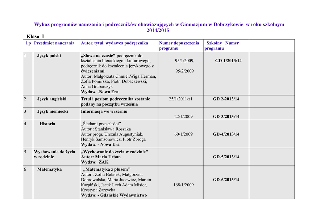 Wykaz programów nauczania i podręczników obowiązujących w Gimnazjum w Dobrzykowie w roku szkolnym 2014/2015 Klasa I l.p Przedmiot nauczania 1 Język polski Autor, tytuł, wydawca podręcznika „Słowa na czasie”-podręcznik do kształcenia literackiego i kulturowego, podręcznik do kształcenia językowego z ćwiczeniami Autor: Małgorzata Chmiel,Wiga Herman, Zofia Pomirska, Piotr. Dobaczewski, Anna Grabarczyk Wydaw. -Nowa Era 2 Język angielski Tytuł i poziom podręcznika zostanie podany na początku września 3 Język niemiecki Informacja we wrześniu 4 5 6 Historia Wychowanie do życia w rodzinie Matematyka „Śladami przeszłości” Autor : Stanisława Roszaka Autor progr. Urszula Augustyniak, Henryk Samsonowicz, Piotr Zbroga Wydaw. - Nowa Era Numer dopuszczenia programu 95/1/2009, GD-1/2013/14 95/2/2009 25/1/2011/z1 GD 2-2013/14 22/1/2009 GD-3/2013\14 60/1/2009 GD-4/2013/14 „Wychowanie do życia w rodzinie” Autor: Maria Urban Wydaw. ŻAK „Matematyka z plusem” Autor : Zofia Bolałek, Małgorzata Dobrowolska, Marta Jucewicz, Marcin Karpiński, Jacek Lech Adam Misior, Krystyna Zarzycka Wydaw. - Gdańskie Wydawnictwo Szkolny Numer programu GD-5/2013/14 GD-6/2013/14 168/1/2009 oświatowe Podręcznik + zbiór zadań 7 Fizyka „Świat fizyki” część I Autor : Barbara Sagnowska Wydaw. - Zamkor podręcznik 8 Chemia „Chemia nowej ery” Autor: Teresa Kulawik, Maria Litwin podręcznik + zeszyt ćwiczeń 9 Biologia „Puls życia”- podręcznik Autor: Małgorzata Jetimow, Marian Sęktas Wydaw. - Nowa Era 10 11 12 13 14 Geografia Informatyka Muzyka Religia Zajęcia Techniczne „Puls ziemi” Autor: Roman Malarz Wydaw. - Nowa Era „Informatyka Europejczyka”(Wydanie II -Edycja :Windows Vista,Linux Ubuntu,MS Office 2007) Autor: Jolanta Pańczyk Wydaw.- Helion „Muzyka” Autor: Krystyna Serwańska Wydaw.- OPERON „Szukam Was I” Wydaw. WAM Zajęcia mechaniczno -motoryzacyjne Wydaw. Nowa Era 11/1/2009 GD-7/2013/14 49/1/2009 GD-8/2013/14 58/1/2009 GD-9/2013/14 5/1/2009 GD-10/2013/14 75/2009 GD-11/2013/14 GD-12/2013/14 GD-14/2013/14