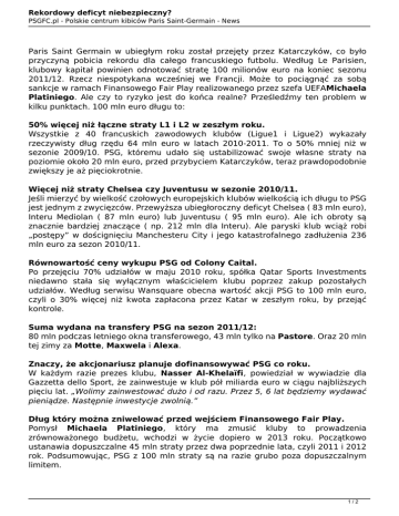 Rekordowy deficyt niebezpieczny? PSGFC.pl - Polskie centrum kibiców Paris Saint-Germain - News Paris Saint Germain w ubiegłym roku został przejęty przez Katarczyków, co było przyczyną pobicia rekordu dla całego francuskiego futbolu. Według Le Parisien, klubowy kapitał powinien odnotować stratę 100 milionów euro na koniec sezonu 2011/12. Rzecz niespotykana wcześniej we Francji. Może to pociągnąć za sobą sankcje w ramach Finansowego Fair Play realizowanego przez szefa UEFAMichaela Platiniego. Ale czy to ryzyko jest do końca realne? Prześledźmy ten problem w kilku punktach. 100 mln euro długu to: 50% więcej niż łączne straty L1 i L2 w zeszłym roku. Wszystkie z 40 francuskich zawodowych klubów (Ligue1 i Ligue2) wykazały rzeczywisty dług rzędu 64 mln euro w latach 2010-2011. To o 50% mniej niż w sezonie 2009/10. PSG, któremu udało się ustabilizować swoje własne straty na poziomie około 20 mln euro, przed przybyciem Katarczyków, teraz prawdopodobnie zwiększy je aż pięciokrotnie. Więcej niż straty Chelsea czy Juventusu w sezonie 2010/11. Jeśli mierzyć by wielkość czołowych europejskich klubów wielkością ich długu to PSG jest jednym z zwycięzców. Przewyższa ubiegłoroczny deficyt Chelsea ( 83 mln euro), Interu Mediolan ( 87 mln euro) lub Juventusu ( 95 mln euro). Ale ich obroty są znacznie bardziej znaczące ( np. 212 mln dla Interu). Ale paryski klub wciąż robi „postępy” w doścignięciu Manchesteru City i jego katastrofalnego zadłużenia 236 mln euro za sezon 2010/11. Równowartość ceny wykupu PSG od Colony Caital. Po przejęciu 70% udziałów w maju 2010 roku, spółka Qatar Sports Investments niedawno stała się wyłącznym właścicielem klubu poprzez zakup pozostałych udziałów. Według serwisu Wansquare obecna wartość akcji PSG to 100 mln euro, czyli o 30% więcej niż kwota zapłacona przez Katar w zeszłym roku, by przejąć kontrole. Suma wydana na transfery PSG na sezon 2011/12: 80 mln podczas letniego okna transferowego, 43 mln tylko na Pastore. Oraz 20 mln tej zimy za Motte, Maxwela i Alexa. Znaczy, że akcjonariusz planuje dofinansowywać PSG co roku. W każdym razie prezes klubu, Nasser Al-Khelaïfi, powiedział w wywiadzie dla Gazzetta dello Sport, że zainwestuje w klub pół miliarda euro w ciągu najbliższych pięciu lat. „Wolimy zainwestować dużo i od razu. Przez 5, 6 lat będziemy wydawać pieniądze. Następnie inwestycje zwolnią.” Dług który można zniwelować przed wejściem Finansowego Fair Play. Pomysł Michaela Platiniego, który ma zmusić kluby to prowadzenia zrównoważonego budżetu, wchodzi w życie dopiero w 2013 roku. Początkowo ustanawia dopuszczalne 45 mln straty przez dwa poprzednie lata, czyli 2011 i 2012 rok. Podsumowując, PSG z 100 mln straty są na razie grubo poza dopuszczalnym limitem. 1/2 Rekordowy deficyt niebezpieczny? PSGFC.pl - Polskie centrum kibiców Paris Saint-Germain - News Na szczęście Fair Play nie przewiduje sankcji finansowych przed następną kontrolą w 2014 roku, który nadal pozwala na maksymalną łączną stratę 45 mln… ale w trzech poprzednich sezonach. Oznaczało by to, że PSG powinno odnotować zysk 55 mln euro w ciągu dwóch sezonów aby temu sprostać. Jest to nierealne! Już sama zapowiedź prezesa w GdS o planie pięcioletnich wydatków przekreśla wszelkie nadzieje. Ale nałożona przez UEFA dyscyplina wzrośnie później do maksymalnej straty, która wynosi do 30 mln w ciągu trzech lat, a następnie do 5 mln do 2018 roku. Czy to oznacza, że PSG może nie uniknąć kary? Nic nie jest pewne. Ponieważ sankcje są w rzeczywistości jeszcze nieokreślone. I groźba wykluczenia z europejskich rozgrywek może nastąpić dopiero po długiej serii wezwań do porządku. „Stopniowa reakcja, która opierać się będzie bardziej na straszeniu. Tak by nie musieć wymierzać kary.” – prorokuje Philippe Diallo, szef Związku Profesjonalnych Klubów Piłkarskich (UCPF). Autor: 2/2 Powered by TCPDF (www.tcpdf.org)