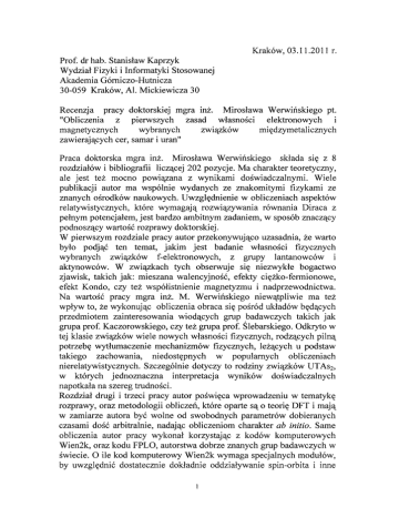 Kraków, 03.11.2011 r. Prof. dr hab. Stanisław Kaprzyk Wydział Fizyki i Informatyki Stosowanej Akademia Górniczo-Hutnicza 30-059 Kraków, Al. Mickiewicza 30 Recenzja pracy doktorskiej mgra inż. Mirosława Werwińskiego pt. "Obliczenia z pierwszych zasad własności elektronowych i magnetycznych wybranych związków międzymetalicznych zawierających cer, samar i uran" Praca doktorska mgra inż. Mirosława Werwińskiego składa się z 8 rozdziałów i bibliografii liczącej 202 pozycje. Ma charakter teoretyczny, ale jest też mocno powiązana z wynikami doświadczalnymi. Wiele publikacji autor ma wspólnie wydanych ze znakomitymi fizykami ze znanych ośrodków naukowych. Uwzględnienie w obliczeniach aspektów relatywistycznych, które wymagają rozwiązywania równania Diraca z pełnym potencjałem, jest bardzo ambitnym zadaniem, w sposób znaczący podnoszący wartość rozprawy doktorskiej. W pierwszym rozdziale pracy autor przekonywująco uzasadnia, że warto było podjąć ten temat, jakim jest badanie własności fizycznych wybranych związków f-elektronowych, z grupy lantanowców i aktynowców. W związkach tych obserwuje się niezwykłe bogactwo zjawisk, takich jak: mieszana walencyjność, efekty ciężko- fennionowe, efekt Kondo, czy też współistnienie magnetyzmu i nadprzewodnictwa. Na wartość pracy mgra inż. M. Werwińskiego niewątpliwie ma też wpływ to, że wykonując obliczenia obraca się pośród układów będących przedmiotem zainteresowania wiodących grup badawczych takich jak grupa prof. Kaczorowskiego, czy też grupa prof. Ślebarskiego. Odkryto w tej klasie związków wiele nowych własności fizycznych, rodzących pilną potrzebę wytłumaczenie mechanizmów fizycznych, leżących u podstaw takiego zachowania, niedostępnych w popularnych obliczeniach nierelatywistycznych. Szczególnie dotyczy to rodziny związków UTAs2 , w których jednoznaczna interpretacja wyników doświadczalnych napotkała na szereg trudności. Rozdział drugi i trzeci pracy autor poświęca wprowadzeniu w tematykę rozprawy, oraz metodologii obliczeń, które oparte są o teorię DFT i mają w zamiarze autora być wolne od swobodnych parametrów dobieranych czasami dość arbitralnie, nadając obliczeniom charakter ab initio. Same obliczenia autor pracy wykonał korzystając z kodów komputerowych Wien2k, oraz kodu FPLO, autorstwa dobrze znanych grup badawczych w świecie. O ile kod komputerowy Wien2k wymaga specjalnych modułów, by uwzględnić dostatecznie dokładnie oddziaływanie spin-orbita i inne efekty relatywistyczne, o tyle kod FPLO jest relatywistycznie spójnym, rozwiązującym równanie Diraca. Szkoda, że tę kwestię odwołującą się do pełnego równania Diraca autor pominął milczeniem, a bez której rozdział trzeci jest dość typowym streszczeniem metodologii stosowanej w obliczeniach nierelatywistycznych od szeregu lat. Rozdział czwarty autor rozprawy poświęca rodzinie związków UTAs2, gdzie w miejsce T występuje Cu, Co, Ni, lub Pd. W związkach tych, ze względu na silnie skorelowany charakter elektronów w powłokach 5f(U) i powłokach 3d(T), uzyskanie wiarygodnych wyników wymaga od obliczeń uwzględnienia oddziaływań kulombowskich, oraz wymiany, wychodzących znacznie poza zakres stosowalności tylko teorii DFT w jej jednocząstkowym wydaniu. Aby uzyskać prawidłowy opis struktury magnetycznej, autor wykonał szereg obliczeń dla różnych wyborów nierównoważnych położeń atomów, dobierając odpowiednie superkomórki. Z porównania energii całkowitych otrzymanych z obliczeń samozgodnych dla różnych konfiguracji magnetycznych, autor wnioskował o zgodności wyników teoretycznych z eksperymentalnymi. Ten sposób postępowania niewątpliwie wpisuje się w scenariusz ab initio. Wśród porównywanych wielkości, kluczową rolę odgrywa tutaj moment magnetyczny atomów, a szczególnie moment na atomach U. Rozdział czwarty to najobszemiejsza cześć rozprawy. Zamieszcza w niej autor, na niemalże stu stronach, historyczną wiedzę na temat badanych związków, wyniki doświadczalne dotyczące struktury krystalicznej i magnetycznej; główne źródła tych danych to prace Kaczorowskiego, Ślebarskiego i współpracowników. W pierwszej części rozdziału czwartego autor prezentuje szczegółowo wyniki obliczeń dla związku UCuAs 2• Obliczenia zostały wykonane kodem Wien2k, z potencjałem efektywnym w przybliżeniu PBE, a także PBE+U i PBE+OP. Znamiennym dla tych związków jest duży moment orbitalny, kompensujący przeciwnie skierowany moment spinowy. Temu atrakcyjnemu faktowi autor jednakże nie poświęca specjalnej uwagi, czego można by oczekiwać po tym, że oddziaływanie spin-orbita odgrywać musi tutaj kluczową rolę. Mimo tej uwagi o krytycznym zabarwieniu, oceniam ten rozdział rozprawy bardzo wysoko. Wyniki obliczeń struktury elektronowej dla tego związku są w zestawieniu z wcześniejszymi publikacjami dużo pełniejsze, bo pozbawione wielu przybliżeń wymuszonych w przeszłości możliwościami technicznymi, a dotyczącymi kształtu potencjału i ograniczeń samej metody LMTO. Uzyskana dobra zgodność momentów magnetycznych na uranie z wartościami doświadczalnymi, przy odpowiednio dobranych poprawkach na wielocząstkowe oddziaływania kulombowskie i wymiany, uważam za wynik wartościowy, ustanawiający pewien standard przy konstruowaniu potencjału efektywnego, adekwatnie opisującego złożone zachowanie się 2 elektronów w tej klasie związków. Można mieć w tym miejscu pewne zastrzeżenia, co do określania dalej tej metodologii, jako ab initio, Tym niemniej, wobec faktu, że posługując się tak uwiarygodnionym potencjałem autor uzyskał szczegółowy przebieg pasm energetycznych, widma gęstości stanów, ukształtowanie płatów powierzchni Fermiego oraz przestrzenne rozkłady gęstości ładunku i spinowych, znaczenie tych wyników ma ze wszech miar znaczenie fundamentalne i charakter jak najbar