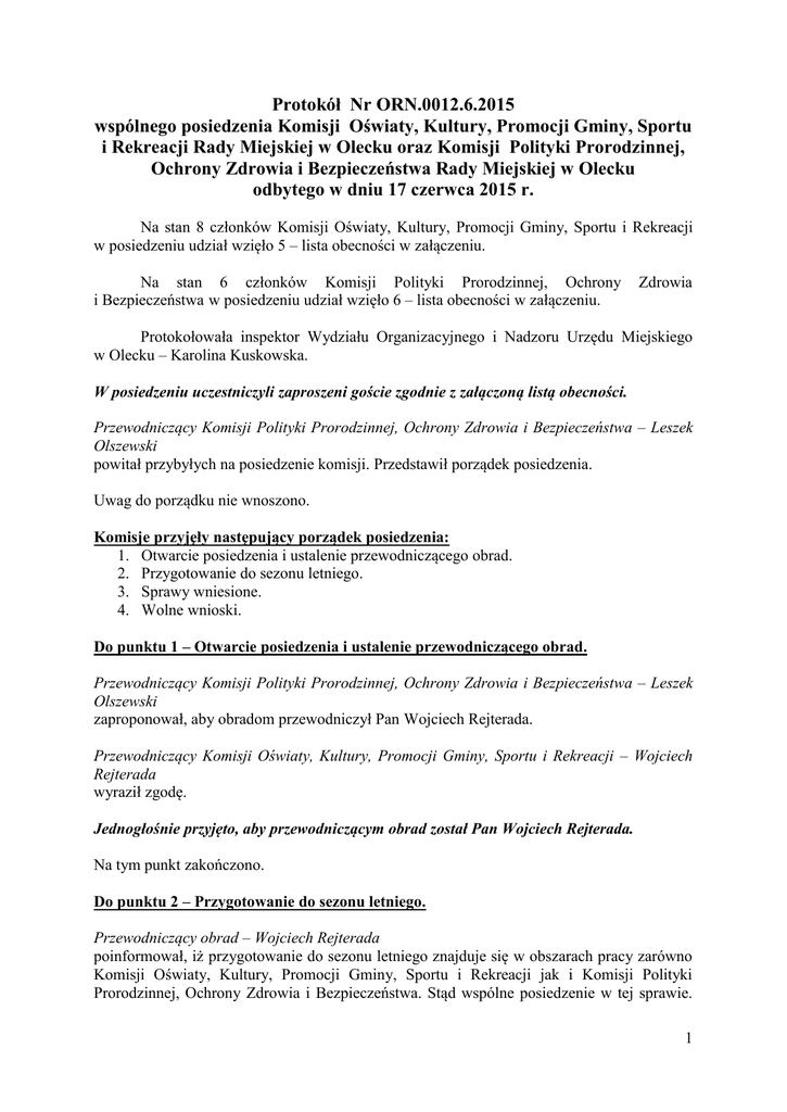 Protokół Nr ORN.0012.6.2015 wspólnego posiedzenia Komisji Oświaty, Kultury, Promocji Gminy, Sportu i Rekreacji Rady Miejskiej w Olecku oraz Komisji Polityki Prorodzinnej, Ochrony Zdrowia i Bezpieczeństwa Rady Miejskiej w Olecku odbytego w dniu 17 czerwca 2015 r. Na stan 8 członków Komisji Oświaty, Kultury, Promocji Gminy, Sportu i Rekreacji w posiedzeniu udział wzięło 5 – lista obecności w załączeniu. Na stan 6 członków Komisji Polityki Prorodzinnej, Ochrony i Bezpieczeństwa w posiedzeniu udział wzięło 6 – lista obecności w załączeniu. Zdrowia Protokołowała inspektor Wydziału Organizacyjnego i Nadzoru Urzędu Miejskiego w Olecku – Karolina Kuskowska. W posiedzeniu uczestniczyli zaproszeni goście zgodnie z załączoną listą obecności. Przewodniczący Komisji Polityki Prorodzinnej, Ochrony Zdrowia i Bezpieczeństwa – Leszek Olszewski powitał przybyłych na posiedzenie komisji. Przedstawił porządek posiedzenia. Uwag do porządku nie wnoszono. Komisje przyjęły następujący porządek posiedzenia: 1. Otwarcie posiedzenia i ustalenie przewodniczącego obrad. 2. Przygotowanie do sezonu letniego. 3. Sprawy wniesione. 4. Wolne wnioski. Do punktu 1 – Otwarcie posiedzenia i ustalenie przewodniczącego obrad. Przewodniczący Komisji Polityki Prorodzinnej, Ochrony Zdrowia i Bezpieczeństwa – Leszek Olszewski zaproponował, aby obradom przewodniczył Pan Wojciech Rejterada. Przewodniczący Komisji Oświaty, Kultury, Promocji Gminy, Sportu i Rekreacji – Wojciech Rejterada wyraził zgodę. Jednogłośnie przyjęto, aby przewodniczącym obrad został Pan Wojciech Rejterada. Na tym punkt zakończono. Do punktu 2 – Przygotowanie do sezonu letniego. Przewodniczący obrad – Wojciech Rejterada poinformował, iż przygotowanie do sezonu letniego znajduje się w obszarach pracy zarówno Komisji Oświaty, Kultury, Promocji Gminy, Sportu i Rekreacji jak i Komisji Polityki Prorodzinnej, Ochrony Zdrowia i Bezpieczeństwa. Stąd wspólne posiedzenie w tej sprawie. 1 Na dzisiejsze posiedzenie zostali zaproszeni przedstawiciele najważniejszych instytucji i organizacji, kompetentnych w zakresie przygotowania do sezonu letniego. Zaproponował, aby każdy z obecnych gości przedstawił krótkie informacje na przedmiotowy temat, natomiast członkowie komisji na bieżąco będą zadawali pytania. Pan Radosław Skrocki – Dyrektor Regionalnego Ośrodka Kultury w Olecku „Mazury Garbate” poinformował o najbliższych planowanych imprezach Regionalnego Ośrodka Kultury w Olecku – „Mazury Garbate”: W dniu 25 czerwca o godzinie 17.00 w Oleckiej Izbie Historycznej odbędzie się spotkanie z dr Rafałem Żytyńcem pt. Ełk. Na tyłach historii czy w centrum nowoczesności. W dniach 26-27 czerwca na Plaży Miejskiej „Skocznia" odbędzie się 1 Przegląd Zespołów Amatorskich "LegaFest". Program: 26 czerwca (piątek) 20.00 - koncert zespołu Legarytmy + goście 22.00 - nocny jam muzyczny 27 czerwca (sobota) 15.00 - przesłuchania konkursowe 21.0 - Gwiazda Wieczoru legenda punk rocka - MOSKWA W dniach 17-19 lipca odbędzie się 22. Przystanek Olecko. Tegoroczny Przystanek Olecko zaplanowano na 17-18 lipca, natomiast w dniu 19 lipca odbędzie się towarzysząca mu impreza - trzecia edycja "Festiwalu jednego instrumentu". W tym roku przewodnim instrumentem będzie trąbka. Program: 17 lipca 15:00 - Konjo Multimedia Show (sala kina „Mazur"): - promocja najnowszej książki Pawła Konnaka pt. KSIĘGOWY TAŃCZY - wykład na temat podziemnej X Muzy - pokaz filmów: DEZERTER - NIE MA ZAGROŻENIA oraz KONJO - 30 LAT W KOSMOSIE 17:00 - otwarcie wystawy „Salvador Dali Grafika" (Galeria Prawdziwej Sztuki im. A. Legusa) 19:30 - Natalia Przybysz 21:00 - Łąki Łan 22:30 - Elektryczne Gitary 18 lipca 19:30 - Janusz Panasewicz - solo 21:00 - Kazik & Kwartet Proforma 23:00 - DAAB 23:55 - koncert „Muzyka Sfer" (Plaża Miejska - Skocznia) 19 lipca - III Festiwal Jednego Instrumentu(trąbka) 19:30-Maciej Fortuna 20:45-New Bonę 21:15-Sokół Orchester 2 W dniach 24-26 lipca w sali AGT odbędzie się Festiwal Teatralny HIMERA. W dniach 31 lipca - 2 sierpnia na Placu Wolności odbędą się XVIII Międzynarodowe Mazurskie Spotkania z Folklorem. Wystąpią zespoły: Folkdance Group "Tijl Uylenspiegel" - Belgia Folkdance Group KUD "Dragan Markovic" - Serbia Folk Dance Ensemble "MARINA" - Słowacja Folk Dance Group "UHOT" - Turcja Zespół Pieśni i Tańca Ziemia Beskidzka - Polska W dniu 2 sierpnia odbędą się Swojskie spotkania, w tym występy chórów i zespołów śpiewaczych, przyjaciół Oleckiego Echa. W dniu 16 sierpnia od godziny 15.00 na Placu Wolności odbędzie się 1 Oleckie Święto Mleka i Miodu. Ramowy program: godz. 15.00-21.00 - kiermasz produktów od godz. 15.00 - blok zabaw dla dzieci godz. 16.00 - 21.00 - koncerty Pan Radosław Skrocki zwrócił uwagę na problem dotyczący Centrum Informacji Turystycznej, które funkcjonuje przy Regionalnym Ośrodku Kultury. Wyjaśnił, że program, w ramach którego Centrum powstało nie był do końca przemyślany. Ma na myśli np. sytuację, w której turysta przychodzący do Centrum chce kupić znaczek lub pocztówkę i nie może tego zrobić. Musi w tym celu udać się do budynku ROK, ponieważ w Centrum nie można prowadzić żadnej sprzedaży. Jest to sytuacja stwarzająca niezadowolenie wśród mieszkańców i turystów. Program obowiązuje jeszcze przez dwa lata i niestety w tym czasie nic nie można zrobić w tym zakresie. Mówi o tym, aby osoby, do których dotrą informacje o takich sytuacjach nie były zdziwione. Przewodniczący obrad – Wojciech Rejterada zapytał, czy Pan Dyrektor widzi rozwiązanie tego problemu. Pan Radosław Skrocki odpowiedział, że jest to skomplikowane. Program w całej Polsce wszedł w pośpiechu, przez co są takie niedoskonałości. Trzeba przestrzegać wymogów, które zostały określone w programie, nikt nie ma na to wpływu. Osobiście nie postawiłby Centrum w miejscu, w którym 