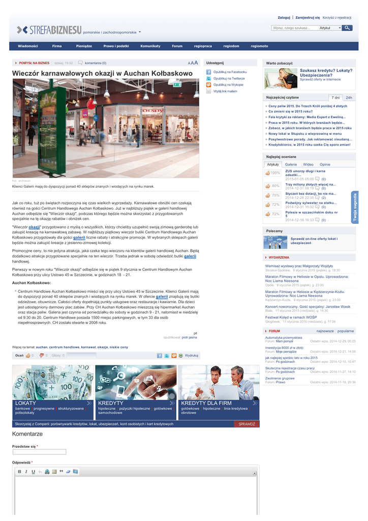 Zaloguj Zarejestruj się Korzyści z rejestracji Wpisz, czego szukasz... Artykuł pomorskie i zachodniopomorskie Wiadomości Firma POMYSŁ NA BIZNES dzisiaj, 19:32 Pieniądze Prawo i podatki Komunikaty Forum regiopraca A A A komentarze (0) Wieczór karnawałowych okazji w Auchan Kołbaskowo regiodom Udostępnij regiomoto Warto zobaczyć Szukasz kredytu? Lokaty? Ubezpieczenia? Opublikuj na Facebooku Opublikuj na Twitterze Sprawdź oferty w internecie Opublikuj na Wykopie Wyślij link mailem Najczęściej czytane 7 dni 24h Ceny paliw 2015. Do Trzech Króli poniżej 4 złotych Co zmieni się w 2015 roku? Fala krytyki za reklamy: Media Expert z Eweliną... Praca w 2015 roku. W których branżach będzie... Zobacz, w jakich branżach będzie praca w 2015 roku Nowy lokal w Słupsku z wieprzowiną w menu Posylwestrowe porady. Jak reklamować nieudaną... Kredytobiorco, w 2015 roku czeka Cię sporo zmian! Najlepiej oceniane Artykuły 100% Fot.: archiwum Klienci Galerii mają do dyspozycji ponad 40 sklepów znanych i wiodących na rynku marek. Jak co roku, tuż po świętach rozpoczyna się czas wielkich wyprzedaży. Karnawałowe obniżki cen czekają również na gości Centrum Handlowego Auchan Kołbaskowo. Już w najbliższy piątek w galerii handlowej Auchan odbędzie się "Wieczór okazji", podczas którego będzie można skorzystać z przygotowanych specjalnie na tę okazję rabatów i obniżek cen. "Wieczór okazji" przygotowano z myślą o wszystkich, którzy chcieliby uzupełnić swoją zimową garderobę lub zakupić kreację na karnawałową zabawę. W najbliższy piątkowy wieczór butiki Centrum Handlowego Auchan Kołbaskowo przygotowały dla gości galerii liczne rabaty i atrakcyjne promocje. W wybranych sklepach galerii będzie można zakupić kreacje z jesienno-zimowej kolekcji. Promocyjne ceny, to nie jedyna atrakcja, jaka czeka tego wieczoru na klientów galerii handlowej Auchan. Będą dodatkowo atrakcje przygotowane specjalnie na ten wieczór. Trzeba jednak w sobotę odwiedzić butiki galerii handlowej. Galerie Wideo Opinie ZUS umorzy długi i karne odsetki.... 2015-01-05 05:00 (0) 80% Trzy miliony złotych więcej na... 2014-12-31 08:19 (0) 75% Styczeń bez dotacji, bo nie ma... 2014-12-28 22:35 (2) 72% Podwójny sylwester na statku... 2014-12-31 10:32 (0) 72% Polesie w szczecińskim doku nr 5 2014-12-18 16:33 (0) Polecamy Sprawdź on-line oferty lokat i ubezpieczeń WYDARZENIA Wernisaż wystawy prac Małgorzaty Wojdyło Pierwszy w nowym roku "Wieczór okazji" odbędzie się w piątek 9 stycznia w Centrum Handlowym Auchan Kołbaskowo przy ulicy Ustowo 45 w Szczecinie, w godzinach 18 - 21. Auchan Kołbaskowo: pit opublikował: piotr jasina Więcej na temat: auchan, centrum handlowe, karnawał, okazje, niskie ceny 0 0 Maraton Filmowy w Heliosie w Opolu. Uprowadzona: Noc Liama Neesona Opole, 9 stycznia 2015 (piątek), g. 23:00 Centrum Handlowe Auchan Kołbaskowo mieści się przy ulicy Ustowo 45 w Szczecinie. Klienci Galerii mają do dyspozycji ponad 40 sklepów znanych i wiodących na rynku marek. W ofercie galerii znajdują się butiki odzieżowe, obuwnicze. Całości oferty dopełniają punkty usługowe oraz restauracje i kawiarnie. Dla dzieci jest udostępniony darmowy plac zabaw. Przy CH Auchan Kołbaskowo mieszczą się hipermarket Auchan oraz stacja paliw. Galeria jest czynna od poniedziałku do soboty w godzinach 9 - 21, natomiast w niedzielę od 9:30 do 20. Centrum Handlowe posiada 1500 miejsc parkingowych, w tym 33 dla osób niepełnosprawnych. CH zostało otwarte w 2008 roku. Oceń Strzelce Opolskie, 9 stycznia 2015 (piątek), g. 18:30 Głosy: 0 Wydrukuj Maraton Filmowy w Heliosie w Kędzierzynie-Koźlu. Uprowadzona: Noc Liama Neesona Kędzierzyn-Koźle, 9 stycznia 2015 (piątek), g. 23:00 Koncert noworoczny. Gość specjalny: Jarosław Wasik Biała, 11 stycznia 2015 (niedziela), g. 14:30 Festiwal Kolęd w ramach WOŚP Głogówek, 11 stycznia 2015 (niedziela), g. 17:00 FORUM najnowsze popularne Automatyka przemysłowa Forum: Mam pomysł Ostatni wpis: 2014-12-29, 00:25 Inwestycja 8000 zł w złoto Forum: Moje pieniądze Ostatni wpis: 2014-12-21, 14:58 jak najlepiej spedzic lato w roku 2015 Forum: Po godzinach Ostatni wpis: 2014-12-15, 10:47 Skuteczna rejestracja czasu pracy Forum: Po godzinach Ostatni wpis: 2014-11-27, 14:10 Zwolnienie grupowe Forum: Prawo LOKATY KREDYTY KREDYTY DLA FIRM bankowe | progresywne | strukturyzowane | polisolokaty hipoteczne | pożyczki hipoteczne | gotówkowe | samochodowe gotówkowe | hipoteczne | linia kredytowa | obrotowe Skorzystaj z Comperii: porównywarki kredytów, lokat, ubezpieczeń, kont osobistych i kart kredytowych Komentarze Przedstaw się * Odpowiedź * Ostatni wpis: 2014-11-18, 20:36 By submitting this form, you accept the Mollom privacy policy. Zachowaj Podgląd Oferty Nie chodź po bankach. Mamy ich oferty Wiadomości Firma POŻYCZKA na wyciągnięcie ręki! Pieniądze Prawo i podatki Komunikaty Forum regiopraca regiodom regiomoto Promocje Stwórz perfekcyjny makijarz w dowolnych kolorach Zacznij wspaniały dzień z kubkiem artomatycznej kawy. Sprawdź te oferty Eleganckie zestawy, przydatne każdemu koneserowi wina Dbaj o kondycję przez cały rok. Zainwestuj w stabilne i wygodne obuwie do biegania Niezwykle przyjemna w dotyku pościel, która zapewni Ci wysoki komfort w czasie snu Pozwól sobie na odrobinę szaleństwa i otul się zapachem o jakim zawsze marzyłaś! Gustowne koszule w których każdy mężczyzna będzie wyglądał pociągająco. O nas Regulamin Pomoc Redakcja Reklama Polityka dotycząca plików cookie Copyright (c) 2015 Media Regionalne Korzystając ze strony, wyrażasz zgodę na używanie cookie. Przeczytaj więcej. ZAMKNIJ X