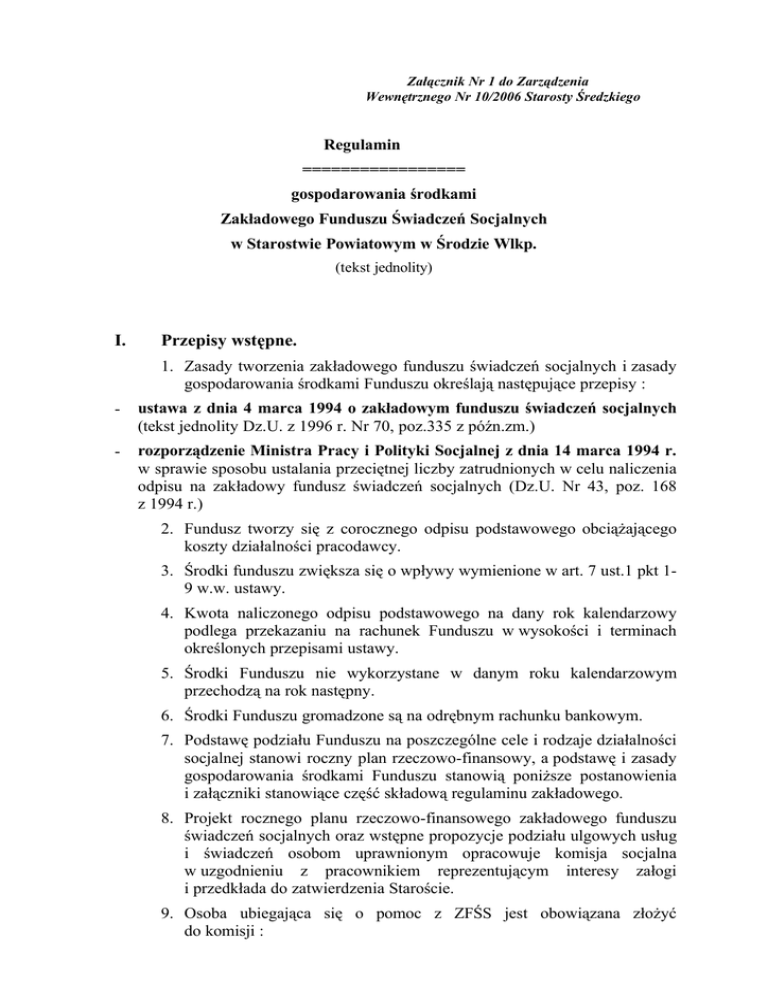 Załącznik Nr 1 do Zarządzenia Wewnętrznego Nr 10/2006 Starosty Średzkiego Regulamin ================= gospodarowania środkami Zakładowego Funduszu Świadczeń Socjalnych w Starostwie Powiatowym w Środzie Wlkp. (tekst jednolity) I. Przepisy wstępne. 1. Zasady tworzenia zakładowego funduszu świadczeń socjalnych i zasady gospodarowania środkami Funduszu określają następujące przepisy : - ustawa z dnia 4 marca 1994 o zakładowym funduszu świadczeń socjalnych (tekst jednolity Dz.U. z 1996 r. Nr 70, poz.335 z p…źn.zm.) - rozporządzenie Ministra Pracy i Polityki Socjalnej z dnia 14 marca 1994 r. w sprawie sposobu ustalania przeciętnej liczby zatrudnionych w celu naliczenia odpisu na zakładowy fundusz świadczeń socjalnych (Dz.U. Nr 43, poz. 168 z 1994 r.) 2. Fundusz tworzy się z corocznego odpisu podstawowego obciążającego koszty działalności pracodawcy. 3. Środki funduszu zwiększa się o wpływy wymienione w art. 7 ust.1 pkt 19 w.w. ustawy. 4. Kwota naliczonego odpisu podstawowego na dany rok kalendarzowy podlega przekazaniu na rachunek Funduszu w wysokości i terminach określonych przepisami ustawy. 5. Środki Funduszu nie wykorzystane w danym roku kalendarzowym przechodzą na rok następny. 6. Środki Funduszu gromadzone są na odrębnym rachunku bankowym. 7. Podstawę podziału Funduszu na poszczeg…lne cele i rodzaje działalności socjalnej stanowi roczny plan rzeczowo-finansowy, a podstawę i zasady gospodarowania środkami Funduszu stanowią poniższe postanowienia i załączniki stanowiące część składową regulaminu zakładowego. 8. Projekt rocznego planu rzeczowo-finansowego zakładowego funduszu świadczeń socjalnych oraz wstępne propozycje podziału ulgowych usług i świadczeń osobom uprawnionym opracowuje komisja socjalna w uzgodnieniu z pracownikiem reprezentującym interesy załogi i przedkłada do zatwierdzenia Staroście. 9. Osoba ubiegająca się o pomoc z ZFŚS jest obowiązana złożyć do komisji : - 2 - wniosek o przyznanie pomocy finansowej, wypełniony według wzoru załączonego do regulaminu, z opisaniem sytuacji życiowej i rodzinnej oraz z wyliczoną wysokością dochodu na osobę w rodzinie. - oświadczenie o wysokości dochod…w – doch…d oblicza się uwzględniając dochody brutto wszystkich członk…w rodziny prowadzących wsp€lne gospodarstwo domowe 10. Obowiązek składania oświadczenia o wysokości dochodu na osobę w rodzinie nie dotyczy os…b ubiegających się o świadczenia pełnopłatne. II. Przeznaczenie Zakładowego Funduszu Świadczeń Socjalnych. 1. Środki funduszu świadczeń socjalnych przeznacza się na : a) dofinansowywanie krajowego wypoczynku urlopowego organizowanego we własnym zakresie przez osobę uprawnioną po wykorzystaniu urlopu wypoczynkowego – nie mniej niż 14 kolejnych dni kalendarzowych, b) finansowanie i dofinansowanie działalności kulturalnooświatowej, sportowo-rekreacyjnej zwłaszcza poprzez: - zakup bilet€w na imprezy, - organizację ogniska, kuligu, grzybobrania, - organizację imprez : świąteczno-noworocznej i rekreacyjnej, połączonych z zakupem symbolicznych upomink€w oraz organizacją skromnych poczęstunk…w, - zorganizowanie imprezy dla dzieci do lat 15 z okazji Dnia Dziecka lub zakup paczek dla dzieci, - zakup upomink€w z okazji Dnia Kobiet, - zakup kwiat€w dla pracownik€w z ok. jubileuszu pracy i przejścia na emeryturę. c) pomoc rzeczową i finansową Pomoc finansowa przyznawana jest: - w zakresie spraw zdrowotnych (konieczność przeprowadzenia drogiego badania lekarskiego, zakup drogich lekarstw, zakup sprzętu rehabilitacyjnego, dofinansowanie pobytu w sanatorium), - w przypadku indywidualnych zdarzeń losowych, - w szczeg…lnie trudnej sytuacji życiowej, rodzinnej i materialnej os…b uprawnionych. d) zwrotną pomoc na cele mieszkaniowe na warunkach określonych w dalszych postanowieniach regulaminu i w umowie zawieranej przez zakład pracy z pożyczkobiorcą, - 3 - III. Osoby uprawnione do korzystania z Zakładowego Funduszu Świadczeń Socjalnych. 1. Uprawnieni do korzystania z zakładowego Funduszu są : a) pracownicy zatrudnieni na czas nieokreślony i określony na podstawie umowy o pracę, powołania, wyboru, mianowania, w pełnym i niepełnym wymiarze czasu pracy i ich rodziny (wsp…lnie zamieszkujący i prowadzący wsp…lnie gospodarstwo domowe), b) emeryci, renciści zamieszkujący, i członkowie ich rodzin wsp…lnie c) pracownicy przebywający na urlopie wychowawczym, d) pracownicy odbywający staż lub przyuczenie do zawodu. 2. Do pomocy ze środk…w Funduszu przeznaczonej na cele mieszkaniowe uprawnieni są pracownicy zatrudnieni na czas nieokreślony. 3. Pracownicy wymienieni w ppkt 1d) uprawnieni są ze świadczeń określonych w pkt II ppkt 1b). IV. do korzystania Zasady i warunki przyznawania świadczeń socjalnych. 1. Przyznanie i wysokość pomocy ze środk…w Funduszu uzależniona jest od sytuacji życiowej, rodzinnej i materialnej. 2. Pomoc finansowa przyznawana jest na wniosek zainteresowanych os€b uprawnionych. Pomoc finansowa przyznawana jest: - w zakresie spraw zdrowotnych (po przedstawieniu skierowania lekarskiego lub rachunk€w z apteki) oraz w przypadku indywidualnych zdarzeń losowych według następujących zasad: osobom samotnym, o dochodzie nieprzekraczającym 180% minimalnego wynagrodzenia za pracę, w wysokości do 120% tego wynagrodzenia osobom posiadającym rodzinę, kt…rych doch…d na członka rodziny nie przekracza 80% minimalnego wynagrodzenia za pracę, w wysokości do 80% tego wynagrodzenia, w szczeg…lnie trudnej sytuacji życiowej, rodzinnej i materialnej os€b uprawnionych – do wysokości 70% minimalnego wynagrodzenia za pracę, na każdą osobę uprawnioną. W przypadku ubiegania się o pomoc finansową w zakresach wyżej wymienionych podstawą ustalenia średniego dochodu przypadającego na członka rodziny są łączne dochody brutto rodziny uzyskane w ostatnich trzech miesiącac