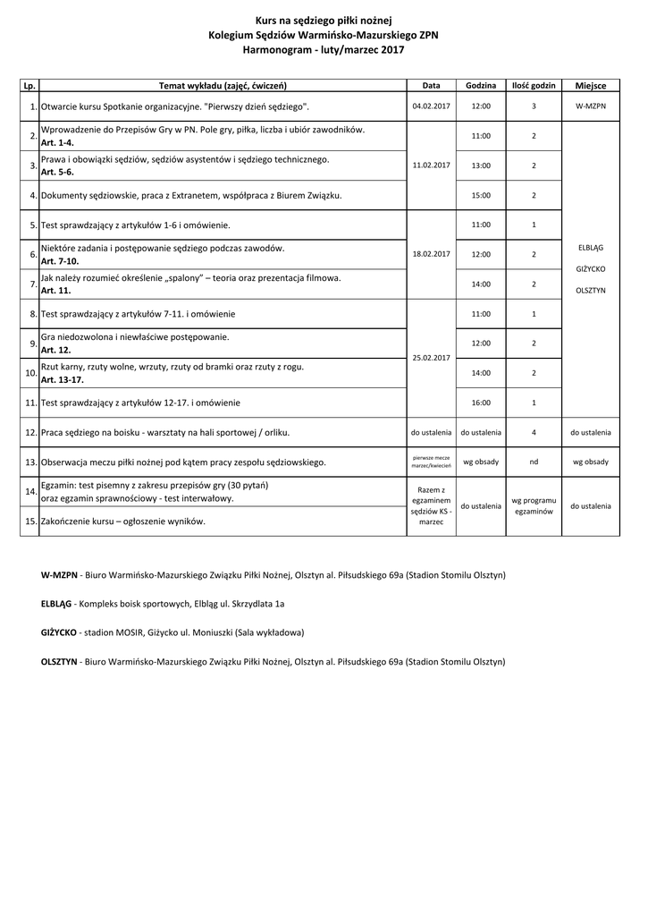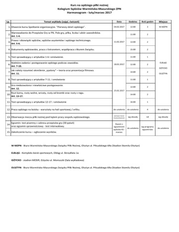 Kurs na sędziego piłki nożnej Kolegium Sędziów Warmińsko-Mazurskiego ZPN Harmonogram - luty/marzec 2017 Lp. Temat wykładu (zajęć, ćwiczeń) Data Godzina Ilość godzin Miejsce 04.02.2017 12:00 3 W-MZPN 11:00 2 13:00 2 4. Dokumenty sędziowskie, praca z Extranetem, współpraca z Biurem Związku. 15:00 2 5. Test sprawdzający z artykułów 1-6 i omówienie. 11:00 1 12:00 2 Jak należy rozumieć określenie „spalony” – teoria oraz prezentacja filmowa. 7. Art. 11. 14:00 2 8. Test sprawdzający z artykułów 7-11. i omówienie 11:00 1 12:00 2 14:00 2 16:00 1 1. Otwarcie kursu Spotkanie organizacyjne. "Pierwszy dzień sędziego". 2. Wprowadzenie do Przepisów Gry w PN. Pole gry, piłka, liczba i ubiór zawodników. Art. 1-4. 3. Prawa i obowiązki sędziów, sędziów asystentów i sędziego technicznego. Art. 5-6. 6. 9. 10. Niektóre zadania i postępowanie sędziego podczas zawodów. Art. 7-10. Gra niedozwolona i niewłaściwe postępowanie. Art. 12. 11.02.2017 18.02.2017 ELBLĄG GIŻYCKO OLSZTYN 25.02.2017 Rzut karny, rzuty wolne, wrzuty, rzuty od bramki oraz rzuty z rogu. Art. 13-17. 11. Test sprawdzający z artykułów 12-17. i omówienie 12. Praca sędziego na boisku - warsztaty na hali sportowej / orliku. do ustalenia do ustalenia 4 do ustalenia 13. Obserwacja meczu piłki nożnej pod kątem pracy zespołu sędziowskiego. pierwsze mecze marzec/kwiecień wg obsady nd wg obsady Razem z egzaminem sędziów KS marzec do ustalenia wg programu egzaminów do ustalenia 14. Egzamin: test pisemny z zakresu przepisów gry (30 pytań) oraz egzamin sprawnościowy - test interwałowy. 15. Zakończenie kursu – ogłoszenie wyników. W-MZPN - Biuro Warmińsko-Mazurskiego Związku Piłki Nożnej, Olsztyn al. Piłsudskiego 69a (Stadion Stomilu Olsztyn) ELBLĄG - Kompleks boisk sportowych, Elbląg ul. Skrzydlata 1a GIŻYCKO - stadion MOSIR, Giżycko ul. Moniuszki (Sala wykładowa) OLSZTYN - Biuro Warmińsko-Mazurskiego Związku Piłki Nożnej, Olsztyn al. Piłsudskiego 69a (Stadion Stomilu Olsztyn)