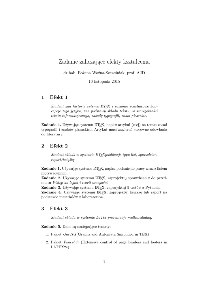Zadanie zaliczające efekty kształcenia dr hab. Bożena Woźna-Szcześniak, prof. AJD 16 listopada 2015 1 Efekt 1 Student zna historie sytemu LATEX i rozumie podstawowe koncepcje tego języka, zna podstawy składu tekstu, w szczególności tekstu informatycznego, zasady typografii, znaki pisarskie. Zadanie 1. Używając systemu LATEX, napisz artykuł (esej) na temat zasad typografii i znaków pisarskich. Artykuł musi zawierać stosowne odowłania do literatury. 2 Efekt 2 Student składa w systemie LATEXpublikacje typu list, sprawdzian, raport/książkę. Zadanie 1. Używając systemu LATEX, napisz podanie do pracy wraz z listem motywacyjnym. Zadanie 2. Używając systemu LATEX, zaprojektuj sprawdzian z do przedmiotu Wstęp do logiki i teorii mnogości. Zadanie 3. Używając systemu LATEX, zaprojektuj 5 testów z Pythona. Zadanie 4. Używając systemu LATEX, zaprojektuj książkę lub raport na podstawie materiałów z laboratoriów. 3 Efekt 3 Student składa w systemie LaTex prezentacje multimedialną. Zadanie 5. Dane są następujące tematy: 1. Pakiet GasTeX(Graphs and Automata Simplified in TEX) 2. Pakiet Fancyhdr (Extensive control of page headers and footers in LATEX2e) 1 3. Wybrane pakiety do składania listów 4. Wybrane pakiety do składania prac dyplomowych 5. Pakiet pgf (grafika typu PostScript oraz PDF w TEX-u) 6. Pakiet poster 7. Pakiet piano 8. Wybrane pakiety do zarządzania kolorem 9. Pakiety dla tikz 10. Pakiet grapher 11. Pakiety cals, calxxxx, calxxxx-yyyy 12. Pakiet memoir Zaprojektuj i wykonaj prezentację multimedialną na jeden z tematów wymienionych powyżej. Uwaga ! Poinformuj kolegę o swoim wyborze. Tematy prezentacji nie mogą się powtarzać. 4 Efekt 4 Student potrafi przystosować środowisko LaTex do własnych potrzeb. Na stronie: http://www.mimuw.edu.pl/~malcin/zpp/prezentacja-latex/ #5 Znajdują się materiały do nauki pisania makr. Proszę się z nimi zapoznać i przygotować dokument w LATEX, który ilustruje użycie makr, w szczególności tych definiujących kolory. 2