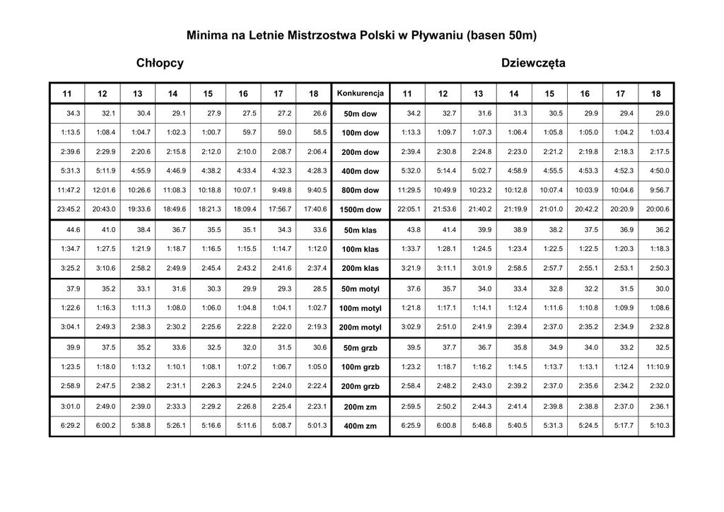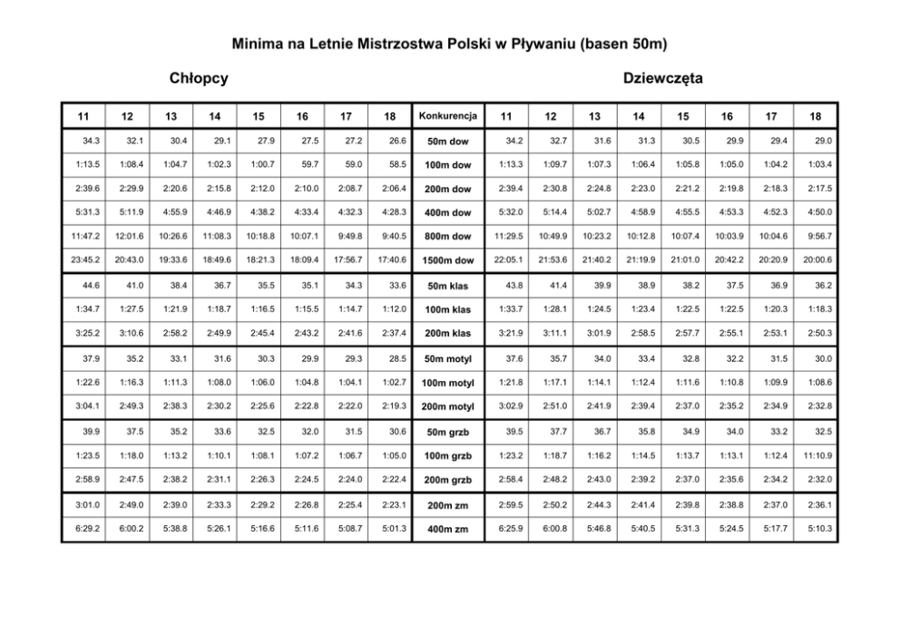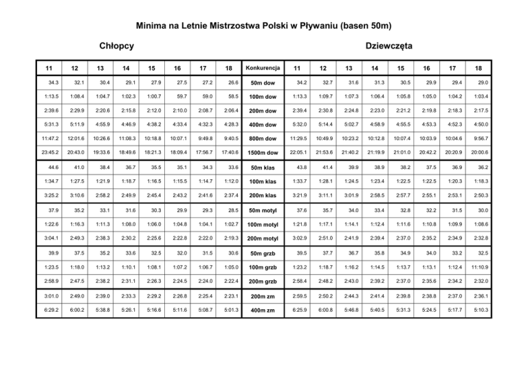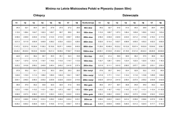Minima na Letnie Mistrzostwa Polski w Pływaniu (basen 50m) Chłopcy 11 12 13 14 Dziewczęta 15 16 17 18 Konkurencja 11 12 13 14 15 16 17 18 34.3 32.1 30.4 29.1 27.9 27.5 27.2 26.6 50m dow 34.2 32.7 31.6 31.3 30.5 29.9 29.4 29.0 1:13.5 1:08.4 1:04.7 1:02.3 1:00.7 59.7 59.0 58.5 100m dow 1:13.3 1:09.7 1:07.3 1:06.4 1:05.8 1:05.0 1:04.2 1:03.4 2:39.6 2:29.9 2:20.6 2:15.8 2:12.0 2:10.0 2:08.7 2:06.4 200m dow 2:39.4 2:30.8 2:24.8 2:23.0 2:21.2 2:19.8 2:18.3 2:17.5 5:31.3 5:11.9 4:55.9 4:46.9 4:38.2 4:33.4 4:32.3 4:28.3 400m dow 5:32.0 5:14.4 5:02.7 4:58.9 4:55.5 4:53.3 4:52.3 4:50.0 11:47.2 12:01.6 10:26.6 11:08.3 10:18.8 10:07.1 9:49.8 9:40.5 800m dow 11:29.5 10:49.9 10:23.2 10:12.8 10:07.4 10:03.9 10:04.6 9:56.7 23:45.2 20:43.0 19:33.6 18:49.6 18:21.3 18:09.4 17:56.7 17:40.6 1500m dow 22:05.1 21:53.6 21:40.2 21:19.9 21:01.0 20:42.2 20:20.9 20:00.6 44.6 41.0 38.4 36.7 35.5 35.1 34.3 33.6 43.8 41.4 39.9 38.9 38.2 37.5 36.9 36.2 1:34.7 1:27.5 1:21.9 1:18.7 1:16.5 1:15.5 1:14.7 1:12.0 100m klas 1:33.7 1:28.1 1:24.5 1:23.4 1:22.5 1:22.5 1:20.3 1:18.3 3:25.2 3:10.6 2:58.2 2:49.9 2:45.4 2:43.2 2:41.6 2:37.4 200m klas 3:21.9 3:11.1 3:01.9 2:58.5 2:57.7 2:55.1 2:53.1 2:50.3 37.9 35.2 33.1 31.6 30.3 29.9 29.3 28.5 50m motyl 37.6 35.7 34.0 33.4 32.8 32.2 31.5 30.0 1:22.6 1:16.3 1:11.3 1:08.0 1:06.0 1:04.8 1:04.1 1:02.7 100m motyl 1:21.8 1:17.1 1:14.1 1:12.4 1:11.6 1:10.8 1:09.9 1:08.6 3:04.1 2:49.3 2:38.3 2:30.2 2:25.6 2:22.8 2:22.0 2:19.3 200m motyl 3:02.9 2:51.0 2:41.9 2:39.4 2:37.0 2:35.2 2:34.9 2:32.8 39.9 37.5 35.2 33.6 32.5 32.0 31.5 30.6 39.5 37.7 36.7 35.8 34.9 34.0 33.2 32.5 1:23.5 1:18.0 1:13.2 1:10.1 1:08.1 1:07.2 1:06.7 1:05.0 100m grzb 1:23.2 1:18.7 1:16.2 1:14.5 1:13.7 1:13.1 1:12.4 11:10.9 2:58.9 2:47.5 2:38.2 2:31.1 2:26.3 2:24.5 2:24.0 2:22.4 200m grzb 2:58.4 2:48.2 2:43.0 2:39.2 2:37.0 2:35.6 2:34.2 2:32.0 3:01.0 2:49.0 2:39.0 2:33.3 2:29.2 2:26.8 2:25.4 2:23.1 200m zm 2:59.5 2:50.2 2:44.3 2:41.4 2:39.8 2:38.8 2:37.0 2:36.1 6:29.2 6:00.2 5:38.8 5:26.1 5:16.6 5:11.6 5:08.7 5:01.3 400m zm 6:25.9 6:00.8 5:46.8 5:40.5 5:31.3 5:24.5 5:17.7 5:10.3 50m klas 50m grzb