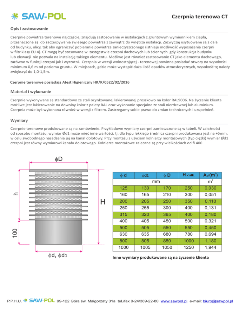 Czerpnia terenowa CT Opis i zastosowanie Czerpnie powietrza terenowe najczęściej znajdują zastosowanie w instalacjach z gruntowym wymiennikiem ciepła, przeznaczone są do zaczerpywania świeżego powietrza z zewnątrz do wnętrza instalacji. Zazwyczaj usytuowane są z dala od budynku, ulicy, tak aby ograniczyć pobieranie powietrza zanieczyszczonego (istnieje możliwość wyposażenia czerpni w filtr klasy EU 4). CT mogą być stosowane w zastępstwie czerpni dachowych lub ściennych gdy konstrukcja budynku lub elewacji nie pozwala na instalację takiego elementu. Możliwe jest również zastosowanie CT jako elementu dachowego, zarówno w funkcji czerpni jak i wyrzutni. Czerpnia w wersji wolnostojącej - terenowej powinna posiadać otwory na wysokości minimum 0,6 m od poziomu gruntu. W miejscach, gdzie może wystąpić duża ilość opadów atmosferycznych, wysokość tę należy zwiększyć do 1,0-1,5m. Czerpnie terenowe posiadają Atest Higieniczny HK/K/0522/02/2016 Materiał i wykonanie Czerpnie wykonywane są standardowo ze stali ocynkowanej lakierowanej proszkowo na kolor RAL9006. Na życzenie klienta możliwe jest lakierowanie na dowolny kolor z palety RAL oraz wykonanie specjalne ze stali nierdzewnej lub aluminium. Czerpnia może być wykonana również w wersji z filtrem. Zastrzegamy sobie prawo do zmian technicznych i uzupełnień. Wymiary Czerpnie terenowe produkowane są na zamówienie. Przykładowe wymiary czerpni zamieszczone są w tabeli. W zależności od sposobu montażu, wymiar Ød1 może mieć inne wartości, tj. dla typu lekkiego średnica czerpni produkowana jest na +5mm, w celu swobodnego nasadzenia jej na kanał dolotowy. Przy montażu z użyciem kołnierzy montażowych (typ ciężki) wymiar Ød1 czerpni jest równy wymiarowi kanału dolotowego. Kołnierze montażowe zalecane są przy wielkościach od fi 400. fD fd fD fd1 H całk. Aef(m2) 2 h mm 100 H fd, fd1 P.P.H.U. 125 130 170 250 m 0,030 160 165 210 300 0,051 200 205 250 350 0,110 250 255 300 400 0,131 315 320 365 400 0,180 400 405 450 500 0,321 500 505 550 550 0,450 630 635 680 780 0,694 800 805 850 1000 1,180 1000 1005 1050 1250 1,944 Inne wymiary produkowane są na życzenie klienta 99-122 Góra św. Małgorzaty 31a tel./fax 0-24/389-22-80 www.sawpol.pl e-mail: [email protected] Czerpnia terenowa CT Sposoby montażu W1 W2 H D H D fd1 = fd + 5mm fd wkręty montażowe kanał dolotowy montaż czerpni z kanałem za pomocą kołnierzy montażowych Typ lekki - montaż widoczny za pomocą wkrętów (czerpnia nasadzana jest na kanał). Typ ciężki - montaż widoczny z użyciem kołnierzy montażowych. Sposób złożenia zamówienia Zamówienia prosimy składać wg poniższego wzoru: CT / 'fd' / 'RAL' / 'M' / 'W' 'fd' 'RAL' 'M' 'W' średnica czerpni 125, 160, 200, 250, 315, 400, 500, 630, 800, 1000... kolor czerpni wg palety RAL materiał: ST - stal ocynkowana AL - aluminium lakierowane proszkowo KO - stal nierdzewna / kwasoodporna (gat. 1.4301 lub 1.4404) wariant montażu: W1 - montaż "typ lekki" - czerpnia nasadzana na kanał dolotowy W2 - montaż "typ ciężki" z użyciem kołnierzy montażowych * - w przypadku nie podania informacji zostaną zastosowane standardowe parametry P.P.H.U. 99-122 Góra św. Małgorzaty 31a tel./fax 0-24/389-22-80 www.sawpol.pl e-mail: [email protected]