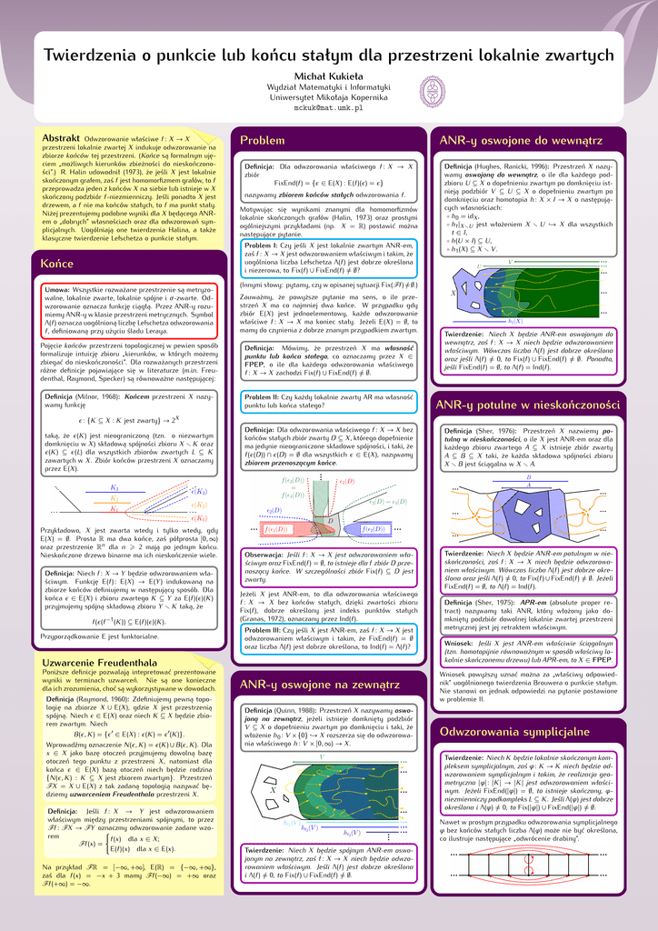 Twierdzenia o punkcie lub końcu stałym dla przestrzeni lokalnie zwartych Michał Kukieła Wydział Matematyki i Informatyki Uniwersytet Mikołaja Kopernika [email protected] Abstrakt Odwzorowanie właściwe f : X → X przestrzeni lokalnie zwartej X indukuje odwzorowanie na zbiorze końców tej przestrzeni. (Końce są formalnym ujęciem „możliwych kierunków zbieżności do nieskończoności”.) R. Halin udowodnił (1973), że jeśli X jest lokalnie skończonym grafem, zaś f jest homomorfizmem grafów, to f przeprowadza jeden z końców X na siebie lub istnieje w X skończony podzbiór f-niezmienniczy. Jeśli ponadto X jest drzewem, a f nie ma końców stałych, to f ma punkt stały. Niżej prezentujemy podobne wyniki dla X będącego ANRem o „dobrych” własnościach oraz dla odwzorowań symplicjalnych. Uogólniają one twierdzenia Halina, a także klasyczne twierdzenie Lefschetza o punkcie stałym. Końce Umowa: Wszystkie rozważane przestrzenie są metryzowalne, lokalnie zwarte, lokalnie spójne i σ -zwarte. Odwzorowanie oznacza funkcję ciągłą. Przez ANR-y rozumiemy ANR-y w klasie przestrzeni metrycznych. Symbol Λ(f) oznacza uogólnioną liczbę Lefschetza odwzorowania f, definiowaną przy użyciu śladu Leraya. Problem Definicja: Dla odwzorowania właściwego f : X → X zbiór FixEnd(f) = {ε ∈ E(X ) : E(f)(ε) = ε} nazywamy zbiorem końców stałych odwzorowania f. Motywując się wynikami znanymi dla homomorfizmów lokalnie skończonych grafów (Halin, 1973) oraz prostymi ogólniejszymi przykładami (np. X = R) postawić można następujące pytanie. Problem I: Czy jeśli X jest lokalnie zwartym ANR-em, zaś f : X → X jest odwzorowaniem właściwym i takim, że uogólniona liczba Lefschetza Λ(f) jest dobrze określona i niezerowa, to Fix(f) ∪ FixEnd(f) 6= ∅? ANR-y oswojone do wewnątrz Definicja (Hughes, Ranicki, 1996): Przestrzeń X nazywamy oswojoną do wewnątrz, o ile dla każdego podzbioru U ⊆ X o dopełnieniu zwartym po domknięciu istnieją podzbiór V ⊆ U ⊆ X o dopełnieniu zwartym po domknięciu oraz homotopia h : X × I → X o następujących własnościach: • h0 = idX , • ht |X rU jest włożeniem X r U ,→ X dla wszystkich t ∈ I, • h(U × I) ⊆ U, • h1(X ) ⊆ X r V . (Innymi słowy: pytamy, czy w opisanej sytuacji Fix(Ff) 6= ∅.) Zauważmy, że powyższe pytanie ma sens, o ile przestrzeń X ma co najmniej dwa końce. W przypadku gdy zbiór E(X ) jest jednoelementowy, każde odwzorowanie właściwe f : X → X ma koniec stały. Jeżeli E(X ) = ∅, to mamy do czynienia z dobrze znanym przypadkiem zwartym. Twierdzenie: Niech X będzie ANR-em oswojonym do wewnątrz, zaś f : X → X niech będzie odwzorowaniem właściwym. Wówczas liczba Λ(f) jest dobrze określona oraz jeśli Λ(f) 6= 0, to Fix(f) ∪ FixEnd(f) 6= ∅. Ponadto, jeśli FixEnd(f) = ∅, to Λ(f) = Ind(f). Pojęcie końców przestrzeni topologicznej w pewien sposób formalizuje intuicję zbioru „kierunków, w których możemy zbiegać do nieskończoności”. Dla rozważanych przestrzeni różne definicje pojawiające się w literaturze (m.in. Freudenthal, Raymond, Specker) są równoważne następującej: Definicja: Mówimy, że przestrzeń X ma własność punktu lub końca stałego, co oznaczamy przez X ∈ FPEP, o ile dla każdego odwzorowania właściwego f : X → X zachodzi Fix(f) ∪ FixEnd(f) 6= ∅. Definicja (Milnor, 1968): Końcem przestrzeni X nazywamy funkcję Problem II: Czy każdy lokalnie zwarty AR ma własność punktu lub końca stałego? ANR-y potulne w nieskończoności Definicja: Dla odwzorowania właściwego f : X → X bez końców stałych zbiór zwarty D ⊆ X , którego dopełnienie ma jedynie nieograniczone składowe spójności, i taki, że f(ε(D)) ∩ ε(D) = ∅ dla wszystkich ε ∈ E(X ), nazywamy zbiorem przenoszącym końce. Definicja (Sher, 1976): Przestrzeń X nazwiemy potulną w nieskończoności, o ile X jest ANR-em oraz dla każdego zbioru zwartego A ⊆ X istnieje zbiór zwarty A ⊆ B ⊆ X taki, że każda składowa spójności zbioru X r B jest ściągalna w X r A. Obserwacja: Jeśli f : X → X jest odwzorowaniem właściwym oraz FixEnd(f) = ∅, to istnieje dla f zbiór D przenoszący końce. W szczególności zbiór Fix(f) ⊆ D jest zwarty. Twierdzenie: Niech X będzie ANR-em potulnym w nieskończoności, zaś f : X → X niech będzie odwzorowaniem właściwym. Wówczas liczba Λ(f) jest dobrze określona oraz jeśli Λ(f) 6= 0, to Fix(f) ∪ FixEnd(f) 6= ∅. Jeżeli FixEnd(f) = ∅, to Λ(f) = Ind(f). ε : {K ⊆ X : K jest zwarty} → 2X taką, że ε(K ) jest nieograniczoną (tzn. o niezwartym domknięciu w X ) składową spójności zbioru X r K oraz ε(K ) ⊆ ε(L) dla wszystkich zbiorów zwartych L ⊆ K zawartych w X . Zbiór końców przestrzeni X oznaczamy przez E(X ). Przykładowo, X jest zwarta wtedy i tylko wtedy, gdy E(X ) = ∅. Prosta R ma dwa końce, zaś półprosta [0, ∞) oraz przestrzenie Rn dla n > 2 mają po jednym końcu. Nieskończone drzewo binarne ma ich nieskończenie wiele. Definicja: Niech f : X → Y będzie odwzorowaniem właściwym. Funkcję E(f) : E(X ) → E(Y ) indukowaną na zbiorze końców definiujemy w następujący sposób. Dla końca ε ∈ E(X ) i zbioru zwartego K ⊆ Y za E(f)(ε)(K ) przyjmujemy spójną składową zbioru Y r K taką, że f(ε(f −1(K )) ⊆ E(f)(ε)(K ). Przyporządkowanie E jest funktorialne. Jeżeli X jest ANR-em, to dla odwzorowania właściwego f : X → X bez końców stałych, dzięki zwartości zbioru Fix(f), dobrze określony jest indeks punktów stałych (Granas, 1972), oznaczany przez Ind(f). Problem III: Czy jeśli X jest ANR-em, zaś f : X → X jest odwzorowaniem właściwym i takim, że FixEnd(f) = ∅ oraz liczba Λ(f) jest dobrze określona, to Ind(f) = Λ(f)? Uzwarcenie Freudenthala Poniższe definicje pozwalają intepretować prezentowane wyniki w terminach uzwarceń. Nie są one konieczne dla ich zrozumienia, choć są wyk