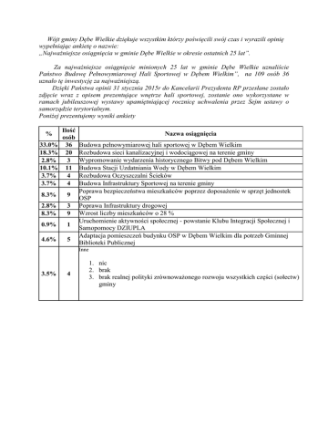 Wójt gminy Dębe Wielkie dziękuje wszystkim którzy poświęcili swój czas i wyrazili opinię wypełniając ankietę o nazwie: „Najważniejsze osiągnięcia w gminie Dębe Wielkie w okresie ostatnich 25 lat”. Za najważniejsze osiągnięcie minionych 25 lat w gminie Dębe Wielkie uznaliście Państwo Budowę Pełnowymiarowej Hali Sportowej w Dębem Wielkim”, na 109 osób 36 uznało tę inwestycję za najważniejszą. Dzięki Państwa opinii 31 stycznia 2015r do Kancelarii Prezydenta RP przesłane zostało zdjęcie wraz z opisem prezentujące wnętrze hali sportowej, zostanie ono wykorzystane w ramach jubileuszowej wystawy upamiętniającej rocznicę uchwalenia przez Sejm ustawy o samorządzie terytorialnym. Poniżej prezentujemy wyniki ankiety 33.0% 18.3% 2.8% 10.1% 3.7% 3.7% Ilość osób 36 20 3 11 4 4 8.3% 9 2.8% 8.3% 3 9 0.9% 1 4.6% 5 % Nazwa osiągnięcia Budowa pełnowymiarowej hali sportowej w Dębem Wielkim Rozbudowa sieci kanalizacyjnej i wodociągowej na terenie gminy Wypromowanie wydarzenia historycznego Bitwy pod Dębem Wielkim Budowa Stacji Uzdatniania Wody w Dębem Wielkim Rozbudowa Oczyszczalni Ścieków Budowa Infrastruktury Sportowej na terenie gminy Poprawa bezpieczeństwa mieszkańców poprzez doposażenie w sprzęt jednostek OSP Poprawa Infrastruktury drogowej Wzrost liczby mieszkańców o 28 % Uruchomienie aktywności społecznej - powstanie Klubu Integracji Społecznej i Samopomocy DZIUPLA Adaptacja pomieszczeń budynku OSP w Dębem Wielkim dla potrzeb Gminnej Biblioteki Publicznej Inne 3.5% 4 1. nic 2. brak 3. brak realnej polityki zrównoważonego rozwoju wszystkich części (sołectw) gminy