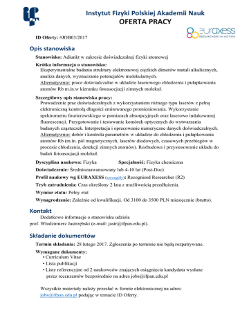 InstytutFizykiPolskiejAkademiiNauk OFERTAPRACY ID Oferty: #JOB03/2017 Opisstanowiska Stanowisko: Adiunkt w zakresie doświadczalnej fizyki atomowej Krótka informacja o stanowisku: Eksperymentalne badania struktury elektronowej ciężkich dimerów matali alkalicznych, analiza danych, wyznaczanie potencjałów molekularnych. Alternatywnie: prace doświadczalne w układzie laserowego chłodzenia i pułapkowania atomów Rb m.in.w kierunku fotoasocjacji zimnych molekuł. Szczegółowy opis stanowiska pracy: Prowadzenie prac doświadczalnych z wykorzystaniem różnego typu laserów z pełną elektroniczną kontrolą długości emitowanego promieniowania. Wykorzystanie spektrometru fourierowskiego w pomiarach absorpcyjnych oraz laserowo indukowanej fluorescencji. Przygotowanie i testowanie komórek optycznych do wytwarzania badanych cząsteczek. Interpretacja i opracowanie numeryczne danych doświadczalnych. Alternatywnie: dobór i kontrola parametrów w układzie do chłodzenia i pułapkowania atomów Rb (m.in. pól magnetycznych, laserów diodowych, czasowych przebiegów w procesie chłodzenia, detekcji zimnych atomów). Rozbudowa i przystosowanie układu do badań fotoasocjacji molekuł. Dyscyplina naukowa: Fizyka Specjalność: Fizyka chemiczna Doświadczenie: Średniozaawansowany lub 4-10 lat (Post-Doc) Profil naukowy wg EURAXESS (szczegóły): Recognised Researcher (R2) Tryb zatrudnienia: Czas określony 2 lata z możliwością przedłużenia. Wymiar etatu: Pełny etat Wynagrodzenie: Zależnie od kwalifikacji. Od 3100 do 3500 PLN miesięcznie (brutto). Kontakt Dodatkowe informacje o stanowisku udziela prof. Włodzimierz Jastrzębski (e-mail: [email protected]). Składaniedokumentów Termin składania: 28 lutego 2017. Zgłoszenia po terminie nie będą rozpatrywane. Wymagane dokumenty: • Curriculum Vitae • Lista publikacji • Listy referencyjne od 2 naukowców znających osiągnięcia kandydata wysłane przez recenzentów bezpośrednio na adres [email protected] Wszystkie materiały należy przesłać w formie elektronicznej na adres: [email protected] podając w temacie ID Oferty.