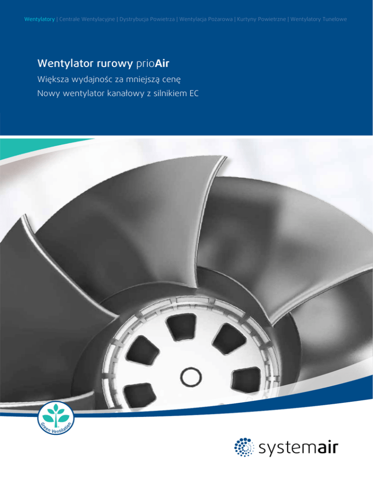 Wentylatory | Centrale Wentylacyjne | Dystrybucja Powietrza | Wentylacja Pożarowa | Kurtyny Powietrzne | Wentylatory Tunelowe Wentylator rurowy prioAir Większa wydajnośc za mniejszą cenę Nowy wentylator kanałowy z silnikiem EC Jak osiągnąć najlepsze parametry w swojej klasie? Należy odkryć na nowo teorię koła. prioAir - maksymalna wydajność - minimalne zużycie. Wentylator jest potwierdzeniem tej sprzeczności. Unikalna i zoptymalizowana konstrukcja wirnika zapewnia wysokie wydajności, przy niskim zużyciu energii. prioAir - osiągnięcie parametrów zwartej i kompaktowej budowy oraz bardzo niskich wartości akustycznych w skrócie: nowy standard nowoczesnych systemów wentylacyjnych prioAir. Jeden krok do przodu. prioAir zapewnia wysoką wydajność przepływu powietrza przy niskim użyciu energii. Wydajny, kompaktowy, cichy prioAir Najważniejsze korzyści: Niski wskaźnik mocy właściwej SFP oraz bardzo wysoka sprawność. Korzyści: wysoka wydajność, mniejsze zużycie energii Materiał: Kompozytowa obudowa i wirnik. Korzyści: mała masa, łatwy i szybki montaż Wydajny bezszczotkowy silnik EC z zintegrowaną elektroniką silnika. Zalety: niskie zużycie energii pozwalące obniżyć koszty eksploatacji Niski poziom hałasu u Zwarta konstrukcja. Zalety: małe rozmiary, rurowa obudowa Niezawodność i długa żywotność Zoptymalizwana konstrykcja koła wirnikowego zapewnia wysokosprawny przepływ powietrza. Oszczędność miejsca: Dzięki kompatkowej konstrukcji o wymiarach Ø 200 x 245 mm może być łatwo zadaptowany w ciasnych systemach wentylacyjnych. Ekonomiczna wydajność - prioAir SFP- niska wartość przy dużych wydajnościach 0 50 45 40 35 30 25 20 15 10 5 0 psf (Pa) 4,2 4 3,8 3,6 3,4 3,2 3 2,8 2,6 2,4 2,2 2 1,8 1,6 1,4 1,2 1 0,8 0,6 0,4 0,2 E (%) SFP (kW/m3/s) Sprawność (%) 400 380 360 340 320 300 280 260 240 220 200 180 160 140 120 100 80 60 40 20 0 SFP (kW/m3/s) Charakterystyka wentylatora Sprawność (%) SFP (kW/m3/s) 100 200 300 400 500 600 700 800 900 1000 1.100 1.200 1.300 1.400 qv (m3/h) Optymalne wartości w całym zakresie charakterystki Krok przed innymi – nowy prioAir. Najwyższa wydajność w swojej klasie. Tel. +49 (0) 7930 9272-0 Fax +49 (0) 7930 9272-92 [email protected] www.systemair.de Systemair GmbH · März 2013 · E1378 Systemair GmbH Seehöfer Straße 45 D-97944 Windischbuch