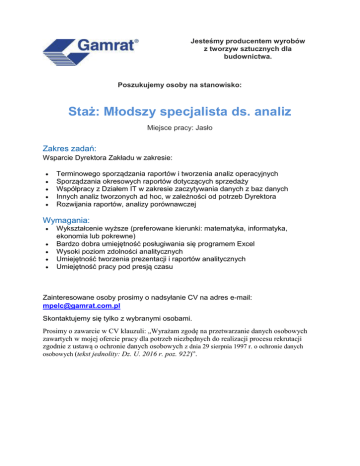 Jesteśmy producentem wyrobów z tworzyw sztucznych dla budownictwa. Poszukujemy osoby na stanowisko: Staż: Młodszy specjalista ds. analiz Miejsce pracy: Jasło Zakres zadań: Wsparcie Dyrektora Zakładu w zakresie: Terminowego sporządzania raportów i tworzenia analiz operacyjnych Sporządzania okresowych raportów dotyczących sprzedaży Współpracy z Działem IT w zakresie zaczytywania danych z baz danych Innych analiz tworzonych ad hoc, w zależności od potrzeb Dyrektora Rozwijania raportów, analizy porównawczej Wymagania: Wykształcenie wyższe (preferowane kierunki: matematyka, informatyka, ekonomia lub pokrewne) Bardzo dobra umiejętność posługiwania się programem Excel Wysoki poziom zdolności analitycznych Umiejętność tworzenia prezentacji i raportów analitycznych Umiejętność pracy pod presją czasu Zainteresowane osoby prosimy o nadsyłanie CV na adres e-mail: [email protected] Skontaktujemy się tylko z wybranymi osobami. Prosimy o zawarcie w CV klauzuli: „Wyrażam zgodę na przetwarzanie danych osobowych zawartych w mojej ofercie pracy dla potrzeb niezbędnych do realizacji procesu rekrutacji zgodnie z ustawą o ochronie danych osobowych z dnia 29 sierpnia 1997 r. o ochronie danych osobowych (tekst jednolity: Dz. U. 2016 r. poz. 922)”.