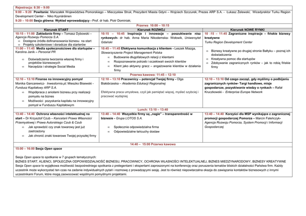 Rejestracja: 8:30 – 9:00 9:00 – 9:20 Powitanie: Marszałek Województwa Pomorskiego – Mieczysław Struk; Prezydent Miasta Gdyni – Wojciech Szczurek; Prezes ARP S.A. - Łukasz śelewski; Wicedyrektor Turku Region Development Center - Niko Kyynäräinen 9:20 – 10:00 Sesja główna: Wykład wprowadzający - Prof. dr hab. Piotr Dominiak; Kierunek START 10:15 – 11:00 Zakładanie firmy – Tomasz Dybowski – Agencja Rozwoju Pomorza S.A. • Dostępne źródła dofinansowania biznesu na start • Projekty szkoleniowe i doradcze dla starterów 11:00 – 11:45 Media społecznościowe dla startupów – Karolina Janik – Personal PR • • Doświadczenia tworzenia własnej firmy i projektów biznesowych Narzędzia i strategie Social Media 12:10 – 13:10 Finanse na innowacyjny pomysł Monika Gancarewicz- Inwestornia.pl; Mieszko Bisewski Fundusz Kapitałowy ARP S.A. • Współpraca z aniołami biznesu przy realizacji pomysłu na biznes • MoŜliwości pozyskania kapitału na innowacyjny pomysł w Funduszu Kapitałowym 13:40 – 14:40 Ochrona własności intelektualnej na start – Dr Krzysztof Czub – Kancelarii Prawa Własności Przemysłowej i Prawa Autorskiego Czub & Czub • Jak sprawdzić czy znak towarowy jest juŜ zastrzeŜony • Jak chronić znaki towarowe Twojej przyszłej firmy Przerwa 10:00 – 10:15 Kierunek ROZWÓJ 10:15 – 10:45 Inspiracje i innowacje – poszukiwanie nisz rynkowych- dr hab. Anna Maria Nikodemska- Wołowik, Uniwersytet Gdański 10:45 – 11:45 Efektywna komunikacja z klientem - Leszek Miazga, Stowarzyszenie Project Management Polska • Budowanie długofalowych relacji z klientami • Rozpoznawanie potrzeb i oczekiwań swoich klientów • Klient jako aktywny gracz – angaŜowanie klientów w działania firmy Przerwa kawowa: 11:45 – 12:10 12:10 – 13:10 Pracownicy – potencjał Twojej firmy - Olga Białobrzeska – Akademia Edukacji Regionalnej Efektywna praca umysłowa, czyli jak pamiętać więcej, myśleć szybciej i pracować wydajniej Lunch: 13:10 – 13:40 13:40 – 14:40 Wszystkie firmy są „nagie” – transparentność w biznesie - Grupa LOTOS S.A. • • Społecznie odpowiedzialna firma Odpowiedzialne łańcuchy dostaw Kierunek NOWE RYNKI 10 :15 – 11:45 Zagraniczne inspiracje – fińskie biznesy kreatywne Turku Region Development Center • • • Biznesy kreatywne po drugiej stronie Bałtyku – poznaj ich doświadczenia Kreatywna pomoc dla startupów Zdobywanie zagranicznych rynków – jak to robią fińskie firmy 12:10 – 13:10 Od czego zacząć, gdy myślimy o podbijaniu zagranicznych rynków- Targi handlowe, misje gospodarcze, pozyskiwanie wiedzy o rynkach – Rafał Kruczkowski - Enterprise Europe Network 13:40 – 14:40 Korzyści dla MSP wynikające z zagranicznej promocji gospodarczej Pomorza – Marcin FaleńczykAgencja Rozwoju Pomorza, System Promocji i Informacji Gospodarczej 14:40 – 15:00 Przerwa kawowa 15:00 – 16:00 Sesja Open space Sesja Open space to spotkanie w 7 grupach tematycznych: BIZNES START, KLIENCI, SPOŁECZNA ODPOWIEDZIALNOŚĆ BIZNESU, PRACOWNICY, OCHRONA WŁASNOŚCI INTELEKTUALNEJ, BIZNES MIEDZYNARODOWY, BIZNESY KREATYWNE Sesja Open space to wyjątkowa moŜliwość bezpośredniego spotkania z prelegentami i ekspertami zaproszonymi na konferencję oraz poruszenia tematów bliskich działalności Państwa firm. KaŜdy uczestnik moŜe wykorzystać ten czas na zadanie indywidualnych pytań i rozmowę z prowadzącymi sesję. Jest to równieŜ niepowtarzalna okazja do zawiązania kontaktów biznesowych z innymi uczestnikami Forum, które mogą zaowocować wspólnymi pomyślnymi projektami.