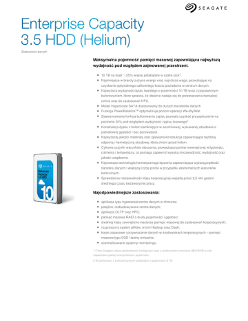 Zestawienie danych Maksymalna pojemność pamięci masowej zapewniająca najwyższą wydajność pod względem zajmowanej przestrzeni. 10 TB na dysk1 i 25% więcej petabajtów w szafie rack2. Najmniejsze w branży zużycie energii oraz najniższa waga, pozwalające na uzyskanie optymalnego całkowitego kosztu posiadania w centrum danych. Najwyższa wydajność dysku twardego o pojemności 10 TB wraz z poprawionym buforowaniem, które sprawia, że idealnie nadaje się do przetwarzania transakcji online oraz do zastosowań HPC. Model Hyperscale SATA dostosowany do dużych transferów danych Funkcja PowerBalance™ optymalizuje poziom operacji We-Wy/Wat. Zaawansowana funkcja buforowania zapisu pozwala uzyskać przyspieszenie na poziomie 20% pod względem wydajności zapisu losowego2. Konstrukcja dysku z helem zamkniętym w aluminiowej, wykuwanej obudowie o jednakowej gęstości i bez porowatości. Najwyższej jakości materiały oraz spawana konstrukcja zapewniające bardziej odporną i hermetyczną obudowę, która chroni przed helem. Cyfrowe czujniki warunków otoczenia, prowadzące pomiar wewnętrznej wilgotności, ciśnienia i temperatury, co pomaga zapewnić wysoką niezawodność, wydajność oraz jakość urządzenia. Najnowsza technologia hermetycznego łączenia zapewniająca wyższą prędkość transferu danych i większą liczbę pinów w przypadku ekstremalnych warunków termicznych. Sprawdzona niezawodność klasy korporacyjnej wsparta przez 2,5 mln godzin średniego czasu bezawaryjnej pracy. Najodpowiedniejsze zastosowania: aplikacje typu hyperscale/centra danych w chmurze; potężne, rozbudowywane centra danych; aplikacje OLTP oraz HPC; pamięć masowa RAID o dużej pojemności i gęstości; średniej klasy zewnętrzne macierze pamięci masowej do zastosowań korporacyjnych; rozproszony system plików, w tym Hadoop oraz Ceph; kopie zapasowe i przywracanie danych w środowiskach korporacyjnych – pamięci masowe typu D2D i taśmy wirtualne; scentralizowane systemy monitoringu. 1 Firma Seagate zaleca potwierdzenie konfiguracji wraz z producentem kontrolera HBA/RAID w celu zapewnienia pełnej funkcjonalności pojemności. 2 W porównaniu z konkurencyjnymi produktami o pojemności 8 TB. Parametry SATA Hyperscale 6 Gb/s Pojemność Model standardowy (512e)1 Model dla środowisk typu hyperscale (512e) SATA Standard 6 Gb/s SAS Standard 12 Gb/s 8 TB 10 TB 8 TB 10 TB 10 TB — — ST8000NM0206 ST10000NM0086 ST10000NM0096 ST8000NM0016 ST10000NM0016 — — — Model standardowy (4Kn)1 — — — ST10000NM0146 ST10000NM0206 Model SED (512e)1, 2 — — — ST10000NM0156 ST10000NM0216 Model SED (4Kn)1, 2 — — — ST10000NM0166 ST10000NM0226 Model SED-FIPS (512e)1,2,3 — — — ST10000NM0176 ST10000NM0236 Model SED-FIPS (4Kn)1, 2, 3 — — — ST10000NM0186 ST10000NM0246 Tak Tak Tak Tak Tak Tak Tak Tak Tak Tak — — — — Tak SuperParity Tak Tak Tak Tak Tak Technologia PowerChoice™/PowerBalance™ Tak Tak Tak Tak Tak Tak Tak Tak Tak Tak 256 256 256 256 256 Tak Tak Tak Tak Tak Średni czas bezawaryjnej pracy (MTBF, w godz.) 2,5 mln 2,5 mln 2,5 mln 2,5 mln 2,5 mln Wskaźnik niezawodności pracy @ w cyklu 24/7 (AFR) 0,35% 0,35% 0,35% 0,35% 0,35% 1 sektor na 10E15 1 sektor na 10E15 1 sektor na 10E15 1 sektor na 10E15 1 sektor na 10E15 Funkcje Dysk z helem stworzony przy użyciu specjalnej szerokiej spoiny Cyfrowe czujniki parametrów środowiska Technologia Protection Information (T10 DIF) Niska zawartość halogenów/Obsługa funkcji HotPlug 4 Pamięć podręczna, wielosegmentowa (MB) Pokrycie organiczne typu OSP (Organic Solderability Preservative) Niezawodność/spójność danych Nieodwracalne błędy odczytu na liczbę odczytanych bitów Godziny pracy rocznie (praca w trybie 24/7) 8 760 8 760 8 760 8 760 8 760 Rozmiar sektora 512e (liczba bajtów na sektor) 512 512 512 512 512, 520, 528 Rozmiar sektora 4Kn (liczba bajtów na sektor) — — 4096 4096 4096, 4160, 4224 Ograniczona gwarancja (lata) 5 5 5 5 5 Wydajność Prędkość obrotowa (obr./min) 7200 7200 7200 7200 7200 Szybkość interfejsu (Gb/s) 6, 3, 1,5 6, 3, 1,5 6, 3, 1,5 6, 3, 1,5 12, 6, 3 Maks. Średnia szybkość transmisji, śr. zewn. (MB/s, MiB/s) 249 MB/s 249 MB/s 249 MB/s 254 MB/s 254 MB/s Odczyt/zapis losowy 4K QD16 WCD (IOPS) 170, 138 170, 138 170, 370 170, 370 170, 370 4,16 4,16 4,16 4,16 4,16 Pojedynczy Pojedynczy Pojedynczy Pojedynczy Podwójny 12,5 12,5 12,5 12,5 12,5 4,5 W 4,5 W 4,5 W 4,5 W 5,5 W 8 8 8 8 9 Średnia latencja (ms) Porty interfejsu Drgania przy częstotliwości 1500 Hz (rad/s²) Zużycie energii Średni pobór mocy w stanie spoczynku A (W) Maksymalna moc podczas pracy, zapis losowy (WCD) 4K/4Q RR50% / RW50% Maksymalna moc podczas pracy, odczyt losowy 4K/16Q (W) 8,4 8,4 8,4 8,4 9,4 +12 V i +5 V +12 V i +5 V +12 V i +5 V +12 V i +5 V +12 V i +5 V 5°C – 60°C 5°C – 60°C 5°C – 60°C 5°C – 60°C 5°C – 60°C 2,27 2,27 2,27 2,27 2,27 70/40 G 70/40 G 70/40 G 70/40 G 70/40 G 250 G 250 G 250 G 250 G 250 G Wysokość (mm/cale, maks.)5 26,11 mm/1,028 cale 26,11 mm/1,028 cale 26,11 mm/1,028 cale 26,11 mm/1,028 cale 26,11 mm/1,028 cale Szerokość (mm/cale, maks.)5 101,85 mm/4,01 cale 101,85 mm/4,01 cale 101,85 mm/4,01 cale 101,85 mm/4,01 cale 101,85 mm/4,01 cale Głębokość (mm/cale, maks.)5 147 mm/5,787 cale 147 mm/5,787 cale 147 mm/5,787 cale 147 mm/5,787 cale 147 mm/5,787 cale Waga (g/funty) 650 g/1,433 funty 650 g/1,433 funty 650 g/1,433 funty 650 g/1,433 funty 650 g/1,433 funty 20 20 20 20 20 40/8 40/8 40/8 40/8 40/8 Wymagania dotyczące napięcia z zasilacza Środowisko Temperatura podczas pracy (°C) Wibracje, w stanie spoczynku: 10 Hz do 500 Hz (Grms) Odporność na wstrząsy podczas pracy, 2 ms (odczyt/zapis) (Gs) Odporność na wstrząsy w stanie spoczynku, 1 ms / 2 ms (Gs) Fizyczne Liczba jednostek w kartonie Kartonów na paletę/kartonów na warstwę 1 W przypadku wszystkich modeli o pojemności 8 TB i większości modeli SED i SED-FIPS wymagany jest numer SPA faktury. 