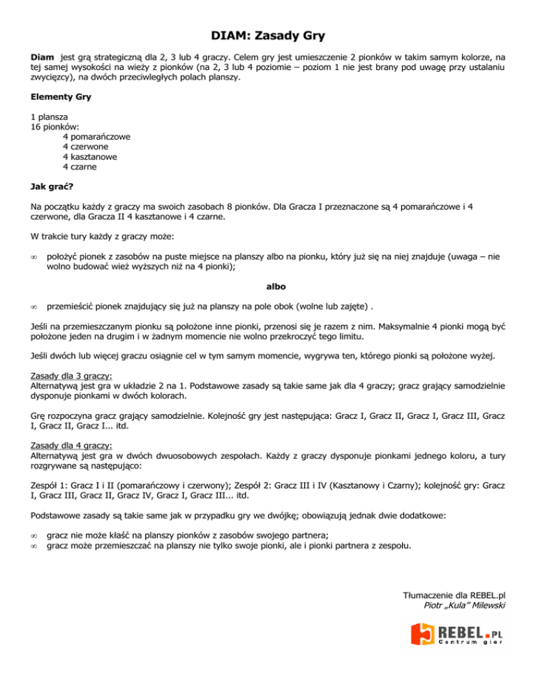 DIAM: Zasady Gry Diam jest grą strategiczną dla 2, 3 lub 4 graczy. Celem gry jest umieszczenie 2 pionków w takim samym kolorze, na tej samej wysokości na wieży z pionków (na 2, 3 lub 4 poziomie – poziom 1 nie jest brany pod uwagę przy ustalaniu zwycięzcy), na dwóch przeciwległych polach planszy. Elementy Gry 1 plansza 16 pionków: 4 pomarańczowe 4 czerwone 4 kasztanowe 4 czarne Jak grać? Na początku każdy z graczy ma swoich zasobach 8 pionków. Dla Gracza I przeznaczone są 4 pomarańczowe i 4 czerwone, dla Gracza II 4 kasztanowe i 4 czarne. W trakcie tury każdy z graczy może: • położyć pionek z zasobów na puste miejsce na planszy albo na pionku, który już się na niej znajduje (uwaga – nie wolno budować wież wyższych niż na 4 pionki); albo • przemieścić pionek znajdujący się już na planszy na pole obok (wolne lub zajęte) . Jeśli na przemieszczanym pionku są położone inne pionki, przenosi się je razem z nim. Maksymalnie 4 pionki mogą być położone jeden na drugim i w żadnym momencie nie wolno przekroczyć tego limitu. Jeśli dwóch lub więcej graczu osiągnie cel w tym samym momencie, wygrywa ten, którego pionki są położone wyżej. Zasady dla 3 graczy: Alternatywą jest gra w układzie 2 na 1. Podstawowe zasady są takie same jak dla 4 graczy; gracz grający samodzielnie dysponuje pionkami w dwóch kolorach. Grę rozpoczyna gracz grający samodzielnie. Kolejność gry jest następująca: Gracz I, Gracz II, Gracz I, Gracz III, Gracz I, Gracz II, Gracz I... itd. Zasady dla 4 graczy: Alternatywą jest gra w dwóch dwuosobowych zespołach. Każdy z graczy dysponuje pionkami jednego koloru, a tury rozgrywane są następująco: Zespół 1: Gracz I i II (pomarańczowy i czerwony); Zespół 2: Gracz III i IV (Kasztanowy i Czarny); kolejność gry: Gracz I, Gracz III, Gracz II, Gracz IV, Gracz I, Gracz III... itd. Podstawowe zasady są takie same jak w przypadku gry we dwójkę; obowiązują jednak dwie dodatkowe: • • gracz nie może kłaść na planszy pionków z zasobów swojego partnera; gracz może przemieszczać na planszy nie tylko swoje pionki, ale i pionki partnera z zespołu. Tłumaczenie dla REBEL.pl Piotr „Kula” Milewski