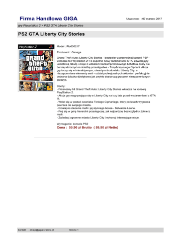 Firma Handlowa GIGA Utworzono : 07 marzec 2017 gry Playstation 2 > PS2 GTA Liberty City Stories PS2 GTA Liberty City Stories Model : Pla000217 Producent : Cenega Grand Theft Auto: Liberty City Stories - bestseller z przenośnej konsoli PSP wkracza na PlayStation 2! To zupełnie nowy rozdział serii GTA, zawierający unikatową fabułę i misje z udziałem bezkompromisowego bohatera, który nie boi się wkroczyć na ścieżkę przestępstwa - Tony’ego Cipriani. Akcja gry toczy się w interaktywnym, otwartym środowisku Liberty City, a niezapomniane elementy serii - udział profesjonalnych aktorów i perfekcyjnie dobrana ścieżka dźwiękowa jak zwykle dostarczą graczowi niezapomnianych przeżyć. Cechy: - Przenośny hit Grand Theft Auto: Liberty City Stories wkracza na konsolę PlayStation 2. - Akcja gry rozgrywająca się w Liberty City na trzy lata przed wydarzeniami z GTA III. - Wciel się w postać cwaniaka Toniego Ciprianiego, który po latach wygnania powraca do swojego miasta. - Działaj na zlecenie mafii i jej słynnego bossa - Salvatore Leone. - Pnij się w górę hierarchii przestępczej, jak najbardziej bezwzględny żołnierz mafii. - Zwiedzaj ogromne miasto Liberty City i wykonuj interesujące misje. Wymagania: konsola PS2 Cena : 59,90 zł Brutto ( 59,90 zł Netto) kontakt : - [email protected] Strona 1