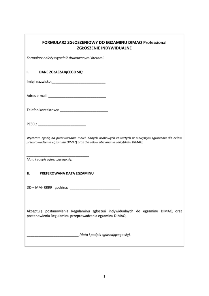 FORMULARZ ZGŁOSZENIOWY DO EGZAMINU DIMAQ Professional ZGŁOSZENIE INDYWIDUALNE Formularz należy wypełnić drukowanymi literami. I. DANE ZGŁASZAJĄCEGO SIĘ: Imię i nazwisko:____________________________ Adres e-mail: ______________________________ Telefon kontaktowy: _________________________ PESEL: _________________________ Wyrażam zgodę na przetwarzanie moich danych osobowych zawartych w niniejszym zgłoszeniu dla celów przeprowadzenia egzaminu DIMAQ oraz dla celów utrzymania certyfikatu DIMAQ. ____________________________________ (data i podpis zgłaszającego się) II. PREFEROWANA DATA EGZAMINU DD – MM- RRRR godzina: __________________________ Akceptuję postanowienia Regulaminu zgłoszeń indywidualnych do egzaminu DIMAQ oraz postanowienia Regulaminu przeprowadzania egzaminu DIMAQ. ___________________________ (data i podpis zgłaszającego się). 1