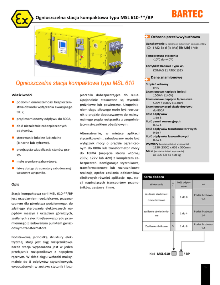 Ognioszczelna stacja kompaktowa typu MSL 610-**/BP Ochrona przeciwwybuchowa Oznakowanie w zależności od użytych komponentów I M2 Ex d [ia Ma] [ib Mb] I Mb Temperatura otoczenia -100C do +400C Certyfikat Badania Typu WE KOMAG 11 ATEX 132X Ognioszczelna stacja kompaktowa typu MSL 610 Właściwości poziom nienaruszalności bezpieczeństwa obwodu wyłączania awaryjnego SIL 2, prąd znamionowy odpływu do 800A, do 8 niezależnie zabezpieczonych odpływów, sterowanie lokalne lub zdalne (binarne lub cyfrowe), przejrzysta wizualizacja stanów pracy, małe wymiary gabarytowe, łatwy dostęp do aparatury zabudowanej wewnątrz wyłącznika. Opis Stacja kompaktowa serii MSL 610-**/BP jest urządzeniem rozdzielczym, przeznaczonym dla górnictwa podziemnego, do zdalnego sterowania elektrycznych napędów maszyn i urządzeń górniczych, zasilanych z sieci trójfazowej prądu przemiennego z izolowanym punktem gwiazdowym transformatora. Podstawową jednostką struktury elektrycznej stacji jest ciąg rozłącznikowy. Każda stacja wyposażona jest w jeden przełącznik rozłącznikowy z napędem ręcznym. W skład ciągu wchodzi maksymalnie do 8 odpływów stycznikowych, wyposażonych w zestaw: stycznik i bez- pieczniki dobezpieczające do 800A. Opcjonalnie stosowane są styczniki próżniowe lub powietrzne. Uzupełnieniem ciągu siłowego może być rozrusznik o prądzie dopasowanym do maksymalnego prądu rozłącznika z uzupełniającym stycznikiem obejściowym. Alternatywnie, w miejsce aplikacji stycznikowych , zabudowany może być wyłącznik mocy o prądzie ograniczonym do 800A lub transformator mocy do 16kVA (napięcie strony wtórnej 230V, 127V lub 42V) z kompletem zabezpieczeń. Konfiguracje stycznikowe, transformatorowe lub rozrusznikowe realizują oprócz zasilania odbiorników silnikowych również aplikacje np.. stacji napinających transportery przenośników, zestawy i inne. Dane znamionowe Stopień ochrony IP65 Znamionowe napięcie izolacji 1000V (1140V) Znamionowe napięcie łączeniowe 500V / 1000V (1140V) Znamionowy prąd ciągły dopływu do 800A Ilość odpływów 1 do 8 Ilość paneli rewersyjnych 0 do 4 Ilość odpływów transformatorowych 0 do 4 Ilość odpływów luzownikowych 0 do 4 Wymiary (w zależności od wykonania) 1130 (1500) x 605 x 500mm Masa (w zależności od wykonania) ok 300 lub ok 550 kg Karta doboru ko d Ilość odpływów kod 3 1 do 8 Podać liczbowo 1-8 zasilanie oświetlenio4 we 1 do 4 Podać liczbowo 1-4 1 do 8 Podać liczbowo 1-8 Wykonanie zasilanie silnikowe i oświetleniowe Zasilanie silnikowe Kod MSL 610- 5 / BP 5