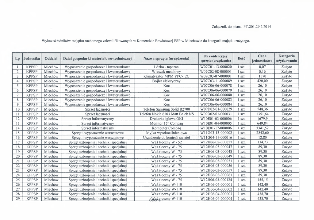 Załącznik do pisma PT.201.29.2.2014 Wykaz składników majątku