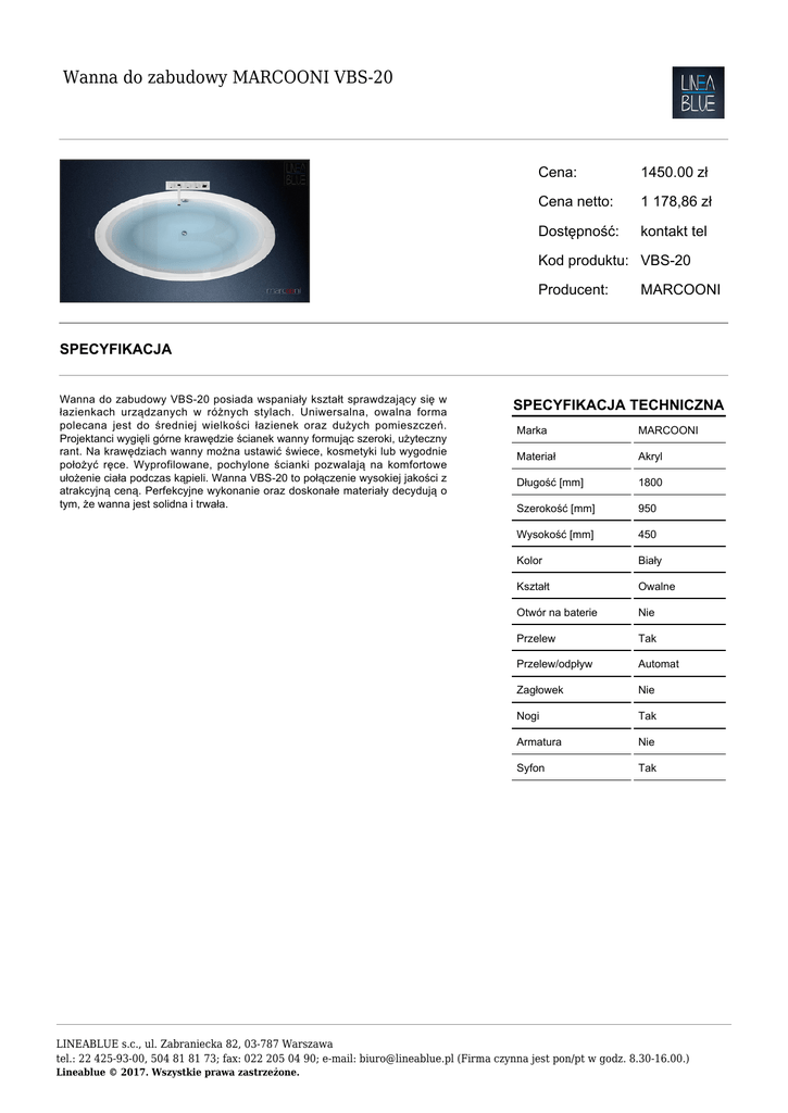Wanna do zabudowy MARCOONI VBS-20 Cena: 1450.00 zł Cena netto: 1 178,86 zł Dostępność: kontakt tel Kod produktu: VBS-20 Producent: MARCOONI SPECYFIKACJA Wanna do zabudowy VBS-20 posiada wspaniały kształt sprawdzający się w łazienkach urządzanych w różnych stylach. Uniwersalna, owalna forma polecana jest do średniej wielkości łazienek oraz dużych pomieszczeń. Projektanci wygięli górne krawędzie ścianek wanny formując szeroki, użyteczny rant. Na krawędziach wanny można ustawić świece, kosmetyki lub wygodnie położyć ręce. Wyprofilowane, pochylone ścianki pozwalają na komfortowe ułożenie ciała podczas kąpieli. Wanna VBS-20 to połączenie wysokiej jakości z atrakcyjną ceną. Perfekcyjne wykonanie oraz doskonałe materiały decydują o tym, że wanna jest solidna i trwała. SPECYFIKACJA TECHNICZNA Marka MARCOONI Materiał Akryl Długość [mm] 1800 Szerokość [mm] 950 Wysokość [mm] 450 Kolor Biały Kształt Owalne Otwór na baterie Nie Przelew Tak Przelew/odpływ Automat Zagłowek Nie Nogi Tak Armatura Nie Syfon Tak LINEABLUE s.c., ul. Zabraniecka 82, 03-787 Warszawa tel.: 22 425-93-00, 504 81 81 73; fax: 022 205 04 90; e-mail: [email protected] (Firma czynna jest pon/pt w godz. 8.30-16.00.) Lineablue © 2017. Wszystkie prawa zastrzeżone.
