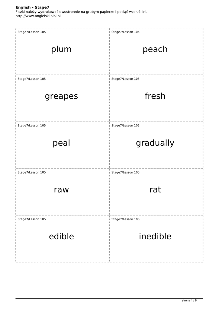 English - Stage7 Fiszki należy wydrukować dwustronnie na grubym papierze i pociąć wzdłuż lini. http://www.angielski.alol.pl Stage7/Lesson 105 Stage7/Lesson 105 plum Stage7/Lesson 105 peach Stage7/Lesson 105 greapes Stage7/Lesson 105 fresh Stage7/Lesson 105 peal Stage7/Lesson 105 gradually Stage7/Lesson 105 raw Stage7/Lesson 105 rat Stage7/Lesson 105 edible inedible strona 1 / 6 English - Stage7 Fiszki należy wydrukować dwustronnie na grubym papierze i pociąć wzdłuż lini. http://www.angielski.alol.pl Stage7/Lesson 105 Stage7/Lesson 105 brzoskwinia Stage7/Lesson 105 śliwka Stage7/Lesson 105 świeży Stage7/Lesson 105 winogrona Stage7/Lesson 105 stopniowo Stage7/Lesson 105 obierać Stage7/Lesson 105 szczur Stage7/Lesson 105 niejadalny szczur Stage7/Lesson 105 jadalny strona 2 / 6 English - Stage7 Fiszki należy wydrukować dwustronnie na grubym papierze i pociąć wzdłuż lini. http://www.angielski.alol.pl Stage7/Lesson 105 Stage7/Lesson 105 suffer Stage7/Lesson 105 possess Stage7/Lesson 105 sushi bar Stage7/Lesson 105 object Stage7/Lesson 105 do without Stage7/Lesson 105 relative pronouns Stage7/Lesson 105 wave Stage7/Lesson 105 get on well neighbour Stage7/Lesson 105 neighbourhood strona 3 / 6 English - Stage7 Fiszki należy wydrukować dwustronnie na grubym papierze i pociąć wzdłuż lini. http://www.angielski.alol.pl Stage7/Lesson 105 Stage7/Lesson 105 posiadać Stage7/Lesson 105 cierpieć Stage7/Lesson 105 przedmiot Stage7/Lesson 105 bar sushi Stage7/Lesson 105 zaimki względne Stage7/Lesson 105 obyć się bez Stage7/Lesson 105 sąsiad Stage7/Lesson 105 sąsiedztwo machać Stage7/Lesson 105 dobrze z kimś żyć strona 4 / 6 English - Stage7 Fiszki należy wydrukować dwustronnie na grubym papierze i pociąć wzdłuż lini. http://www.angielski.alol.pl Stage7/Lesson 105 Stage7/Lesson 105 bookshop Stage7/Lesson 105 chemist’s Stage7/Lesson 105 block otherwise strona 5 / 6 English - Stage7 Fiszki należy wydrukować dwustronnie na grubym papierze i pociąć wzdłuż lini. http://www.angielski.alol.pl Stage7/Lesson 105 Stage7/Lesson 105 apteka Stage7/Lesson 105 w przeciwnym razie księgarnia Stage7/Lesson 105 blok strona 6 / 6 Powered by TCPDF (www.tcpdf.org)