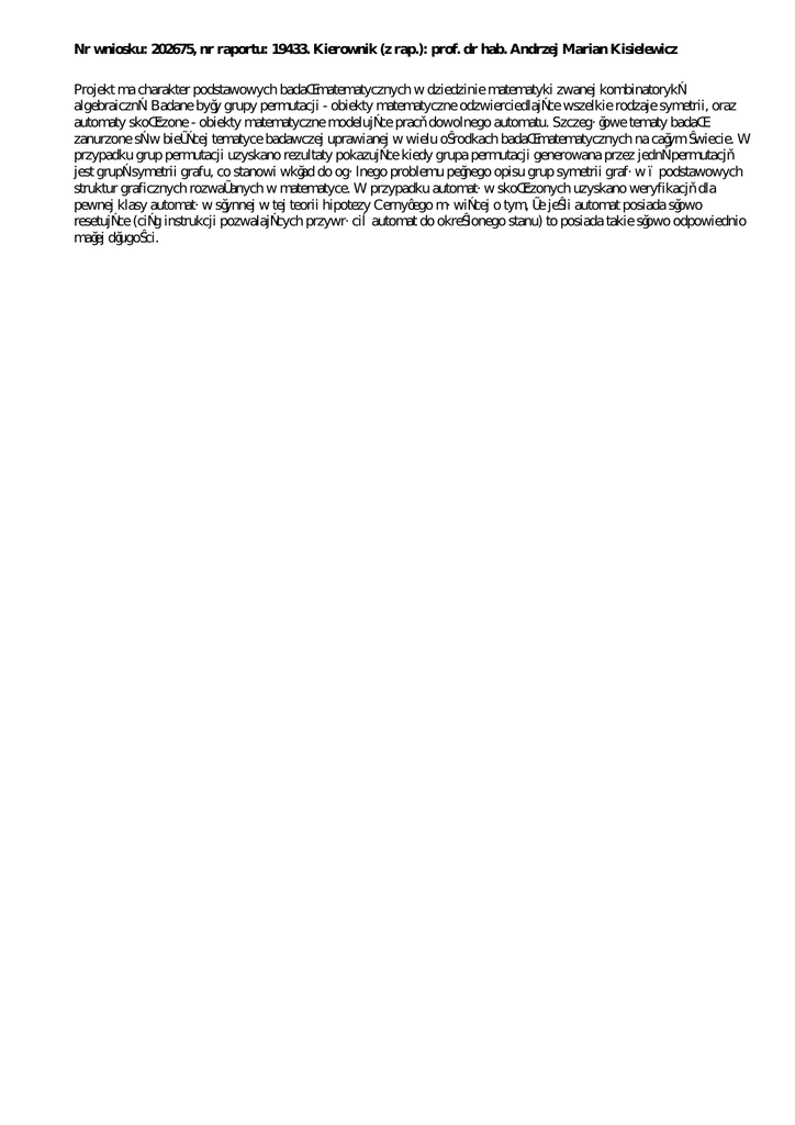 Nr wniosku: 202675, nr raportu: 19433. Kierownik (z rap.): prof. dr hab. Andrzej Marian Kisielewicz Projekt ma charakter podstawowych badań matematycznych w dziedzinie matematyki zwanej kombinatoryką algebraiczną. Badane były grupy permutacji - obiekty matematyczne odzwierciedlające wszelkie rodzaje symetrii, oraz automaty skończone - obiekty matematyczne modelujące pracę dowolnego automatu. Szczegółowe tematy badań zanurzone są w bieżącej tematyce badawczej uprawianej w wielu ośrodkach badań matematycznych na całym świecie. W przypadku grup permutacji uzyskano rezultaty pokazujące kiedy grupa permutacji generowana przez jedną permutację jest grupą symetrii grafu, co stanowi wkład do ogólnego problemu pełnego opisu grup symetrii grafów – podstawowych struktur graficznych rozważanych w matematyce. W przypadku automatów skończonych uzyskano weryfikację dla pewnej klasy automatów słynnej w tej teorii hipotezy Cerny’ego mówiącej o tym, że jeśli automat posiada słowo resetujące (ciąg instrukcji pozwalających przywrócić automat do określonego stanu) to posiada takie słowo odpowiednio małej długości.