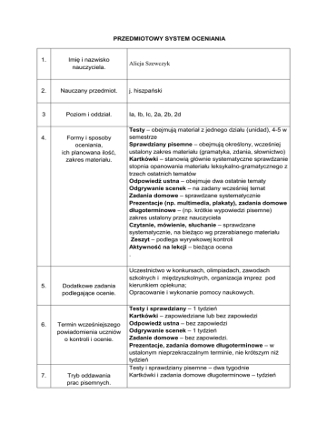 PRZEDMIOTOWY SYSTEM OCENIANIA 1. Imię i nazwisko nauczyciela. 2. Nauczany przedmiot. 3 Poziom i oddział. 4. 5. Formy i sposoby oceniania, ich planowana ilość, zakres materiału. Dodatkowe zadania podlegające ocenie. 6. Termin wcześniejszego powiadomienia uczniów o kontroli i ocenie. 7. Tryb oddawania prac pisemnych. Alicja Szewczyk j. hiszpański Ia, Ib, Ic, 2a, 2b, 2d Testy – obejmują materiał z jednego działu (unidad), 4-5 w semestrze Sprawdziany pisemne – obejmują określony, wcześniej ustalony zakres materiału (gramatyka, zdania, słownictwo) Kartkówki – stanowią głównie systematyczne sprawdzanie stopnia opanowania materiału leksykalno-gramatycznego z trzech ostatnich tematów Odpowiedź ustna – obejmuje dwa ostatnie tematy Odgrywanie scenek – na zadany wcześniej temat Zadania domowe – sprawdzane systematycznie Prezentacje (np. multimedia, plakaty), zadania domowe długoterminowe – (np. krótkie wypowiedzi pisemne) zakres ustalony przez nauczyciela Czytanie, mówienie, słuchanie – sprawdzane systematycznie, na bieżąco wg przerabianego materiału Zeszyt – podlega wyrywkowej kontroli Aktywność na lekcji – bieżąca ocena . Uczestnictwo w konkursach, olimpiadach, zawodach szkolnych i międzyszkolnych, organizacja imprez pod kierunkiem opiekuna; Opracowanie i wykonanie pomocy naukowych. Testy i sprawdziany – 1 tydzień Kartkówki – zapowiedziane lub bez zapowiedzi Odpowiedź ustna – bez zapowiedzi Odgrywanie scenek – 1 tydzień Zadanie domowe – bez zapowiedzi. Prezentacje, zadania domowe długoterminowe – w ustalonym nieprzekraczalnym terminie, nie krótszym niż tydzień Testy i sprawdziany pisemne – dwa tygodnie Kartkówki i zadania domowe długoterminowe – tydzień 8. Kryteria poszczególnych ocen w przypadku punktowanych form oceniania. 9. Tryb poprawiania ocen cząstkowych lub ich uzyskania w przypadku nieobecności ucznia. 10. Możliwość skorzystania z dodatkowej pomocy ze strony nauczyciela w przypadku trudności w nauce, nadrobienia braków i zaległości przez ucznia. Celujący Bardzo dobry Dobry Dostateczny Dopuszczający Niedostateczny – – – – – – 94,1 – 100% 82,1 – 94% 64,1 – 82% 50 – 64% 35,1 – 49,9% 35% i mniej Testy i sprawdziany – konieczność poprawiania oceny niedostatecznej i możliwość poprawiania oceny dopuszczającej, dostatecznej i dobrej w ciągu dwóch tygodni od podania informacji o ocenie (liczy się średnia) Kartkówki – możliwość poprawy oceny w ciągu tygodnia od podania informacji o ocenie (liczy się średnia), jeśli jest niezapowiedziana, można zgłosić nieprzygotowanie Prezentacje, zadania domowe długoterminowe, – w przypadku nieprzygotowania w wyznaczonym terminie, brak możliwości poprawy i uzyskania pozytywnej oceny. W przypadku nieobecności uczeń dostarcza pracę na pierwszej lekcji, na której jest obecny Zeszyt, podręcznik, zeszyt ćwiczeń – za ich brak uczeń otrzymuje ocenę niedostateczną (można zgłosić jako nieprzygotowanie do lekcji) Istnieje możliwości poprawiania oceny niedostatecznej otrzymanej za nieuczciwość. Uczeń zgłasza się do nauczyciela po powrocie do szkoły informując o długości nieobecności. Jeśli uczeń był nieobecny w szkole przez 1-2 dni zalicza test/ sprawdzian lub inne zapowiedziane formy sprawdzania wiedzy na pierwszej lekcji po powrocie do szkoły. Jeśli uczeń był nieobecny dłużej ma obowiązek zaliczenia testu/sprawdzianu w ciągu dwóch tygodni lub w terminie ustalonym z nauczycielem. W przypadku niestawienia się w wyznaczonym terminie uczeń pisze zaległą pracę pisemną w trakcie zajęć dydaktycznych. Na dodatkowych godzinach konsultacji podanych do wiadomości i ogłoszonych w danym roku szkolnym, w czasie wolnych godzin nauczyciela (np. okienko), w innym terminie uzgodnionym indywidualnie pomiędzy uczniem i nauczycielem. 11. Sposób ustalania oceny śródrocznej i rocznej, wpływ poszczególnych ocen cząstkowych na oceny końcowe. Średnia ważona – poszczególne oceny mają swoją wagę: Wskaźniki osiągnięć ucznia WAGA testy, sprawdziany 5 punktów kartkówki, odpowiedzi 3 punkty ustne, zadania domowe długoterminowe, aktywność odgrywanie scenek 2 punkty zadania domowe lub 1 punkt klasowe, zeszyt, czytanie Ocena śródroczna i roczna obliczana jest według wzoru: suma wszystkich uzyskanych ocen w kategorii razy waga wskaźnika, podzielone przez ilość otrzymanych ocen razy waga i wynika z następujących przedziałów przyjętych na poszczególne oceny: 1,00 – 1,75 – niedostateczny 1,76 – 2,60 – dopuszczający 2,61 – 3,60 – dostateczny 3,61 – 4,60 – dobry 4,61 – 5,25 – bardzo dobry Powyżej 5,25 – celujący. 12. 13. Tryb i kryteria uzyskania wyższej niż proponowana Zgodnie z WSO. oceny rocznej. Inne uwagi Uczeń ma prawo dwa razy w semestrze zgłosić nieprzygotowanie do zajęć lekcyjnych, które zaznaczane jest w dzienniku datą. Obejmuje ono: zadanie domowe (krótkie i długoterminowe), niezapowiedzianą odpowiedź ustną lub niezapowiedzianą kartkówkę, brak zeszytu lub książki. Trzecie i każde następne nieprzygotowanie oznacza ocenę niedostateczną. Niezgłoszenie nieprzygotowania podczas sprawdzania obecności, które to wyniknie podczas lekcji, wiąże się z uzyskaniem przez ucznia oceny niedostatecznej. Uczeń ma obowiązek nosić zeszyt (A4), podręcznik i zeszyt ćwiczeń, kserokopie wkleja do zeszytu. Przy ocenie pracy ucznia brana jest pod uwagę systematyczność jego pracy oraz stopień wykorzystania możliwości ucznia. Ustalając ocenę należy wziąć pod uwagę opinię poradni pedagogiczno - psychologicznych dotyczącą dysfunkcji.