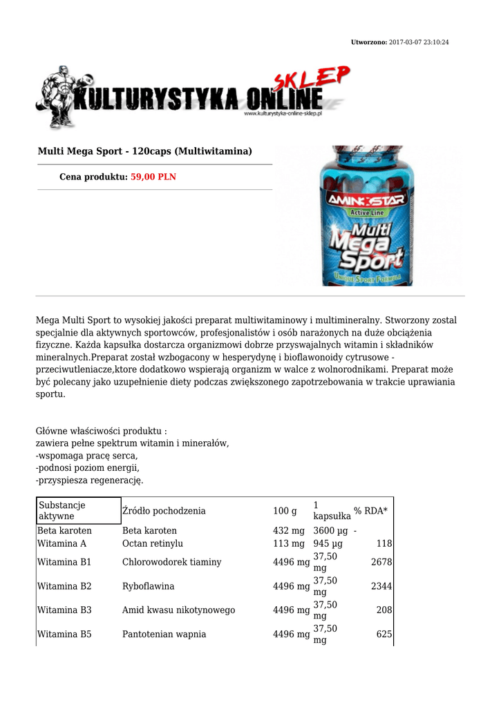 Utworzono: 2017-03-07 23:10:24 Multi Mega Sport - 120caps (Multiwitamina) Cena produktu: 59,00 PLN Mega Multi Sport to wysokiej jakości preparat multiwitaminowy i multimineralny. Stworzony zostal specjalnie dla aktywnych sportowców, profesjonalistów i osób narażonych na duże obciążenia fizyczne. Każda kapsułka dostarcza organizmowi dobrze przyswajalnych witamin i składników mineralnych.Preparat został wzbogacony w hesperydynę i bioflawonoidy cytrusowe przeciwutleniacze,ktore dodatkowo wspierają organizm w walce z wolnorodnikami. Preparat może być polecany jako uzupełnienie diety podczas zwiększonego zapotrzebowania w trakcie uprawiania sportu. Główne właściwości produktu : zawiera pełne spektrum witamin i minerałów, -wspomaga pracę serca, -podnosi poziom energii, -przyspiesza regenerację. Substancje aktywne Źródło pochodzenia 100 g 1 % RDA* kapsułka Beta karoten Witamina A Beta karoten Octan retinylu Witamina B1 Chlorowodorek tiaminy Witamina B2 Ryboflawina Witamina B3 Amid kwasu nikotynowego Witamina B5 Pantotenian wapnia 432 mg 3600 µg 113 mg 945 µg 37,50 4496 mg mg 37,50 4496 mg mg 37,50 4496 mg mg 37,50 4496 mg mg 118 2678 2344 208 625 Witamina B6 Chlorowodorek pirydoksyny 1199 mg Witamina H Biotyna 4 mg Witamina B11 Witamina B12 Kwas foliowy Cyjanokobalamina 0,1% Witamina C Kwas askorbinowy Witamina D Cholekalcyferol 24 mg 4 mg 11990 mg 0,3 mg Witamina E Octan tokoferolu 4017 mg Witamina P Bioflawonoidy cytrusowe 1499 mg Cholina Dwuwinian choliny 2998 mg Inozytol Inozytol 2998 mg PABA Kwas paraaminobenzoesowy 4496 mg L-Glutamina Kwas glutaminowy 1499 mg Hesperydyna Bor 300 mg 60 mg Chrom Jod Żelazo Potas Hesperydyna Kwas borowy Sole wapniowe kw. ortofosforowego Chlorek chromu Jodek potasu Fumaran żelazawy Chlorek potasu Miedź Siarczan miedziowy Magnez Mangan Molibden Selen Wanad Cynk Tlenek magnezu Siarczan manganu Molibdenian sodu Selenian sodu Aminochelat wanadu Tlenek cynku Wapń 10,00 mg 0,037 mg 200 µg 37,50 µg 100,00 mg 2,50 µg 33,50 mg 12,50 mg 25,00 mg 25,00 mg 37,50 mg 12,50 mg 2,5 mg 0,50 mg 500 25 100 3750 166 50 335 - 600 mg 5,00 mg 3 mg 7 mg 600 mg 600 mg 25,00 µg 62,50 µg 5,00 mg 5,00 mg 0,125 15 mg mg 432 mg 3,60 mg 366 mg 3,05 mg 3 mg 25,00 µg 6 mg 50,00 µg 3 mg 25,00 µg 899 mg 7,50 mg 1,25 41,6 35,7 1,2 50 Dawkowanie: 1 kapsułka dziennie, w czasie posiłku. Adres: http://www.ko.sklep.pl/ Telefon: kom. 782 010 880 Email: [email protected]