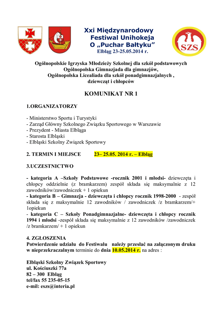 Xxi Międzynarodowy Festiwal Unihokeja O „Puchar Bałtyku” Ty Elbląg 23-25.05.2014 r. Ogólnopolskie Igrzyska Młodzieży Szkolnej dla szkół podstawowych Ogólnopolska Gimnazjada dla gimnazjów, Ogólnopolska Licealiada dla szkół ponadgimnazjalnych , dziewcząt i chłopców KOMUNIKAT NR 1 1.ORGANIZATORZY - Ministerstwo Sportu i Turystyki - Zarząd Główny Szkolnego Związku Sportowego w Warszawie - Prezydent - Miasta Elbląga - Starosta Elbląski - Elbląski Szkolny Związek Sportowy 2. TERMIN I MIEJSCE 23– 25.05. 2014 r. – Elbląg 3.UCZESTNICTWO - kategoria A –Szkoły Podstawowe -rocznik 2001 i młodsi- dziewczęta i chłopcy oddzielnie (z bramkarzem) zespół składa się maksymalnie z 12 zawodników/zawodniczek + 1 opiekun - kategoria B – Gimnazja - dziewczęta i chłopcy rocznik 1998-2000 - zespół składa się z maksymalnie 12 zawodników / zawodniczek /z bramkarzem/+ 1opiekun - kategoria C – Szkoły Ponadgimnazjalne- dziewczęta i chłopcy rocznik 1994 i młodsi -zespół składa się maksymalnie z 12 zawodników /zawodniczek /z bramkarzem/ + 1 opiekun 4. ZGŁOSZENIA Potwierdzenie udziału do Festiwalu należy przesłać na załączonym druku w nieprzekraczalnym terminie do dnia 10.05.2014 r. na adres : Elbląski Szkolny Związek Sportowy ul. Kościuszki 77a 82 – 300 Elbląg tel/fax 55 235-05-15 e-mil: [email protected] Dokonanie terminowych zgłoszeń umożliwi nam wcześniejsze wydanie komunikatu nr 2, w którym zawarte będą dane o zakwaterowaniu, wyżywieniu oraz systemie rozgrywek. 5. SPRAWY FINANSOWE a) wpisowe do zawodów /od zespołu/ - 250 zł b) koszty zakwaterowania i wyżywienia - bursa z pościelą (pościel organizatora) - 120 zł za dwa dni od 1uczestnika - szkoła – własna karimata i śpiwór – 100 zł za dwa dni od 1 uczestnika Do dnia 16.05.2014 r. należy dokonać wpłaty wpisowego oraz należności za zakwaterowanie i wyżywienie na konto: Elbląski Szkolny Związek Sportowy PKO BP/O Elbląg 54 1020 1752 0000 0102 0070 6168 z dopiskiem „Igrzyska lub Gimnazjada lub Licealiada w Unihokeju” Uwaga: Do poszczególnych kategorii wiekowych w pierwszej kolejności przyjmowani będą mistrzowie województw. Ze względu na ograniczona ilość miejsc noclegowych w burach i internatach , przydział noclegów uzależniony będzie od daty wpływy zgłoszenia. - Wszelkie informacje o zawodach , przydział noclegów i wyżywienia zawarte będą w Komunikacie Nr 2. - Zespoły zobowiązane są do posiadania jednakowych strojów z numeracją. PRZEWODNICZĄCY Elbląskiego Szkolnego Związku Sportowego /-/ Janusz Pająk ZGŁOSZENIE UDZIAŁU w FESTIWALU 1. Nazwa szkoły …………………………………………………………………………………… 2. Adres szkoły miejscowość: ………………………………. kod pocztowy: …………………….. telefon: ….…….................. fax: …………….......... e-mail........................................................ ulica: …………….......................................... Kategoria Liczba Łączna zespołów: liczba dziewcząt Dziew- Chłoczęta pcy A województwo ………………………............. Łączna Liczba Inne liczba dorosłych osoby (np. chłopców opiekunów kierowca) Męż- Kobiety czyźni B C ŁĄCZNA LICZBA ZGŁOSZONYCH OSÓB: ……………………………… ZAKWATEROWANIE I WYŻYWIENIE Proszę określić rodzaj zakwaterowania (zaznaczyć X): BURSA ………...SZKOŁA………… oraz liczbę osób do wyżywienia na poszczególne dni Festiwalu: Posiłek/ dzień 23.05.2014 r 24.05.2013 r. 25.05.2013 r. śniadanie X obiad X kolacja X Planowany przyjazd do Elbląga (dzień)………maja 2014 godzina…………….. Planowany wyjazd z Elbląga (dzień)…………maja 2014 godzina…………….. Środek transportu (autokar, PKS, PKP ): …………………………….. Osoba odpowiedzialna za ekipę: Imię i Nazwisko…………………………………………………… Telefon stacjonarny, komórka,/fax/e-mail……………………………………… Oświadczamy, że poniesiemy koszty zamówionego wyżywienia i zakwaterowania, które nie zostały wykorzystane. ……………………………… Podpis i pieczęć
