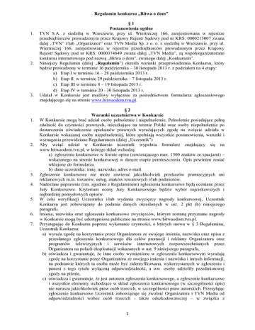 Regulamin konkursu „Bitwa o dom” 1. 2. 3. 1. 2. 3. 4. 5. 6. 7. §1 Postanowienia ogólne TVN S.A. z siedzibą w Warszawie, przy ul. Wiertniczej 166, zarejestrowana w rejestrze przedsiębiorców prowadzonym przez Krajowy Rejestr Sądowy pod nr KRS: 0000213007 zwana dalej „TVN” i/lub „Organizator” oraz TVN Media Sp. z o. o. z siedzibą w Warszawie, przy ul. Wiertniczej 166, zarejestrowana w rejestrze przedsiębiorców prowadzonym przez Krajowy Rejestr Sądowy pod nr KRS: 0000374849 zwana dalej „TVN Media”, są współorganizatorami konkursu internetowego pod nazwą „Bitwa o dom”, zwanego dalej „Konkursem”. Niniejszy Regulamin (dalej „Regulamin”) określa warunki przeprowadzenia Konkursu, który będzie prowadzony w terminie 16 października – 30 listopada 2013 r. z podziałem na 4 etapy: a) Etap I w terminie 16 – 28 października 2013 r. b) Etap II w terminie 29 października – 7 listopada 2013 r. c) Etap III w terminie 8 – 19 listopada 2013 r. d) Etap IV w terminie 20 - 30 listopada 2013 r. Udział w Konkursie jest możliwy wyłącznie za pośrednictwem formularza zgłoszeniowego znajdującego się na stronie www.bitwaodom.tvn.pl. §2 Warunki uczestnictwa w Konkursie W Konkursie mogą brać udział osoby pełnoletnie i niepełnoletnie. Pełnoletnie posiadające pełną zdolność do czynności prawnych, mieszkające na terenie Polski oraz osoby niepełnoletnie po dostarczeniu oświadczenia opiekunów prawnych wyrażających zgodę na wzięcie udziału w Konkursie wskazanej osoby niepełnoletniej, które spełniają wszystkie postanowienia, warunki i wymagania przewidziane Regulaminem (dalej „Uczestnik”) Aby wziąć udział w Konkursie uczestnik wypełnia formularz znajdujący się na www.bitwaodom.tvn.pl, w którego skład wchodzą: a) zgłoszenie konkursowe w formie opisu (zawierającego max. 1500 znaków ze spacjami) – wskazanego na stronie konkursowej w danym etapie pomieszczenia. Opis powinien zostać wklejony do formularza. b) dane uczestnika: imię, nazwisko, adres e-mail. Zgłoszenie konkursowe nie może zawierać jakichkolwiek przekazów promocyjnych ani reklamowych m.in. towarów, usług, znaków towarowych i/lub podmiotów. Nadesłane poprawnie (tzn. zgodnie z Regulaminem) zgłoszenia konkursowe będą oceniane przez Jury Konkursowe. Kryterium oceny Jury Konkursowego będzie wybór najciekawszych i najbardziej pomysłowych opisów. W celu weryfikacji Uczestnika i/lub wydania zwycięzcy nagrody konkursowej, Uczestnik Konkursu jest zobowiązany do podania danych określonych w ust. 2 pkt (b) niniejszego paragrafu. Imiona, nazwiska oraz zgłoszenia konkursowe zwycięzców, którym zostaną przyznane nagrody w Konkursie mogą być udostępnione publicznie na stronie www.bitwaodom.tvn.pl. Przystępując do Konkursu poprzez wykonanie czynności, o których mowa w § 3 Regulaminu, Uczestnik Konkursu: a) wyraża zgodę na korzystanie przez Organizatora ze swojego imienia, nazwiska oraz opisu z przesłanego zgłoszenia konkursowego dla celów promocji i reklamy Organizatora oraz programów telewizyjnych i serwisów internetowych rozpowszechnianych przez Organizatora na polach eksploatacji wskazanych w ust. 9 niniejszego paragrafu, b) oświadcza i gwarantuje, że inne osoby wymienione w zgłoszeniu konkursowym wyrażają zgodę na korzystanie przez Organizatora ze swojego imienia i nazwiska i innych informacji, na podstawie których ta osoba może być zidentyfikowana, wykorzystanych w zgłoszeniu i ponosi z tego tytułu wyłączną odpowiedzialność, a ww. osoby udzieliły przedmiotowej zgody na piśmie, c) oświadcza i gwarantuje, że jest autorem zgłoszenia konkursowego, a zgłoszenie konkursowe i wszystkie elementy wchodzące w skład zgłoszenia konkursowego (w szczególności opis) nie narusza jakichkolwiek praw osób trzecich, w szczególności praw autorskich. Przesyłając zgłoszenie konkursowe Uczestnik zobowiązuje się zwolnić Organizatora i TVN Media od odpowiedzialności wobec osób trzecich - także odszkodowawczej – w związku z 1 korzystaniem przez Organizatora ze zgłoszenia konkursowego i wszystkich elementów wchodzących w skład zgłoszenia (w szczególności opisu) w sposób określony w Regulaminie. W przypadku zaspokojenia przez Organizatora roszczeń osób trzecich związanych z korzystaniem przez Organizatora ze zgłoszenia konkursowego (w tym przepisu) w sposób określony Regulaminem, Uczestnik zobowiązuje się do zwrotu wydatków poniesionych na zaspokojenie takich roszczeń oraz kosztów obrony przed takimi roszczeniami, w tym kosztów procesu i pomocy prawnej. 8. Uczestnik Konkursu przesyłając zgłoszenie konkursowe upoważnia Organizatora do decydowania o sposobie oznaczenia (i podpisywania) nadesłanego przez Uczestnika zgłoszenia konkursowego (w tym opisu), podanymi przez Uczestnika danymi w celu ich opisania, w tym do usuwania słów wulgarnych i obraźliwych jeśli takie znajdą się w podanych przez Uczestnika danych. 9. Z chwilą przesłania przez Uczestnika zgłoszenia konkursowego Uczestnik udziela Organizatorowi licencji upoważniającej do korzystania z wszystkich elementów wchodzących w skład zgłoszenia konkursowego Uczestnika (w szczególności przepisu) i Organizator jest uprawniony do korzystania z tych elementów m.in. w ramach Konkursu, jego przebiegu i promocji bez jakichkolwiek ograniczeń (w tym bez żadnych ograniczeń czasowych i terytorialnych), na wszystkich polach eksploatacji, a w szczególności: a. utrwalania i zwielokrotniania jakąkolwiek techniką (w jakimkolwiek systemie, formacie i na jakimkolwiek nośniku), w tym m.in. drukiem, na kliszy fotograficznej, na taśmie magnetycznej, cyfrowo, b. wprowadzania do obrotu, c. wprowadzania do pamięci komputera, do sieci komputerowej i/lub multimedialnej, do baz danych, d. publicznego udostępniania w taki sposób, aby każdy mógł mieć do nich dostęp w miejscu i w czasie przez siebie wybranym (m.in. udostępnianie w Interneci