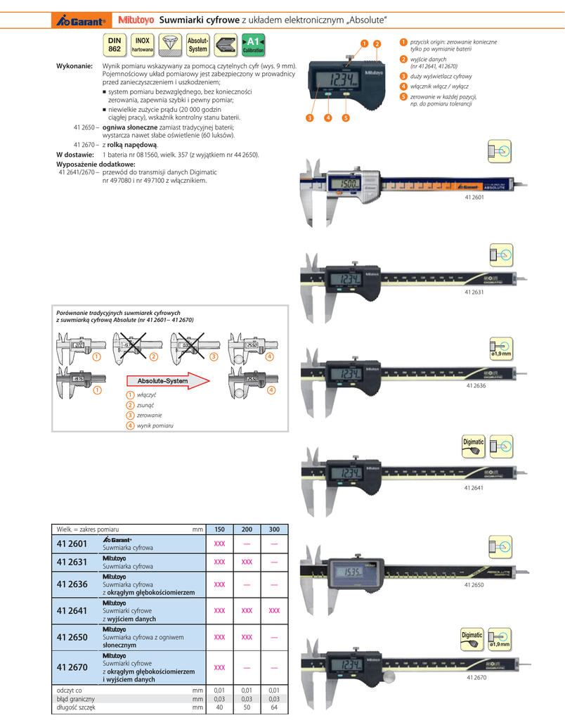 Suwmiarki cyfrowe z układem elektronicznym „Absolute“ DIN 862 INOX hartowana AbsolutSystem A1 •• • • •• • 1 Calibration 1 przycisk origin: zerowanie konieczne tylko po wymianie baterii 2 wyjście danych (nr 412641, 412670) Wykonanie: Wynik pomiaru wskazywany za pomocą czytelnych cyfr (wys. 9 mm). Pojemnościowy układ pomiarowy jest zabezpieczony w prowadnicy przed zanieczyszczeniem i uszkodzeniem; system pomiaru bezwzględnego, bez konieczności zerowania, zapewnia szybki i pewny pomiar; niewielkie zużycie prądu (20 000 godzin ciągłej pracy), wskaźnik kontrolny stanu baterii. 41 2650 – ogniwa słoneczne zamiast tradycyjnej baterii; wystarcza nawet słabe oświetlenie (60 luksów). 41 2670 – z rolką napędową. W dostawie: 1 bateria nr 08 1560, wielk. 357 (z wyjątkiem nr 44 2650). Wyposażenie dodatkowe: 41 2641/2670 – przewód do transmisji danych Digimatic nr 497080 i nr 497100 z włącznikiem. 2 3 duży wyświetlacz cyfrowy 4 włącznik włącz / wyłącz ••• 3 4 5 zerowanie w każdej pozycji, np. do pomiaru tolerancji 5 41 2601 41 2631 Porównanie tradycyjnych suwmiarek cyfrowych z suwmiarką cyfrową Absolute (nr 41 2601− 41 2670) • • • • •• • 1 • 2 1 • • 3 ø1,9 mm 4 4 1 włączyć 2 zsunąć 41 2636 3 zerowanie 4 wynik pomiaru Digimatic 41 2641 Wielk. = zakres pomiaru mm 150 200 300 41 2601 Suwmiarka cyfrowa XXX — — 41 2631 Suwmiarka cyfrowa XXX XXX — 41 2636 Suwmiarka cyfrowa z okrągłym głębokościomierzem XXX — — 41 2641 Suwmiarki cyfrowe z wyjściem danych XXX XXX XXX 41 2650 Suwmiarka cyfrowa z ogniwem słonecznym XXX XXX — 41 2670 Suwmiarki cyfrowe z okrągłym głębokościomierzem i wyjściem danych XXX odczyt co błąd graniczny długość szczęk 41 2650 Digimatic ø1,9 mm mm mm mm — — 41 2670 0,01 0,03 40 0,01 0,03 50 0,01 0,03 64