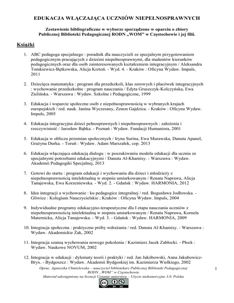 EDUKACJA WŁĄCZAJĄCA UCZNIÓW NIEPEŁNOSPRAWNYCH Zestawienie bibliograficzne w wyborze sporządzone w oparciu o zbiory Publicznej Biblioteki Pedagogicznej RODN „WOM” w Częstochowie i jej filii. Książki 1. ABC pedagoga specjalnego : poradnik dla nauczycieli ze specjalnym przygotowaniem pedagogicznym pracujących z dziećmi niepełnosprawnymi, dla studentów kierunków pedagogicznych oraz dla osób zainteresowanych kształceniem integracyjnym / Aleksandra Tomkiewicz-Bętkowska, Alicja Krztoń. - Wyd. 4. - Kraków : Oficyna Wydaw. Impuls, 2011 2. Dziecięca matematyka : program dla przedszkoli, klas zerowych i placówek integracyjnych : wychowanie przedszkolne : program nauczania / Edyta Gruszczyk-Kolczyńska, Ewa Zielińska. - Warszawa : Wydaw. Szkolne i Pedagogiczne, 1999 3. Edukacja i wsparcie społeczne osób z niepełnosprawnością w wybranych krajach europejskich / red. nauk. Janina Wyczesany, Zenon Gajdzica. - Kraków : Oficyna Wydaw. Impuls, 2005 4. Edukacja integracyjna dzieci pełnosprawnych i niepełnosprawnych : założenia i rzeczywistość / Jarosław Bąbka. - Poznań : Wydaw. Fundacji Humaniora, 2001 5. Edukacja w obliczu przemian społecznych / Iryna Surina, Ewa Murawska, Danuta Apanel, Grażyna Durka. - Toruń : Wydaw. Adam Marszałek, cop. 2013 6. Edukacja włączająca edukacją dialogu : w poszukiwaniu modelu edukacji dla ucznia ze specjalnymi potrzebami edukacyjnymi / Danuta Al-Khamisy. - Warszawa : Wydaw. Akademii Pedagogiki Specjalnej, 2013 7. Gotowi do startu : program edukacji i wychowania dla dzieci i młodzieży z niepełnosprawnością intelektualną w stopniu umiarkowanym / Renata Naprawa, Alicja Tanajewska, Ewa Korzeniewska. - Wyd. 2. - Gdańsk : Wydaw. HARMONIA, 2012 8. Idea integracji a wychowanie : ku pedagogice integralnej / red. Bogusława Jodłowska. Gliwice : Kolegium Nauczycielskie ; Kraków : Oficyna Wydaw. Impuls, 2004 9. Indywidualne programy edukacyjno-terapeutyczne dla I etapu nauczania uczniów z niepełnosprawnością intelektualną w stopniu umiarkowanym / Renata Naprawa, Kornela Maternicka, Alicja Tanajewska. - Wyd. 3. - Gdańsk : Wydaw. HARMONIA, 2009 10. Integracja społeczna : praktyczne próby wdrażania / red. Danuta Al-Khamisy. - Warszawa : Wydaw. Akademickie Żak, 2002 11. Integracja szansą wychowania nowego pokolenia / Kazimierz Jacek Zabłocki. - Płock : Wydaw. Naukowe NOVUM, 2002 12. Integracja w edukacji : dylematy teorii i praktyki / red. Jan Jakóbowski, Anna JakubowiczBryx. - Bydgoszcz : Wydaw. Akademii Bydgoskiej im. Kazimierza Wielkiego, 2002 Oprac. Agnieszka Chmielewska – nauczyciel bibliotekarz Publicznej Biblioteki Pedagogicznej RODN „WOM” w Częstochowie Materiał udostępniony na licencji Uznanie autorstwa – Użycie niekomercyjne 3.0. Polska 1 13. Integracyjne kształcenie niepełnosprawnych : sens i granice zmiany edukacyjnej / Grzegorz Szumski. - Wyd. 1 - 2 dodruk. - Warszawa : Wydaw. APS : Wydaw. Naukowe PWN, 2013 14. Jak pracować z dzieckiem niepełnosprawnym? : konstruowanie programu zajęć, organizowanie klasy integracyjnej, konspekty zajęć / Beata Szczygieł. - Wyd. 3. - Kraków : Oficyna Wydaw. Impuls, 2005 15. Jak pracować z dzieckiem niepełnosprawnym? : konstruowanie programu zajęć, organizowanie klasy integracyjnej, konspekty zajęć / Beata Szczygieł. - Kraków : Oficyna Wydaw. Impuls, 2001 16. Kategorie sukcesów w opiniach nauczycieli klas integracyjnych jako przyczynek do poszukiwania koncepcji edukacji integracyjnej / Zenon Gajdzica. - Kraków : Oficyna Wydaw. Impuls ; Katowice : Uniwersytet Śląski, 2013 17. Kluczowe zasady służące promocji jakości w edukacji włączającej : zalecenia praktyczne / [oprac. George Borg] ; red. Verity Donnelly ; Europejska Agencja Rozwoju Edukacji Uczniów ze Specjalnymi Potrzebami. - Odense : Europejska Agencja Rozwoju Edukacji Uczniów ze Specjalnymi Potrzebami, 2011 18. Ministerstwo Edukacji Narodowej o kształceniu integracyjnym i specjalnym / [oprac. Teresa Serafin ; współudz. Urszula Grodzka]. - Warszawa : Ministerstwo Edukacji Narodowej, 2001 19. Moje "ja" i szkoła integracyjna : zjawiska ukrytego programu w nauczaniu uczniów niepełnosprawnych / Andrzej Lis-Kujawski. - Wyd. 2. - Kraków : Oficyna Wydaw. Impuls, 2010 20. Mój uczeń nie słyszy : poradnik dla nauczycieli szkół ogólnodostępnych / Urszula Buryn, Teresa Hulboj, Marzena Kowalska, Tamara Podziemska. - Warszawa : Ministerstwo Edukacji Narodowej, 2001 21. Od niechęci do akceptacji : o wychowaniu dzieci do tolerancji wobec osób niepełnosprawnych / Iwona Rudek ; Uniwersytet Zielonogórski w Zielonej Górze. - Kraków : Oficyna Wydaw. Impuls, 2007 22. Otwórz się na świat : programy dla uczniów drugiego etapu nauczania oraz uczniów z niepełnosprawnością intelektualną w stopniu lekkim / Renata Naprawa, Alicja Tanajewska, Krystyna Szczepańska. - Gdańsk : Wydaw. HARMONIA, 2013 23. Pomoce dydaktyczne dla nauczycieli pracujących w klasach integracyjnych / Anna Król. Warszawa : Wydaw. Szkolne i Pedagogiczne, cop. 2000 24. Poradnik dydaktyczny : dla nauczycieli realizujących podstawę programową w zakresie szkoły podstawowej i gimnazjum z uczniami niewidomymi i słabo widzącymi / red. Stanisław Jakubowski. - Warszawa : Ministerstwo Edukacji Narodowej, 2001 Oprac. Agnieszka Chmielewska – nauczyciel bibliotekarz Publicznej Biblioteki Pedagogicznej RODN „WOM” w Częstochowie Materiał udostępniony na licencji Uznanie autorstwa – Użycie niekomercyjne 3.0. Polska 2 25. Poradnik metodyczny dla nauczycieli kształcących uczniów z upośledzeniem umysłowym w stopniu lekkim w szkołach ogólnodostępnych i integracyjnych : praca zbiorowa / red. Grażyna Tkaczyk, Teresa Serafin. - Warszawa : Ministerstwo Edukacji Narodowej, 2001 26. Poradnik metodyczny dla nauczycieli pracujących z dziećmi z uszkodzonym wzrokiem w systemie integracyjnym / Tadeusz Majewski. - Warszawa : Ministerstwo Edukacji Narodowej, 1997 27. Praca w klasie integracyjnej : materiały p